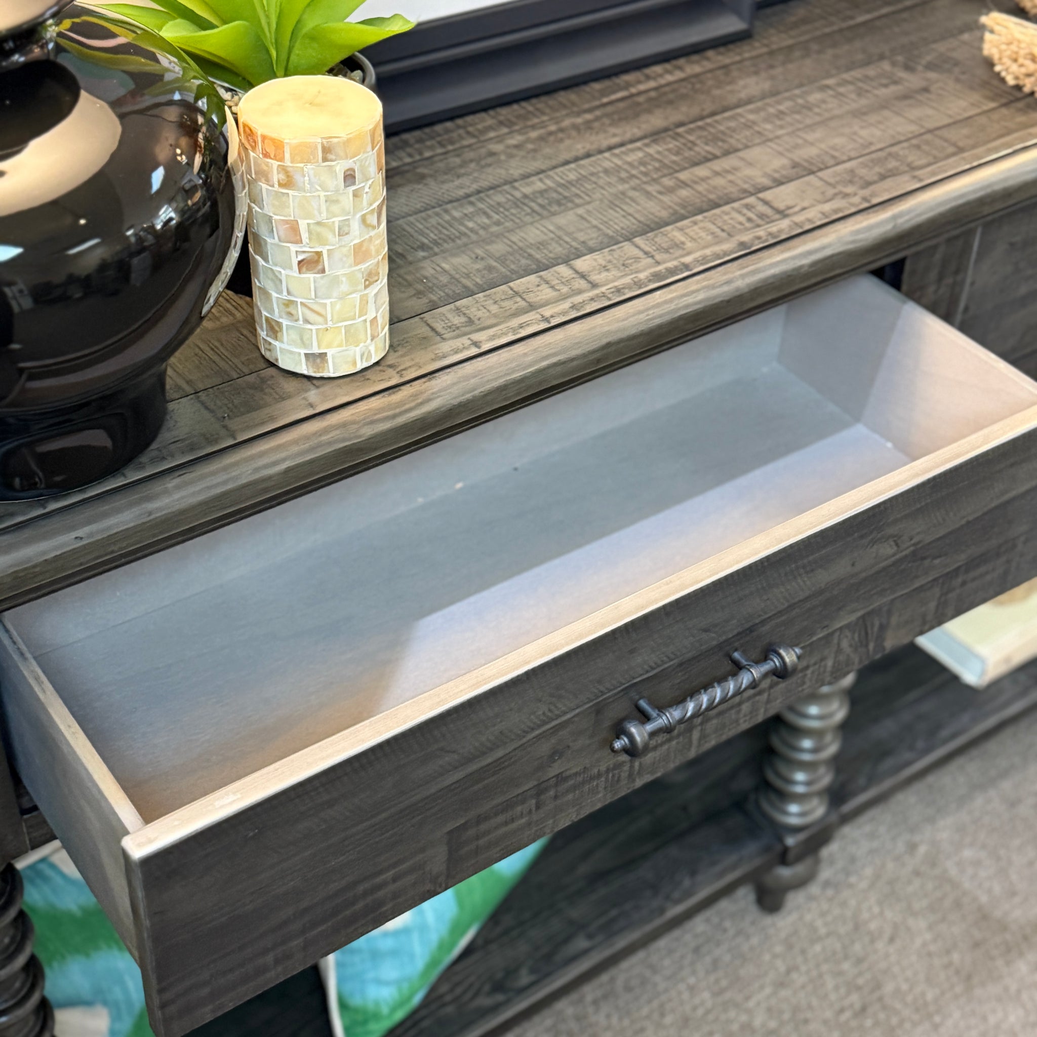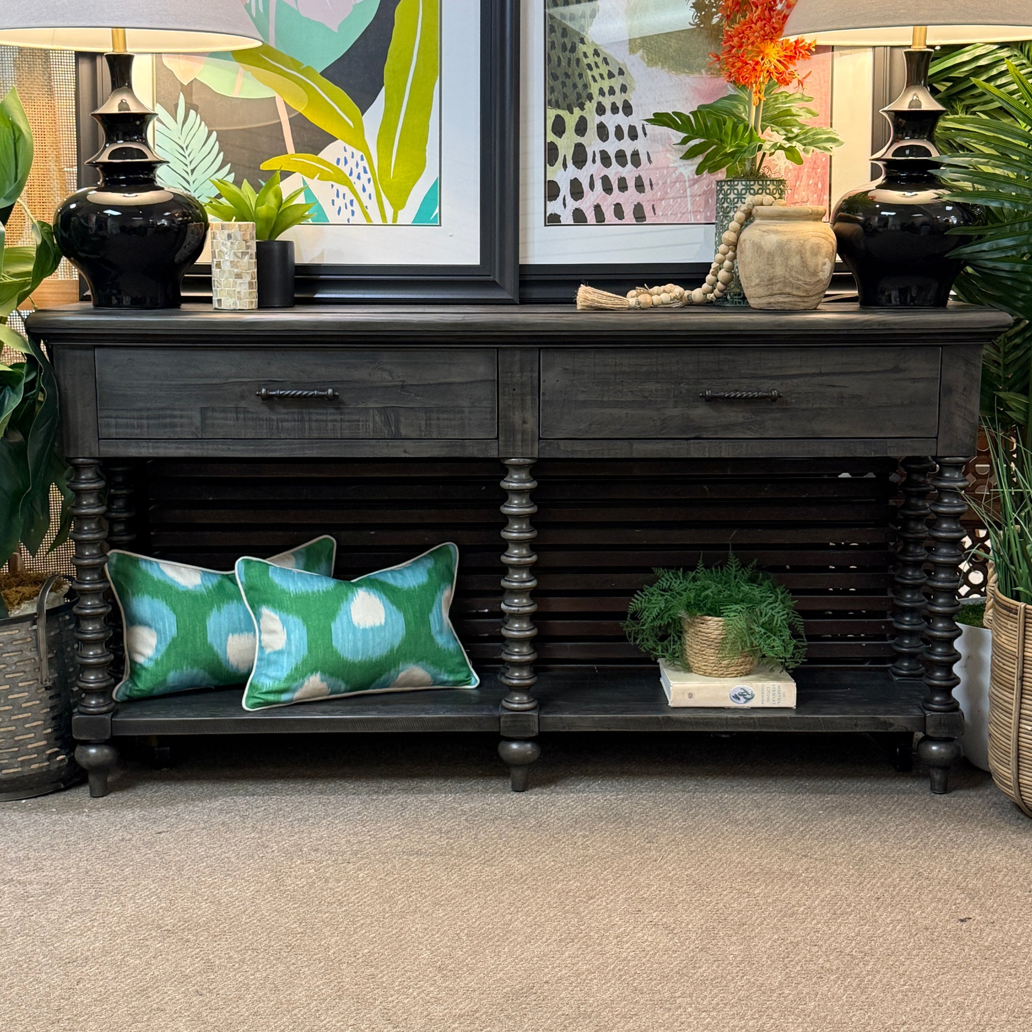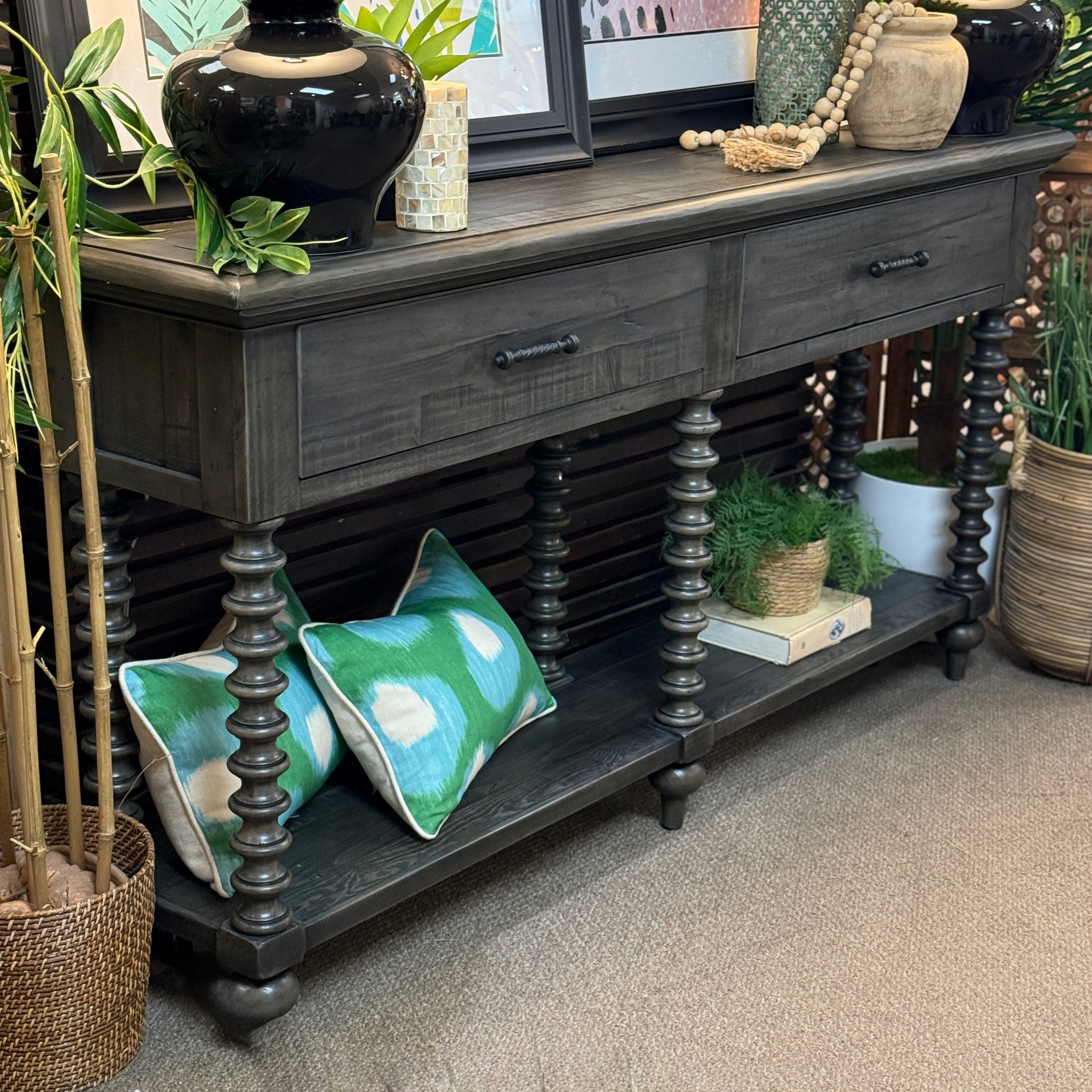 Elevate your space with this handsome console. Features two drawers with metal pulls, spindle legs, and a dark grey brown finish. Brand new!