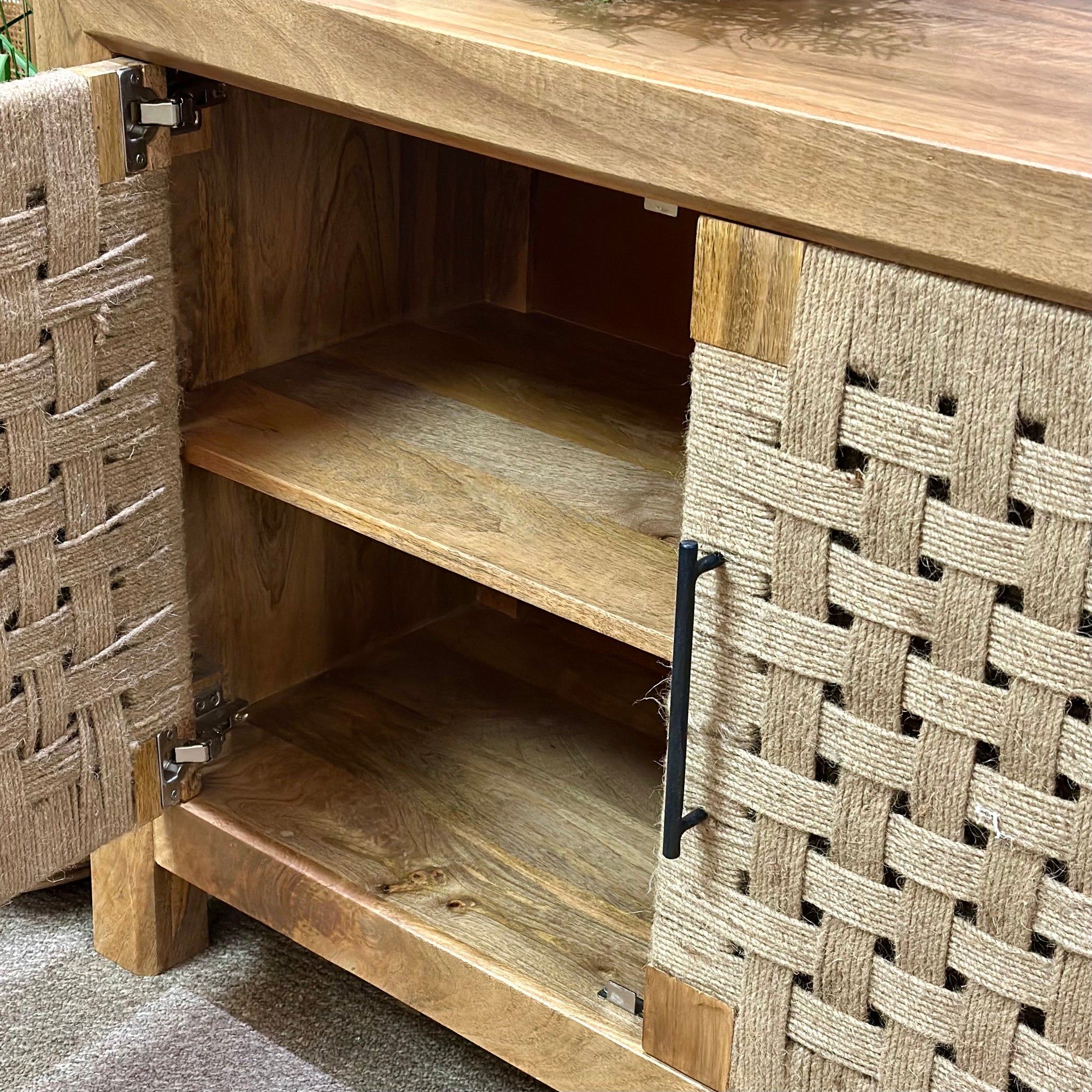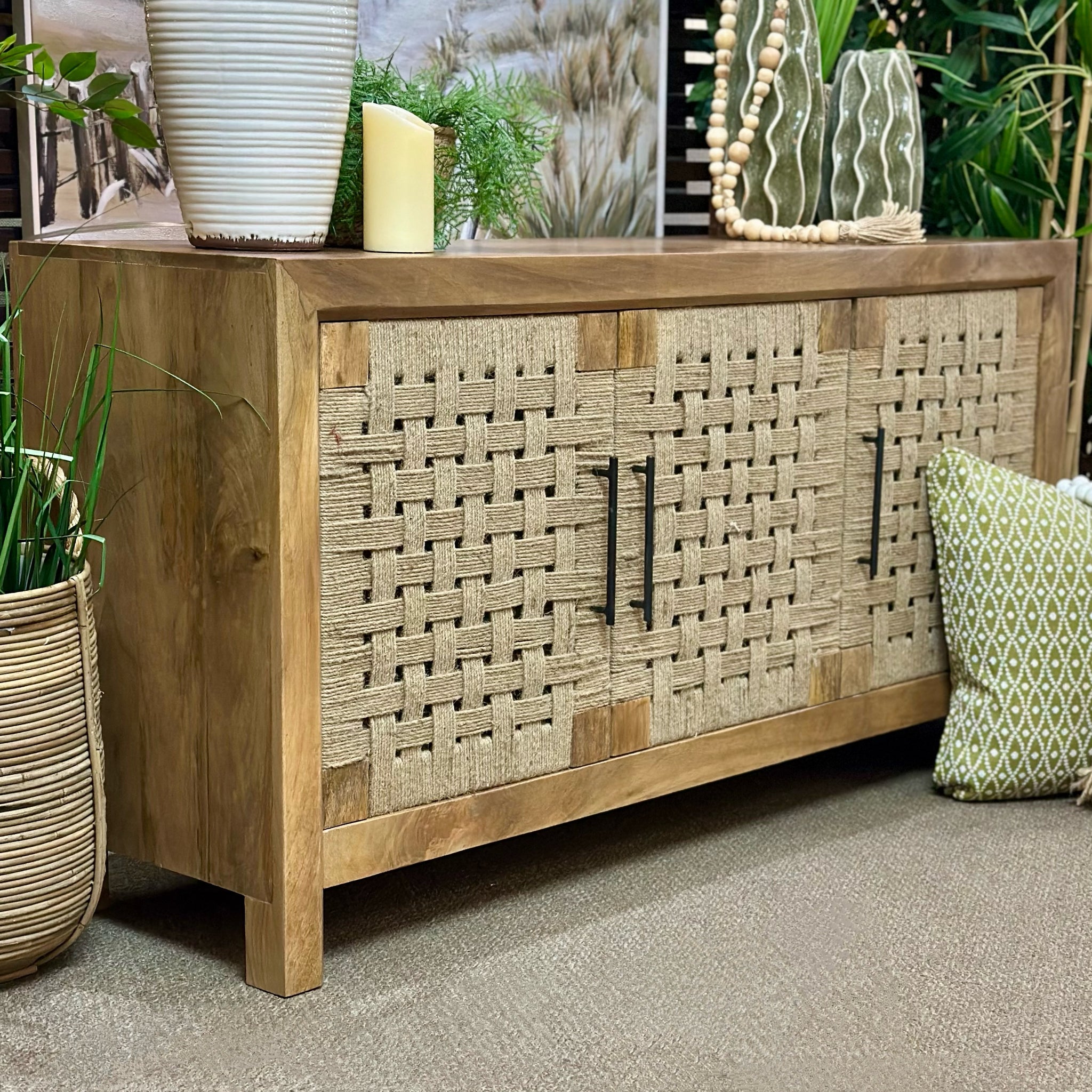 Elevate your entryway or living room with this handsome cabinet. Features three doors with woven rope fronts and a warm wood finish.Brand new!