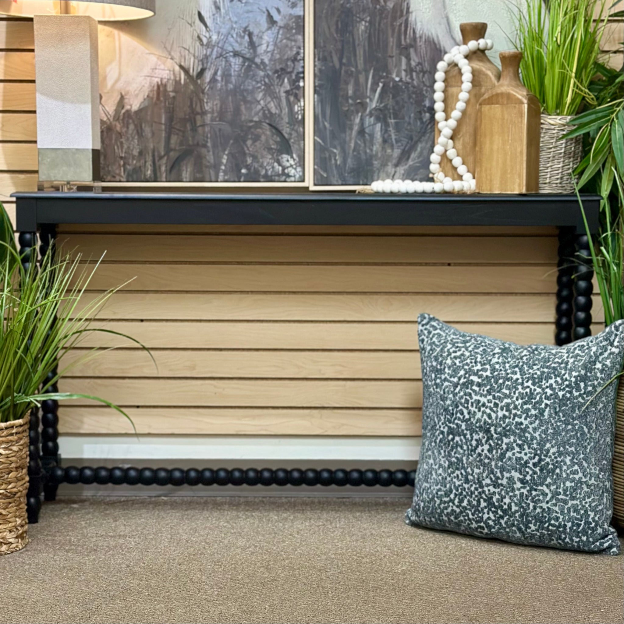 Handsome spindle leg console with rubbed black finish. Brand new!