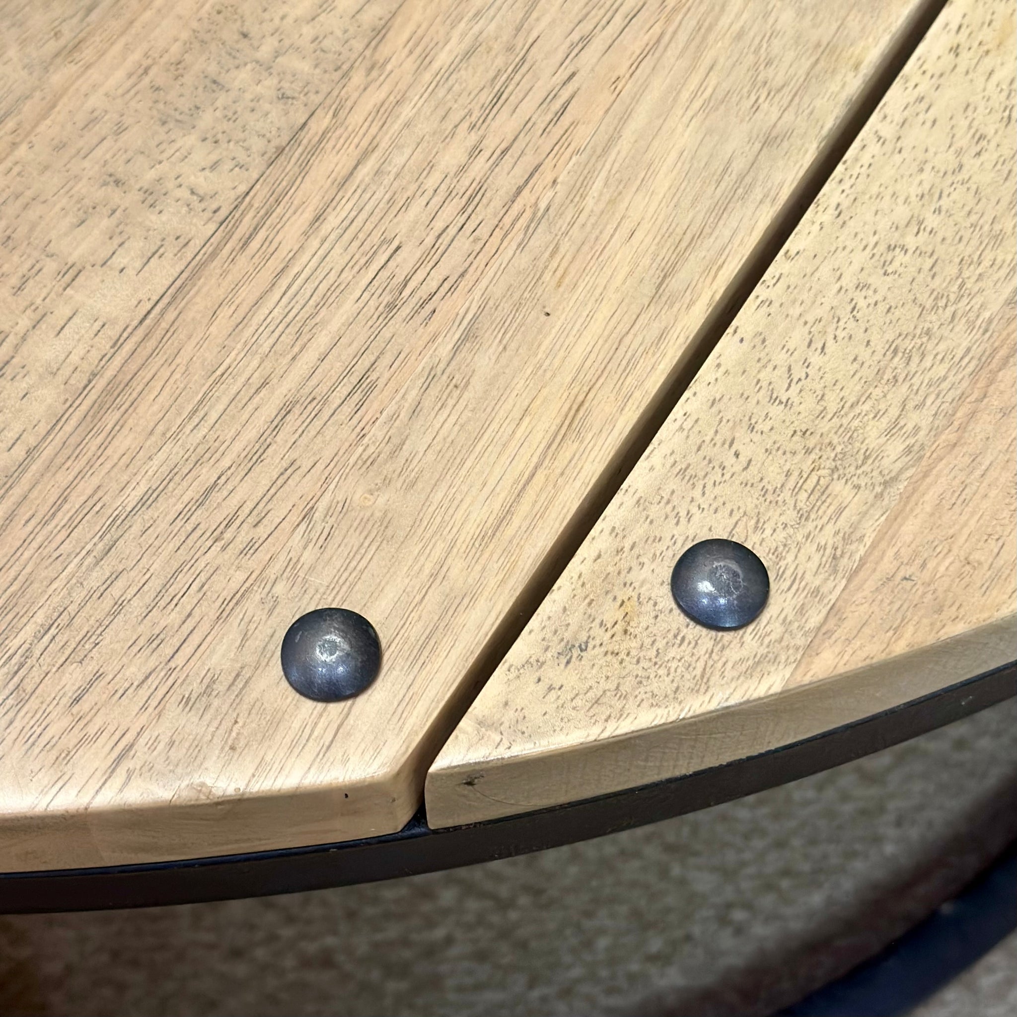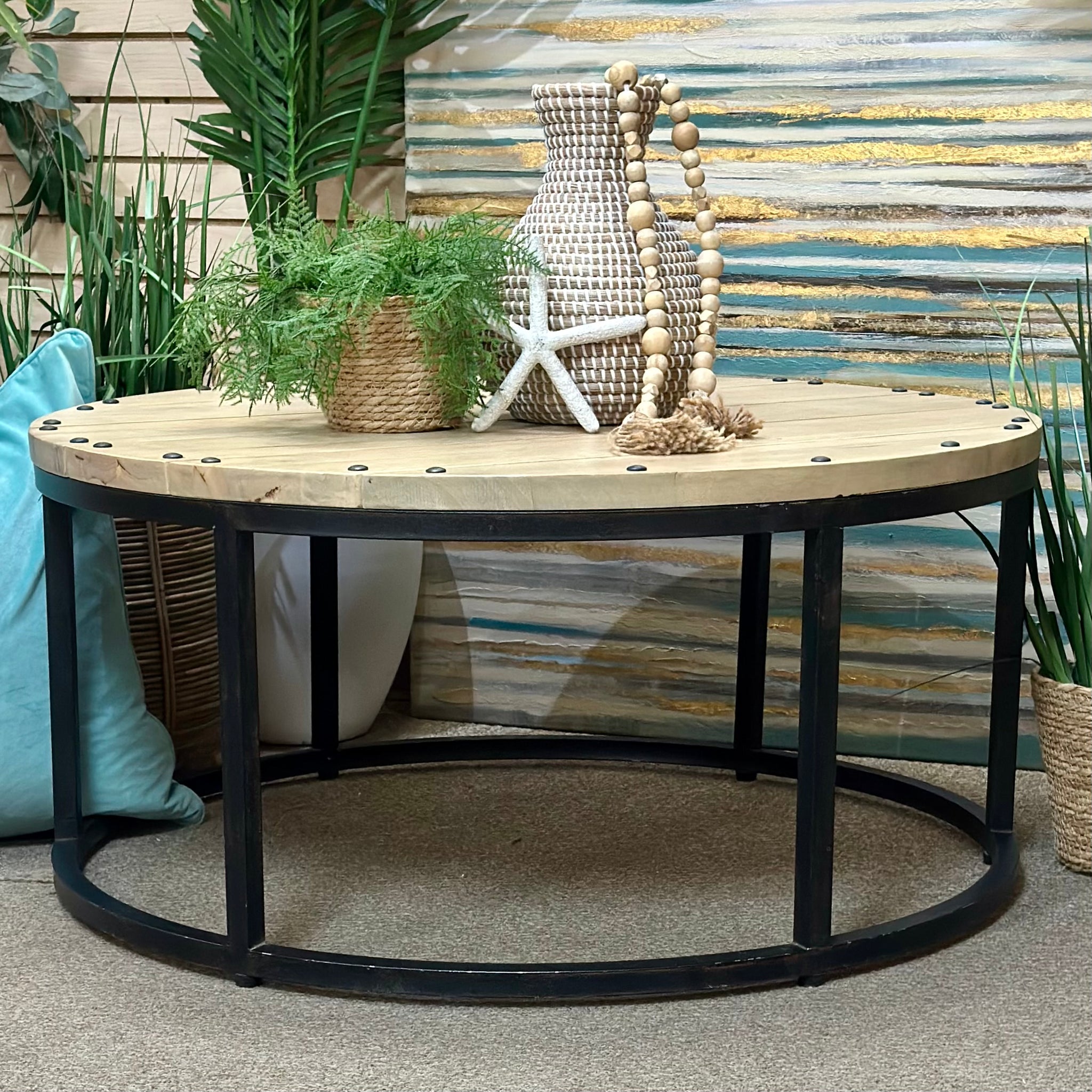 Farmhouse style coffee table from quality manufacturer Bramble. Features plank wood in a natural wood finish with nailhead trim and black metal base. On consignment and in great condition. Retails $900+, our price less!