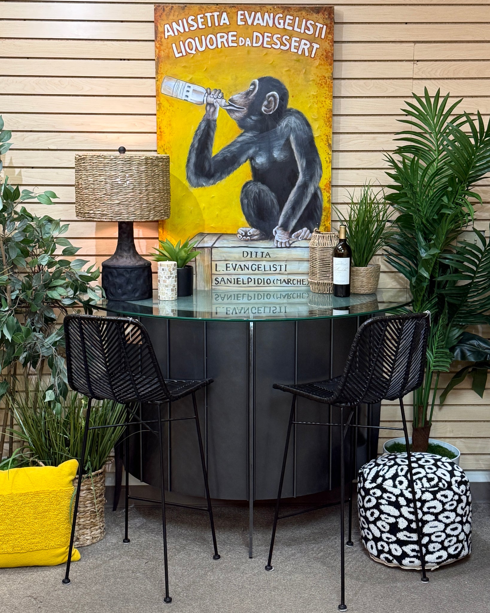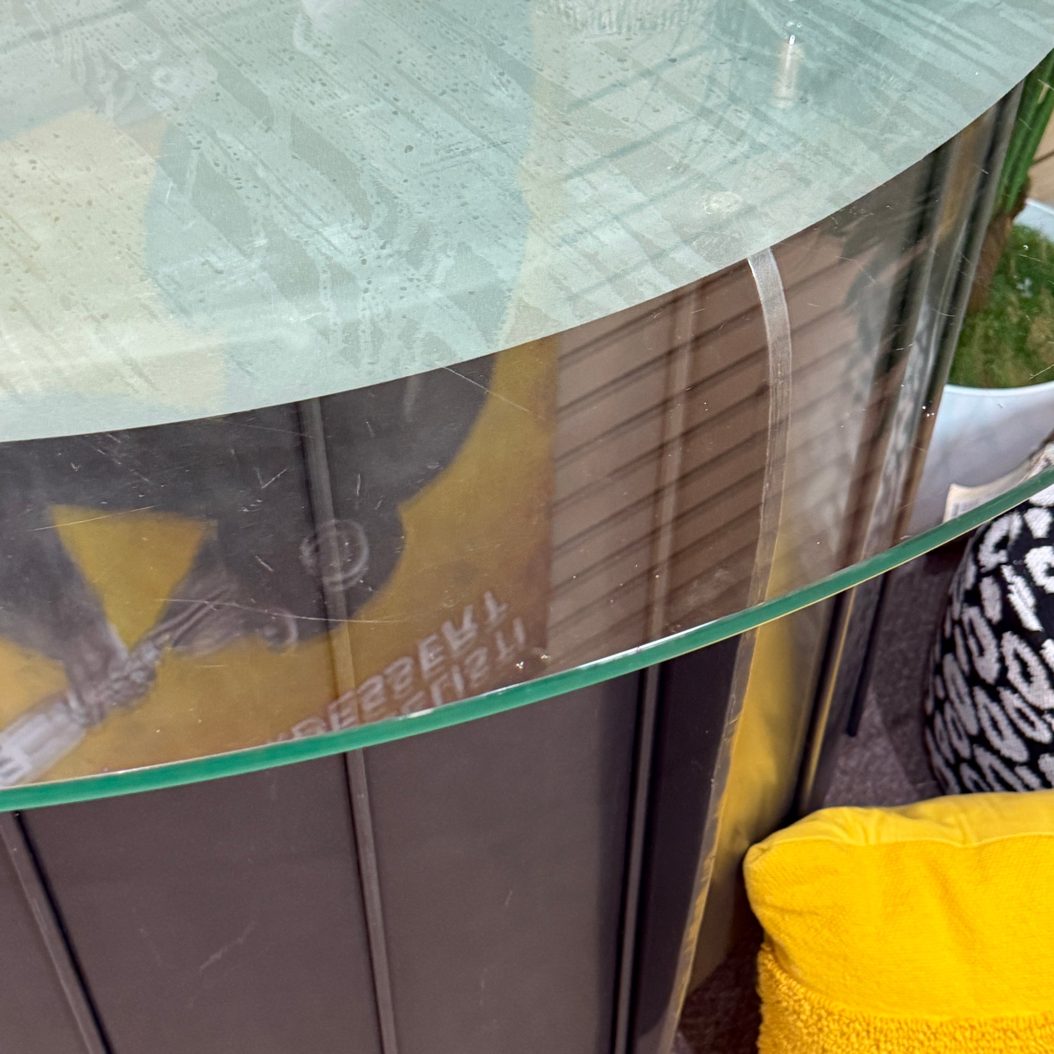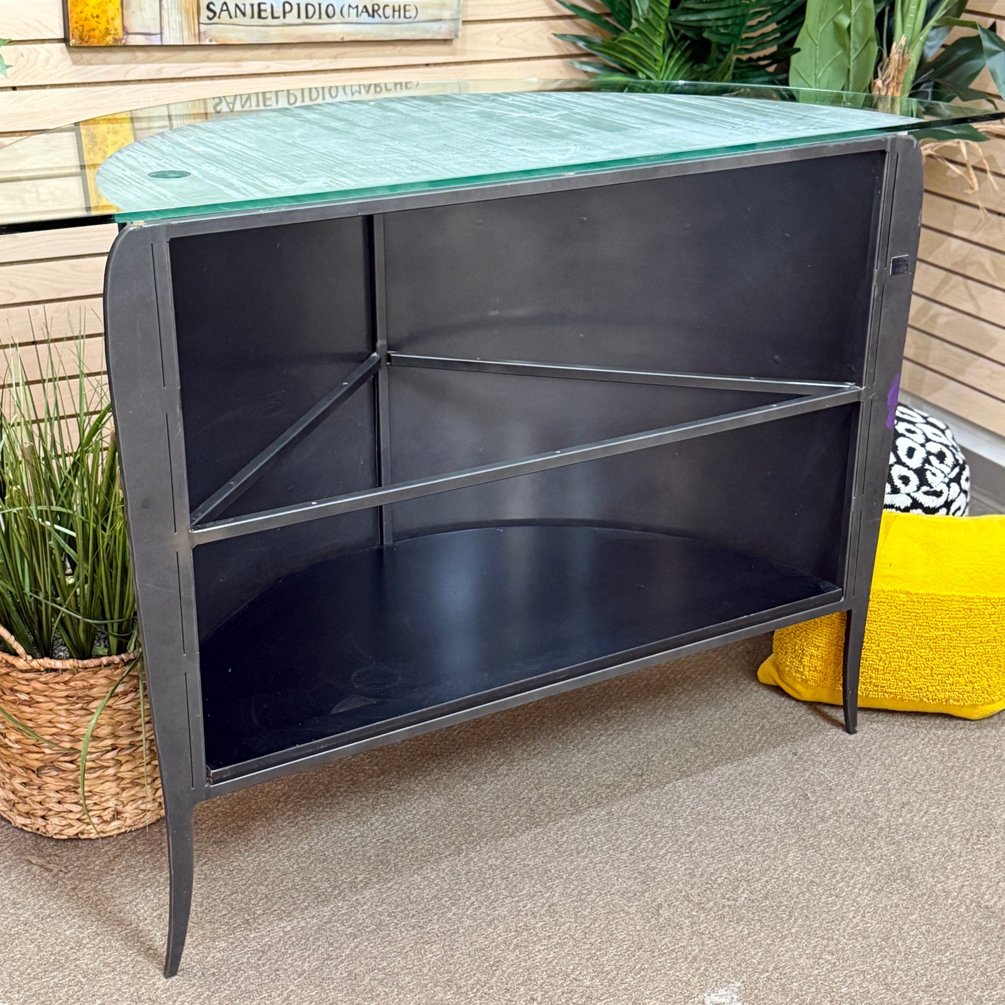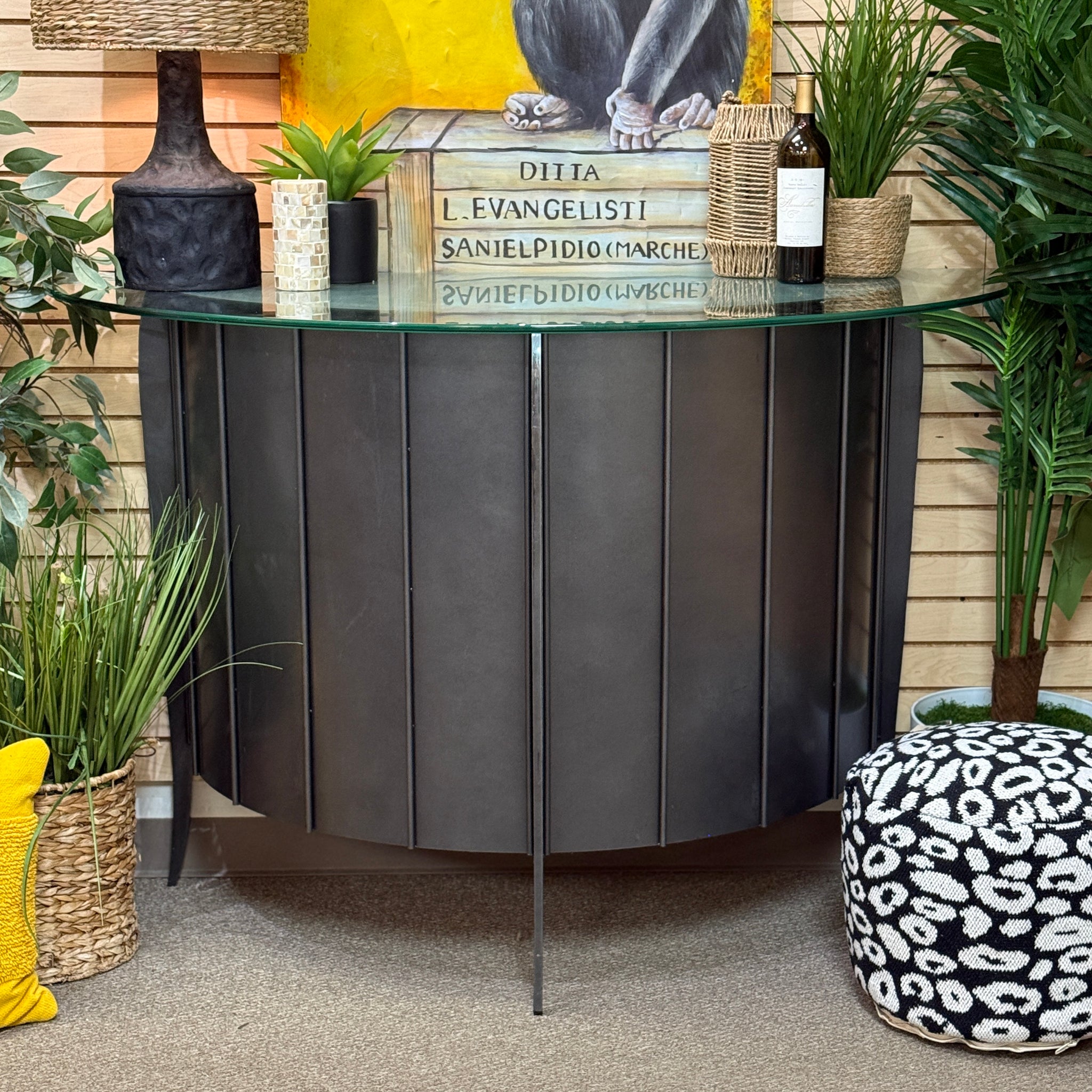 Use this handsome demilune as a console or a bar. Features a glass top and metal design. In great condition.