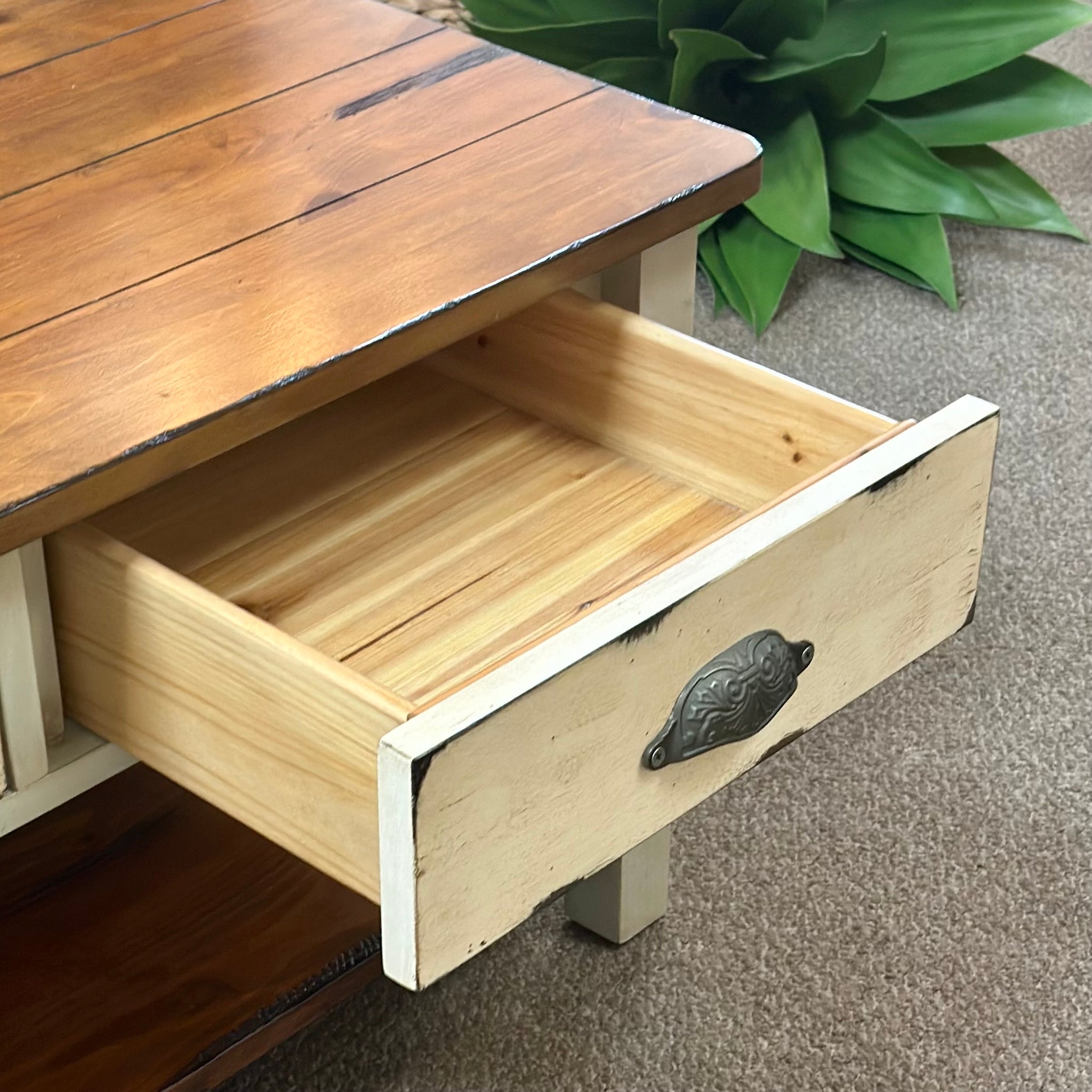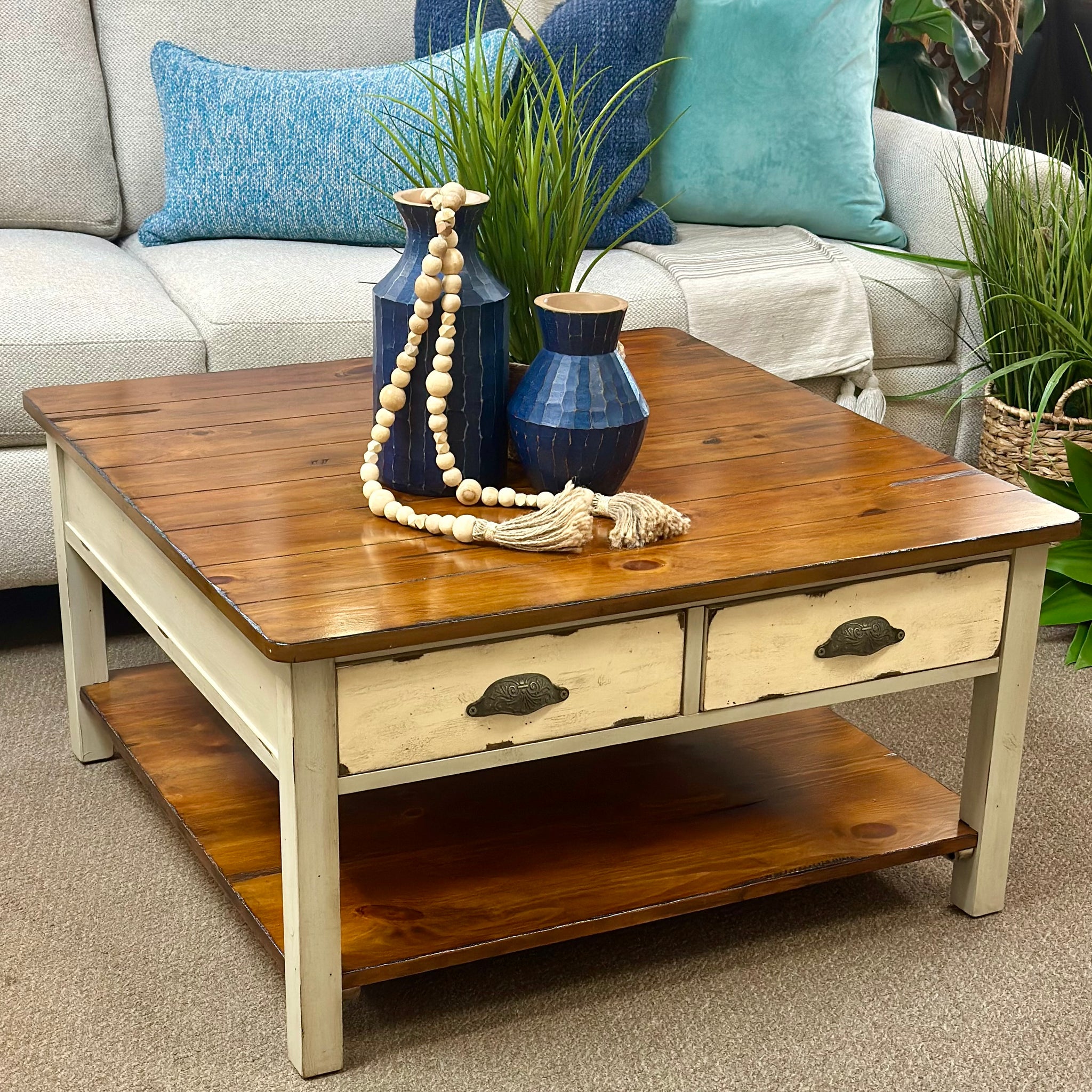 Cottage style coffee table in an antique ivory finish and warm wood top. Features two drawers for storage and elegant hardware. On consignment and in great condition!