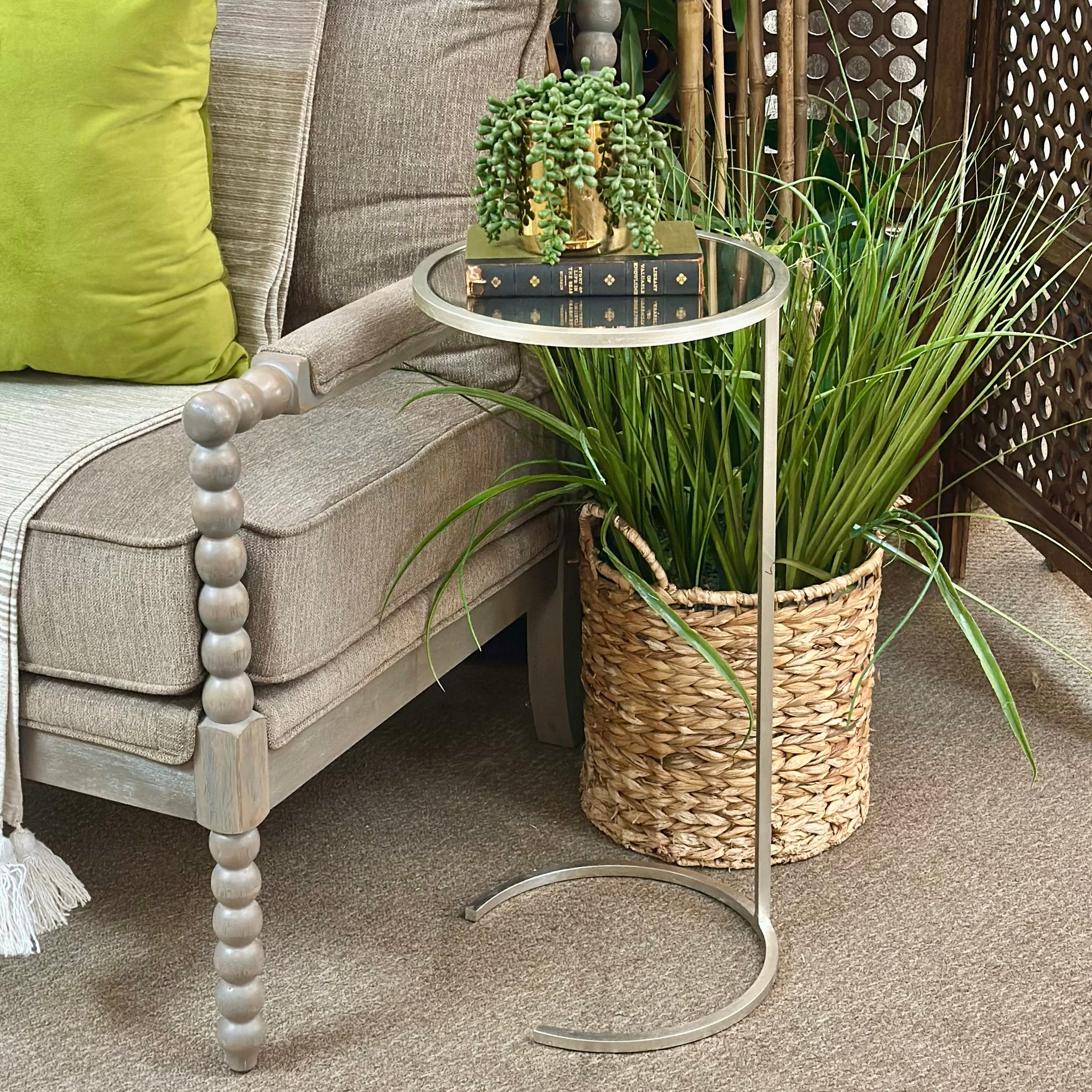 Silver finish drink table with a mirrored top. On consignment and in great condition!
