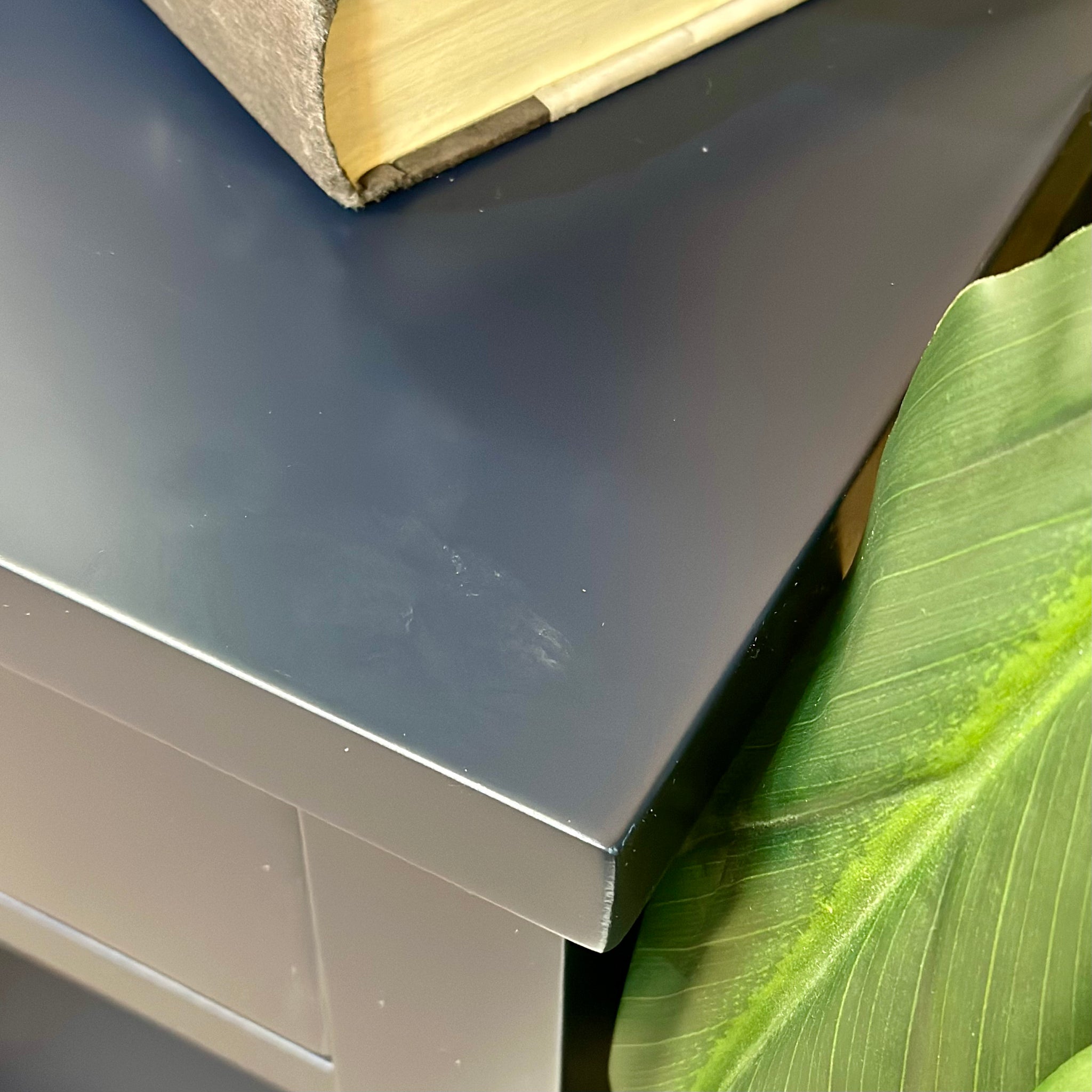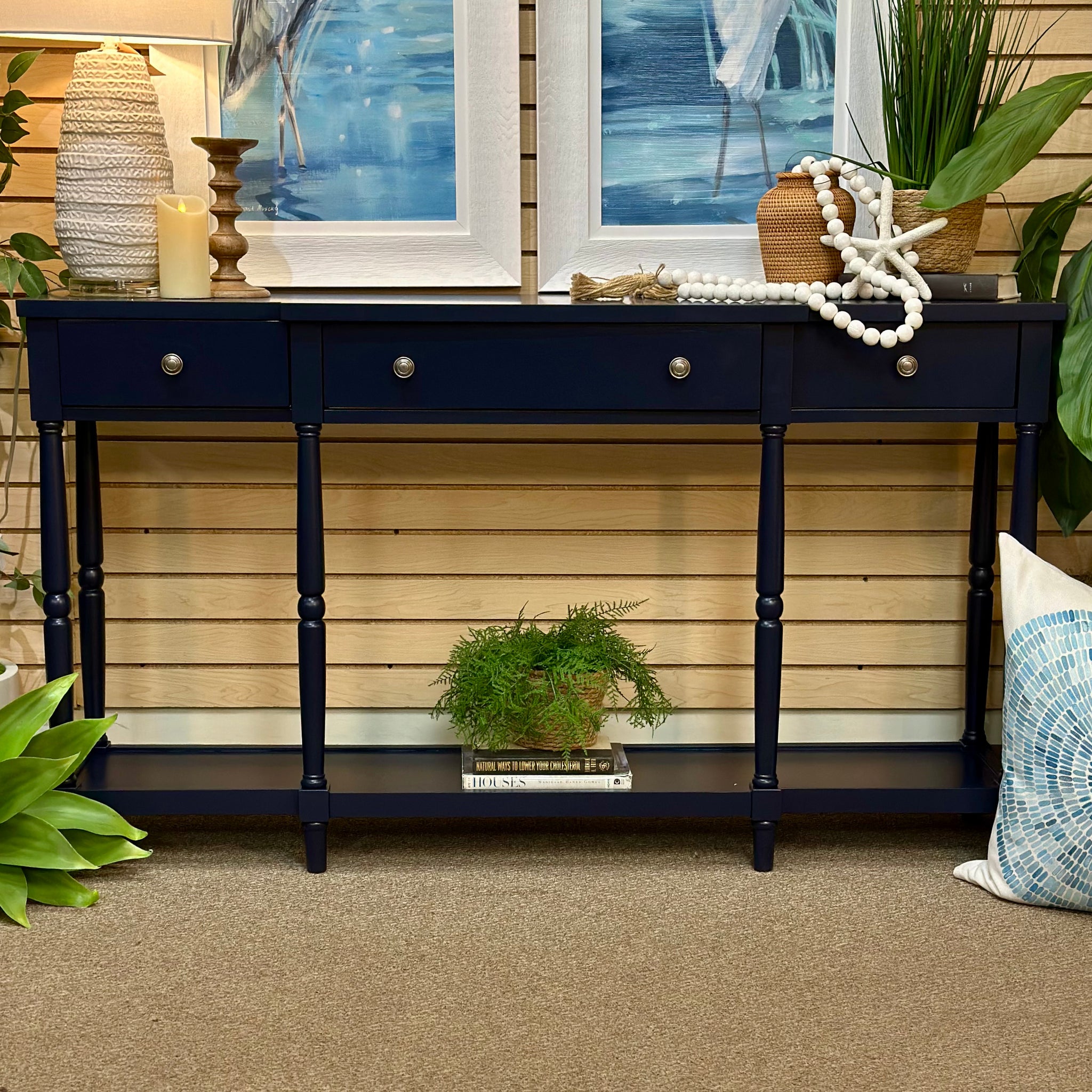 A statement console for any space! Transitional style console in a navy blue painted finish with 3 drawers and poster legs. Brand new!