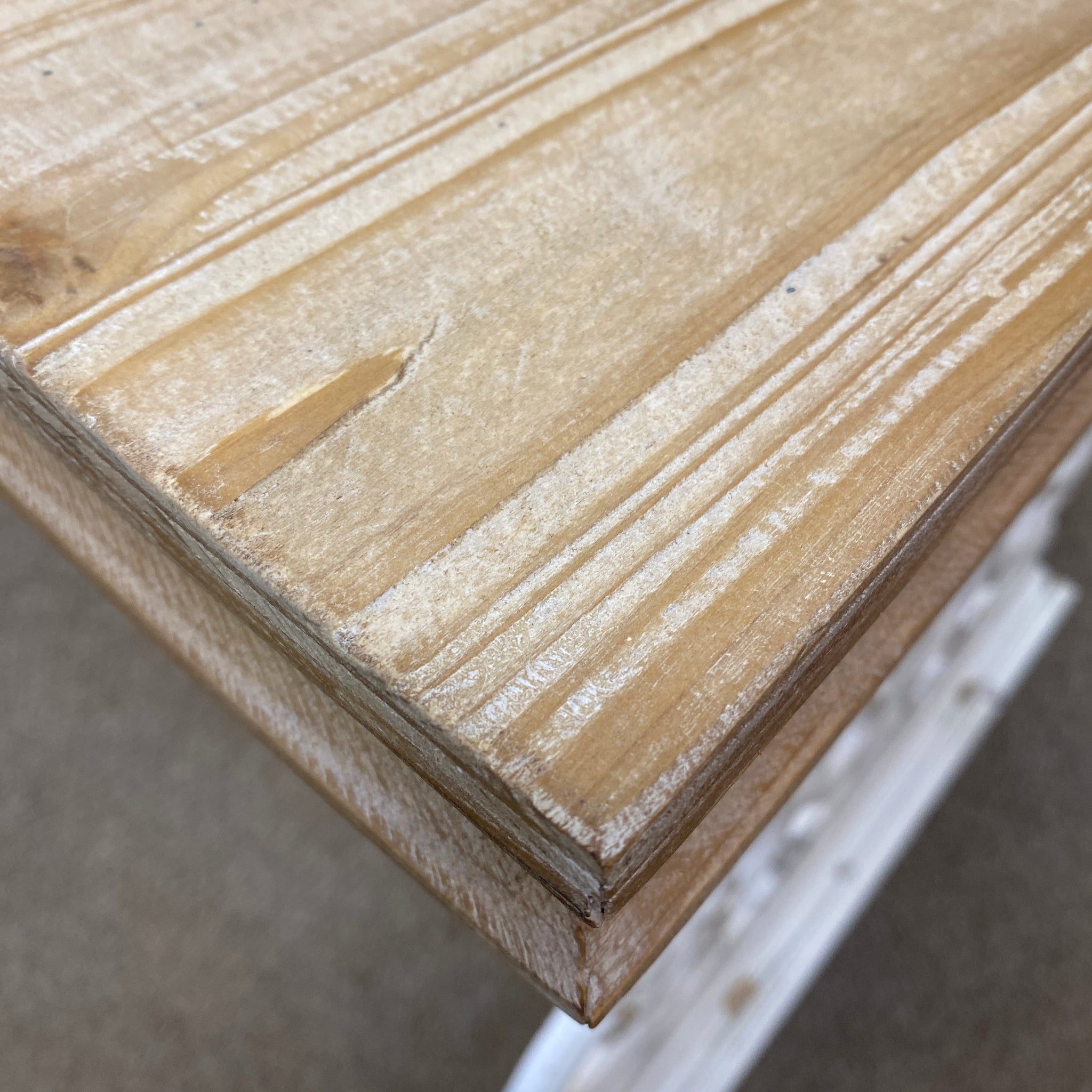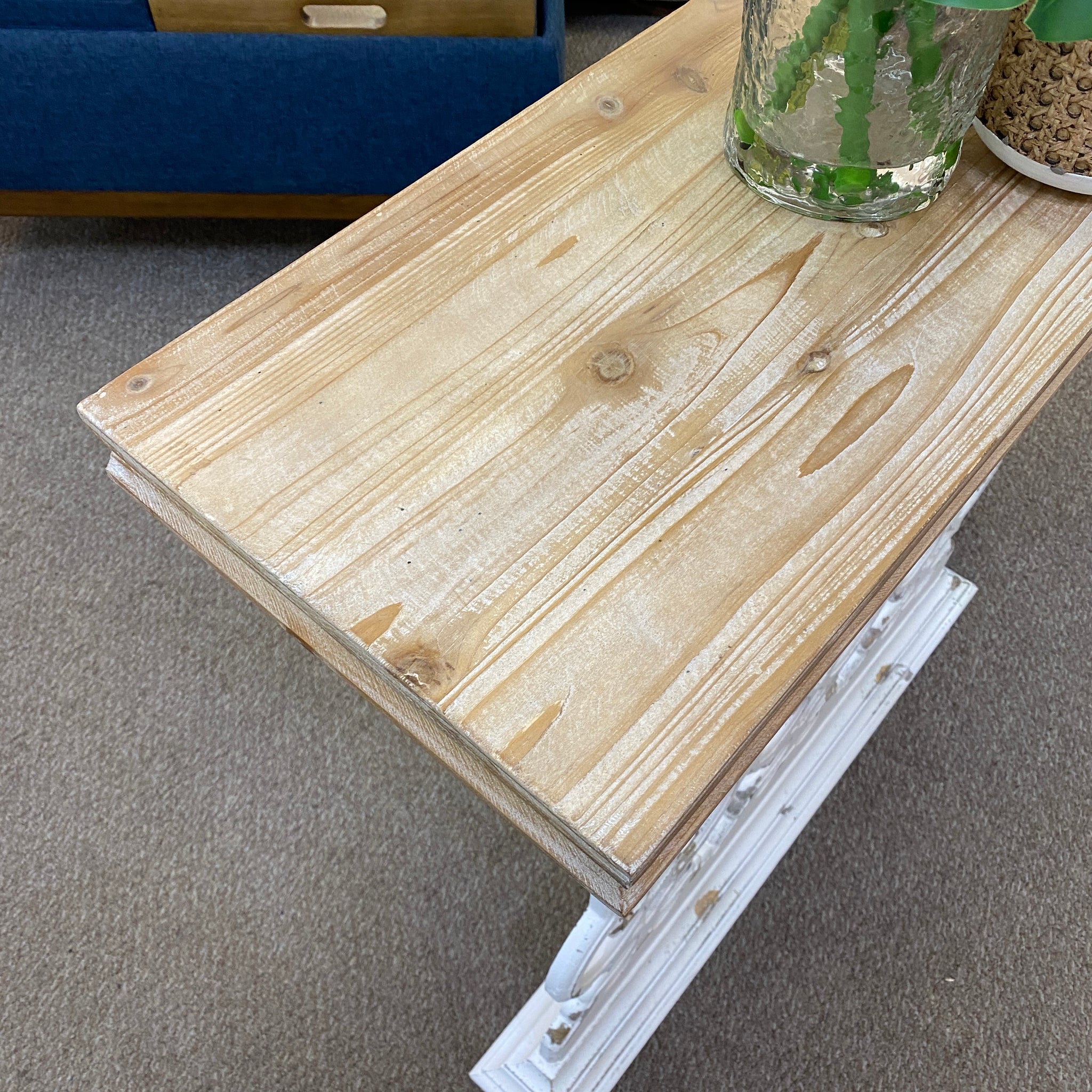 Great for small spaces, this distressed white console can be mounted to the wall for extra support. Featuring a white washed base and a natural top. BRAND NEW.