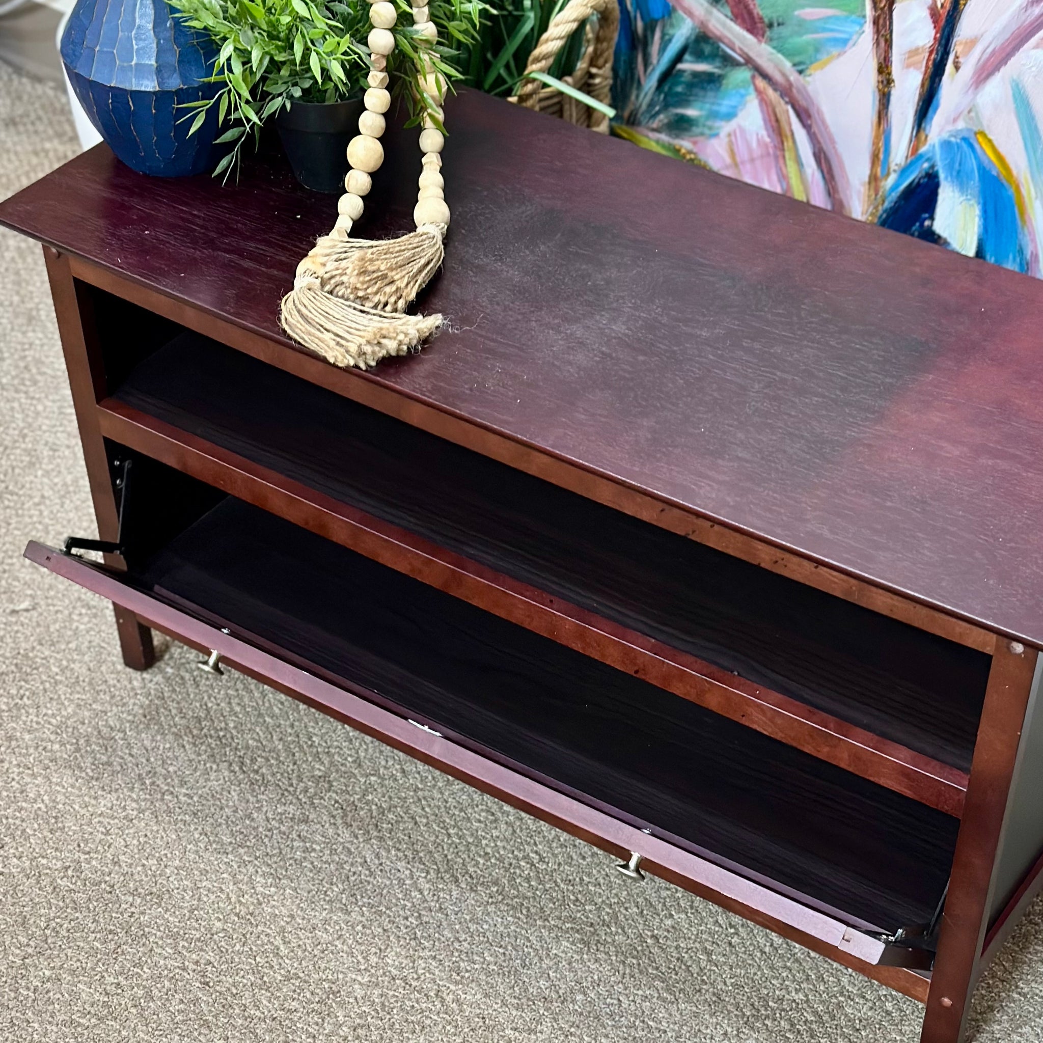Small and low wood cabinet in a cherry like finish. On consignment and in good condition!