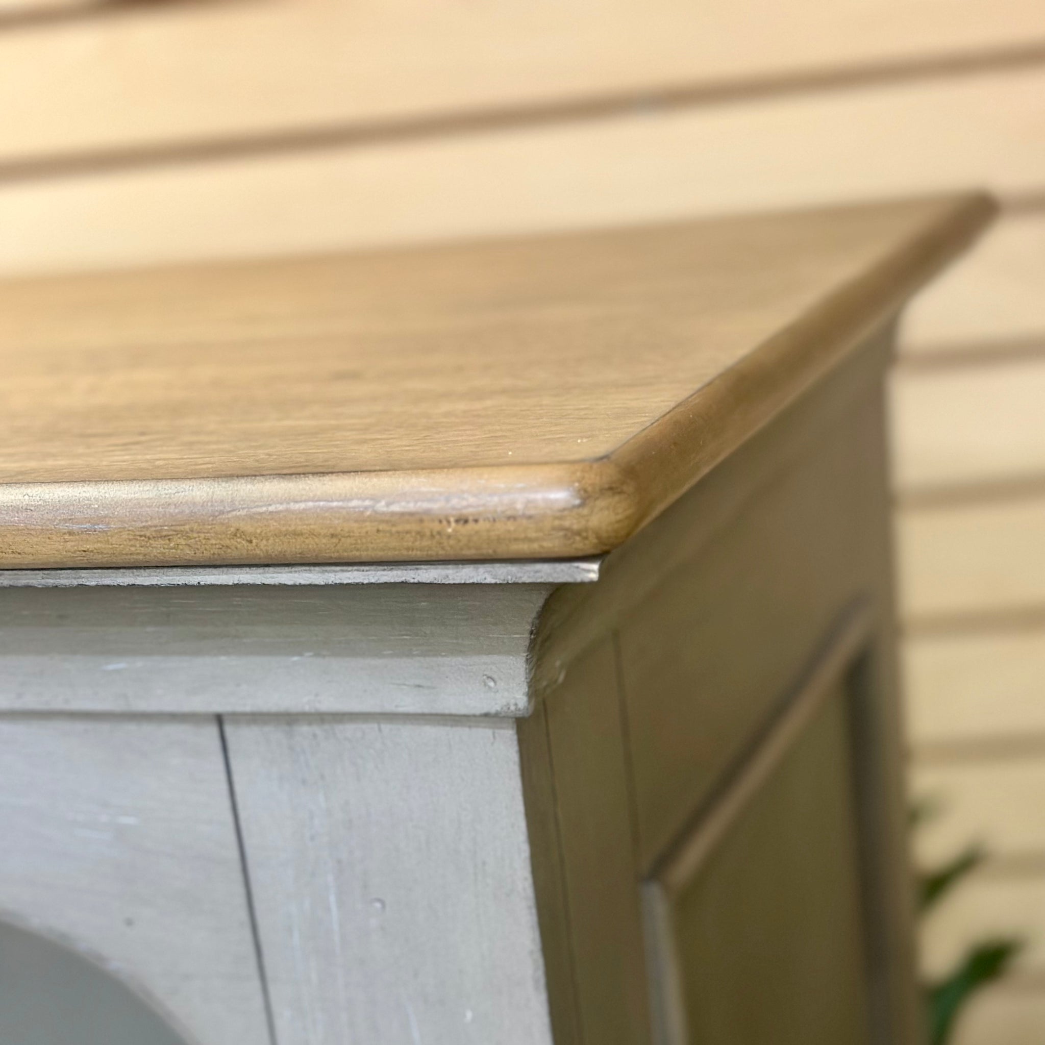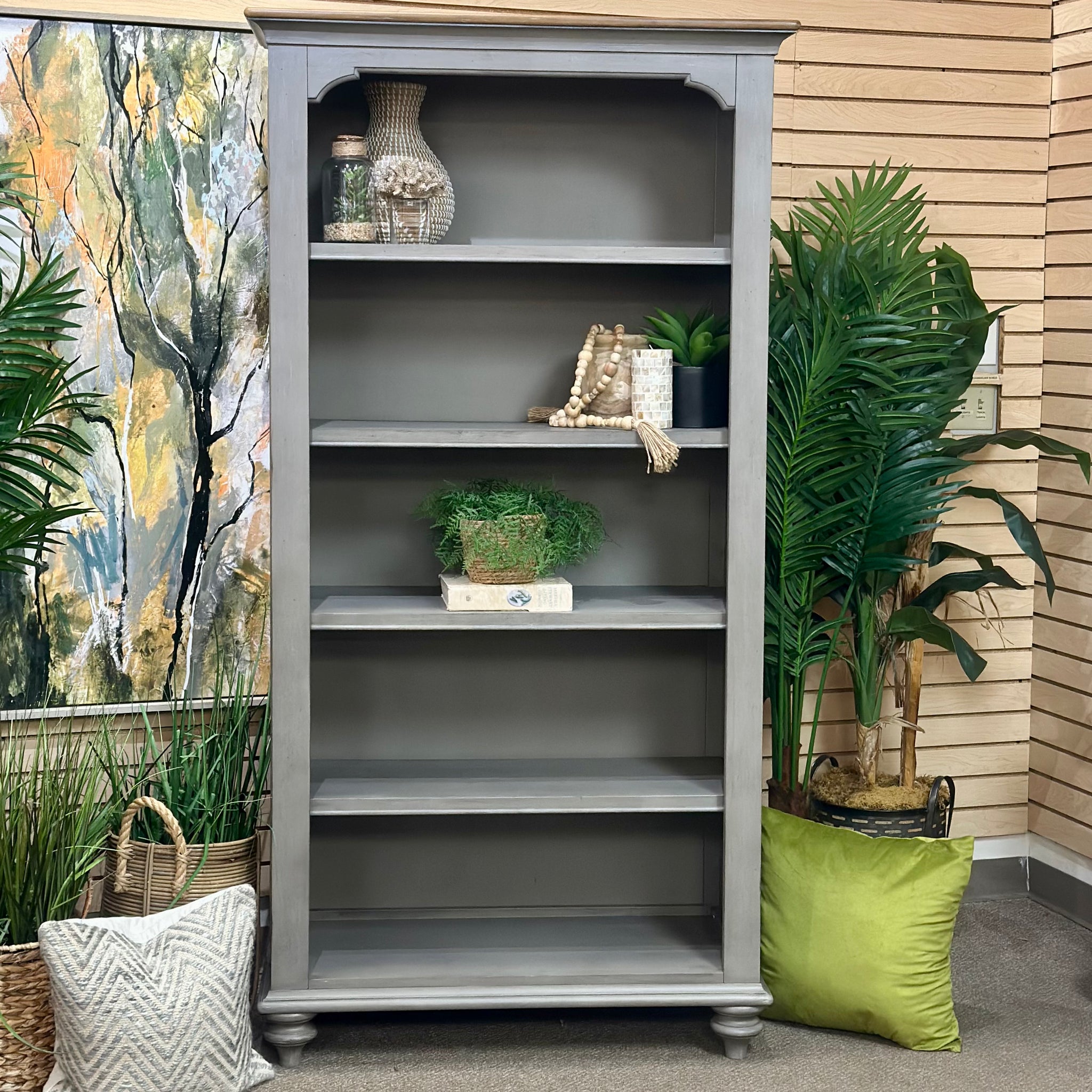 Elevate your home or office with this handsome bookcase. Features five shelves for plenty of storage, a wood tone top and grey finish. Brand new!