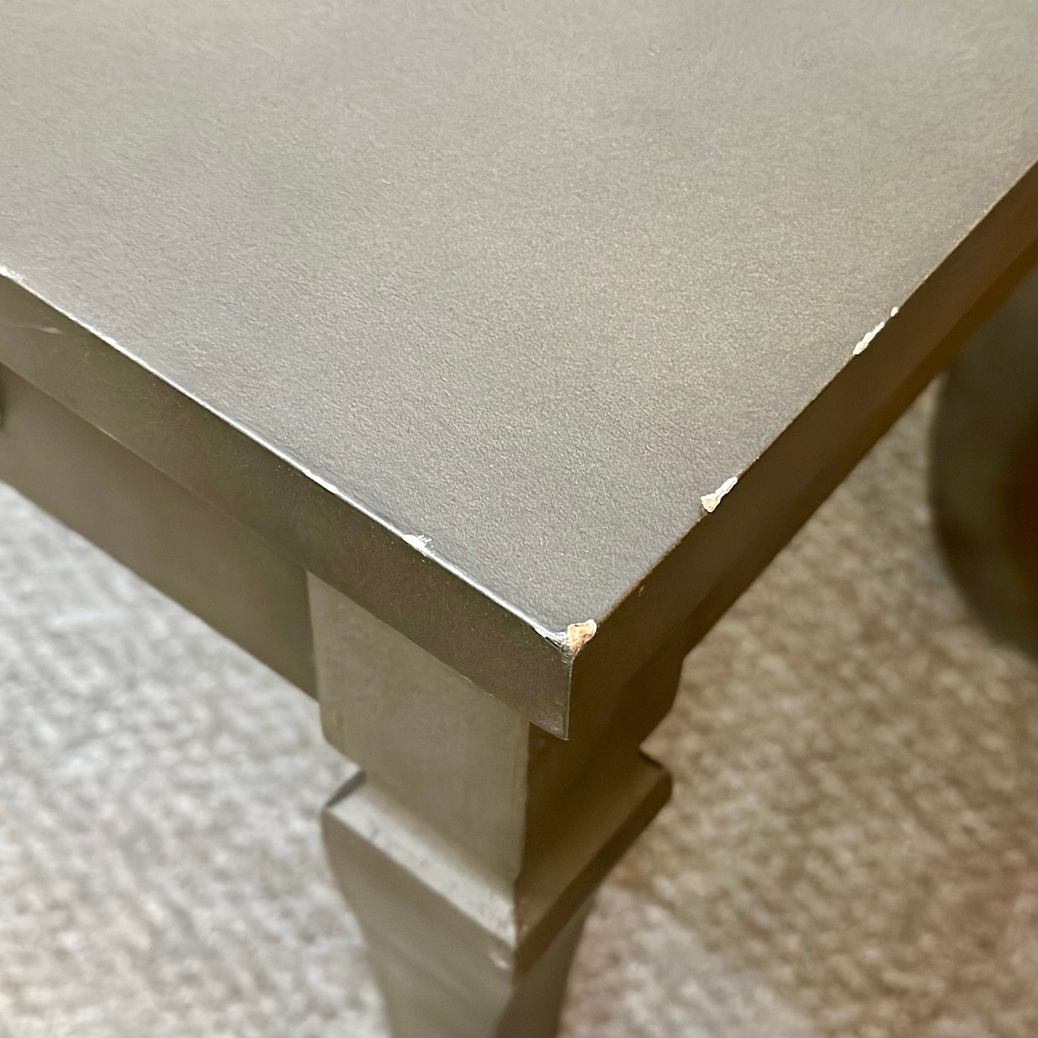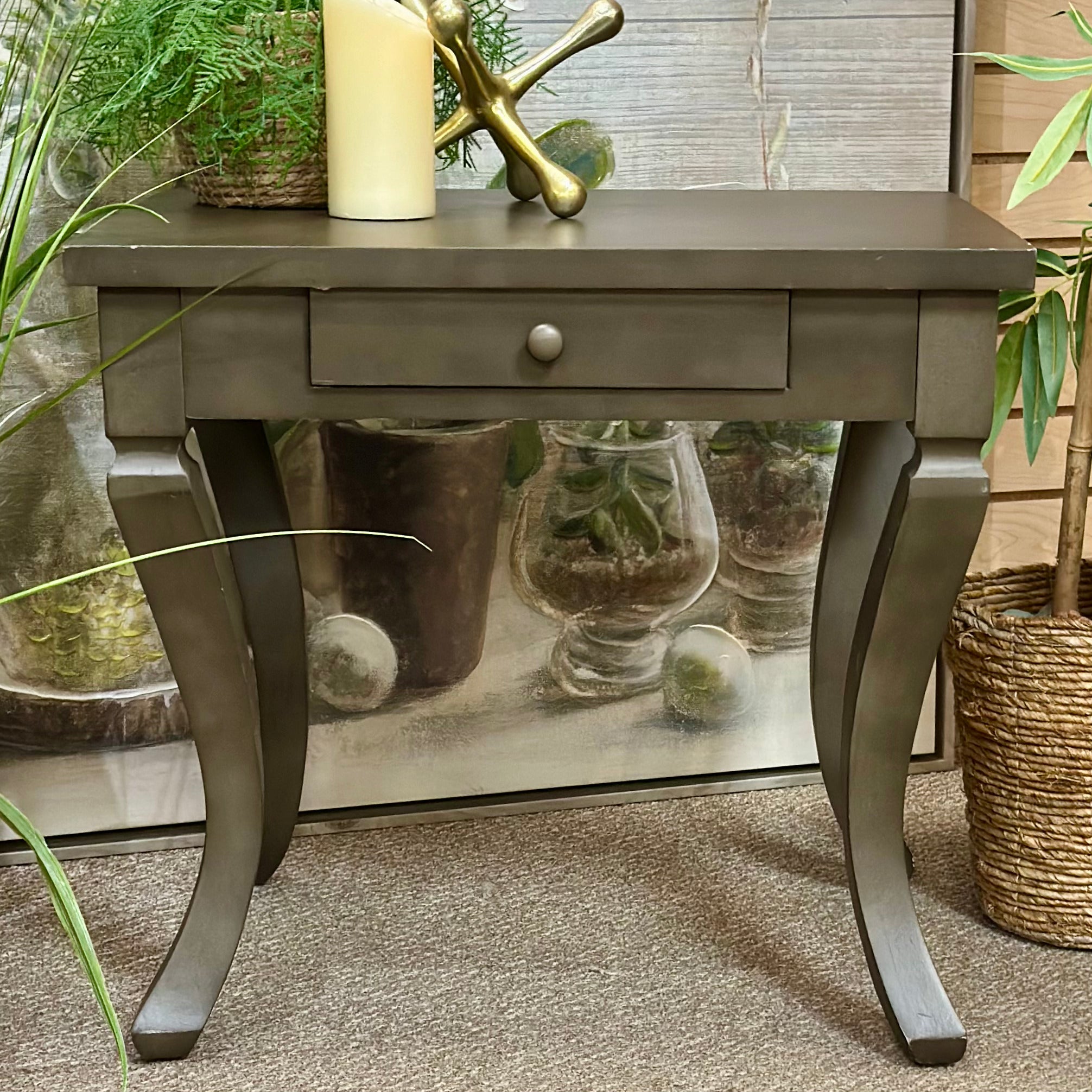 Add this side table to any space. Features curved legs, one drawer, and a smokey grey finish. In good condition with some finish blemishes, priced accordingly.