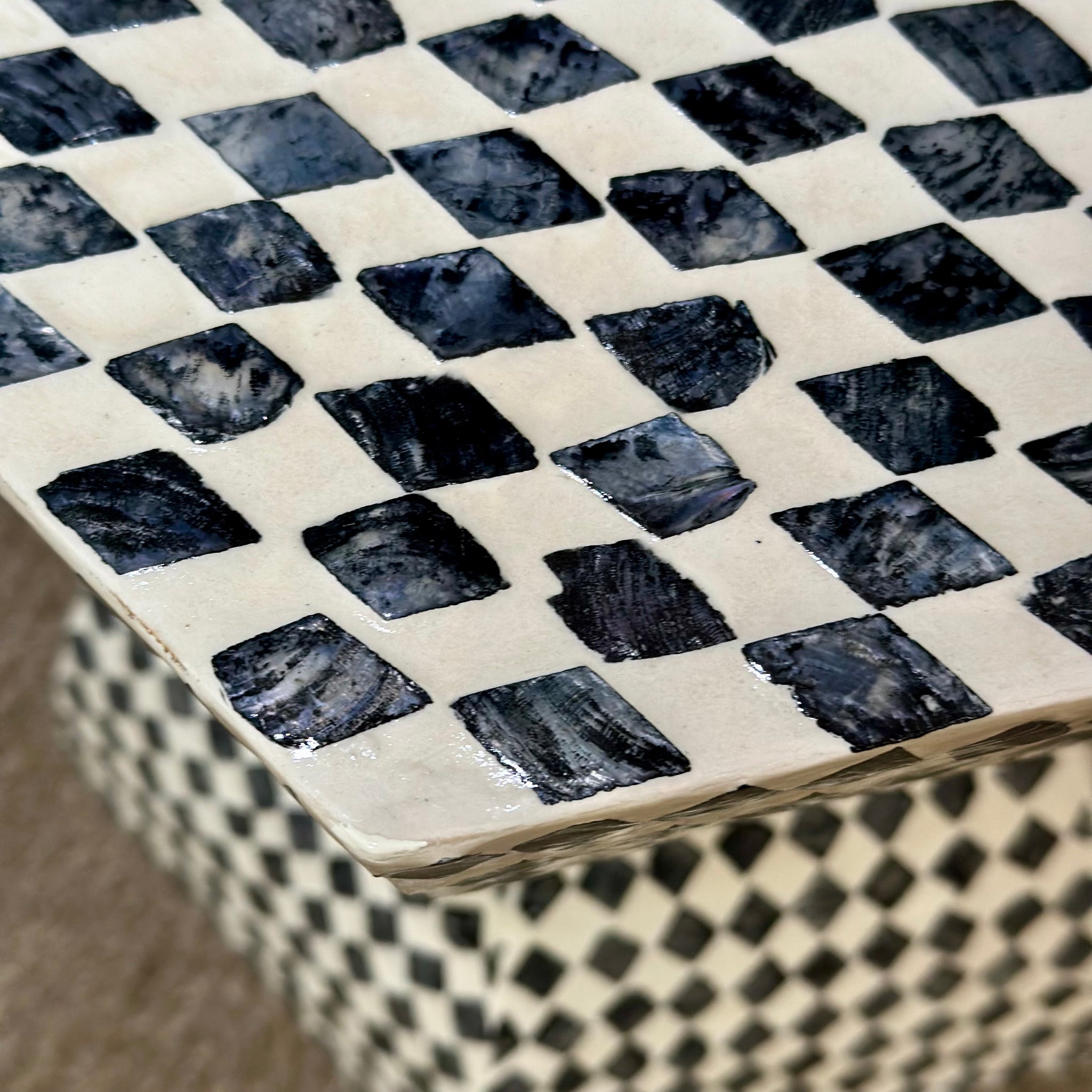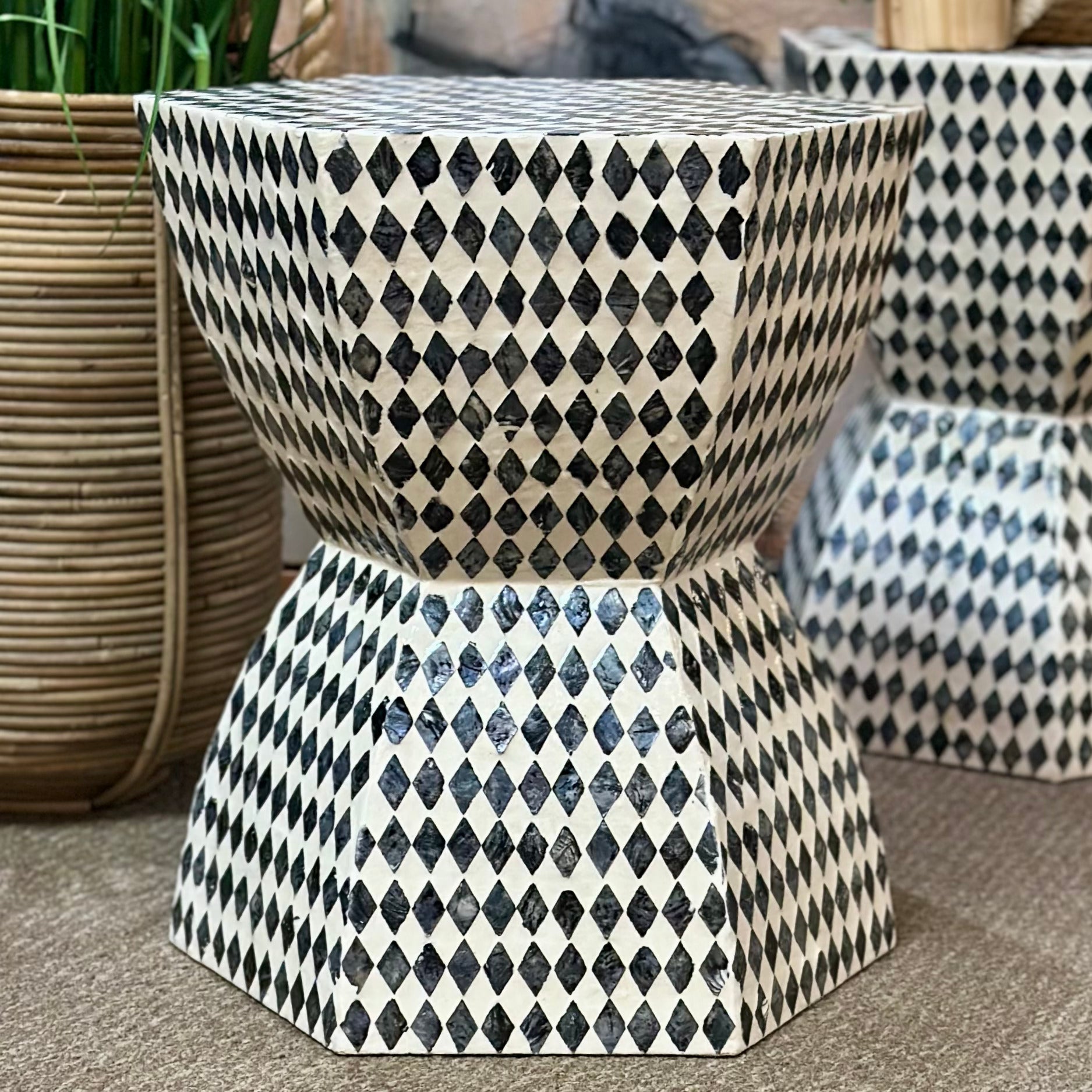 The hexagonal structure of this pedestal stool features black and white patterning and Capiz inlay. Beautiful and brand new!