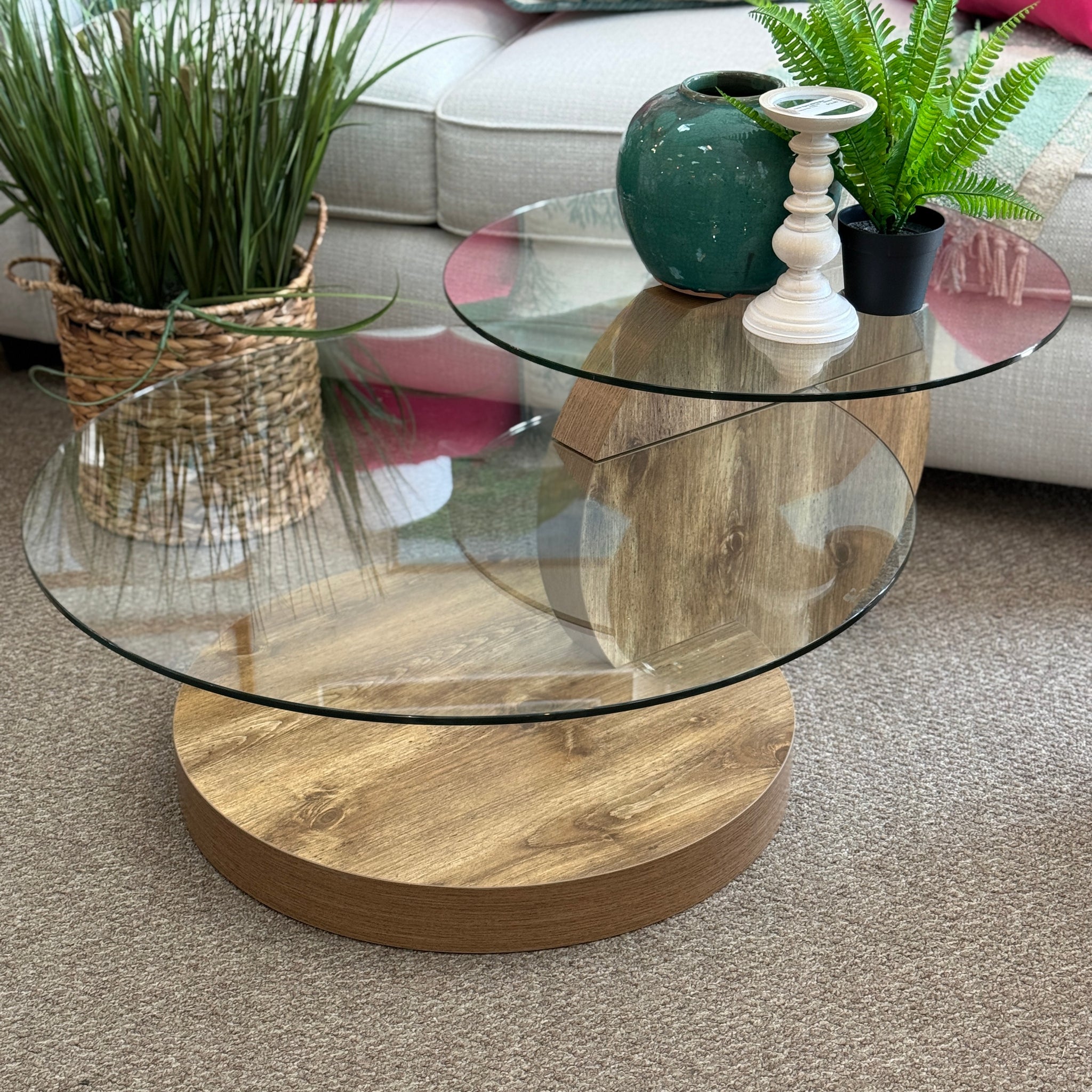 Elevate your living room with this handsome coffee table. Features a modern look, 2 tier glass tops and wooden bases. In great condition.