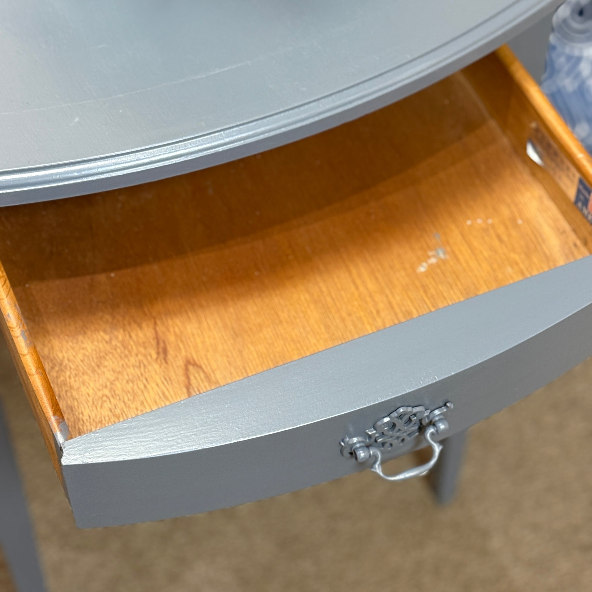 Traditional flip-top table in a beautiful slate blue finish. Features one drawer and tapered legs