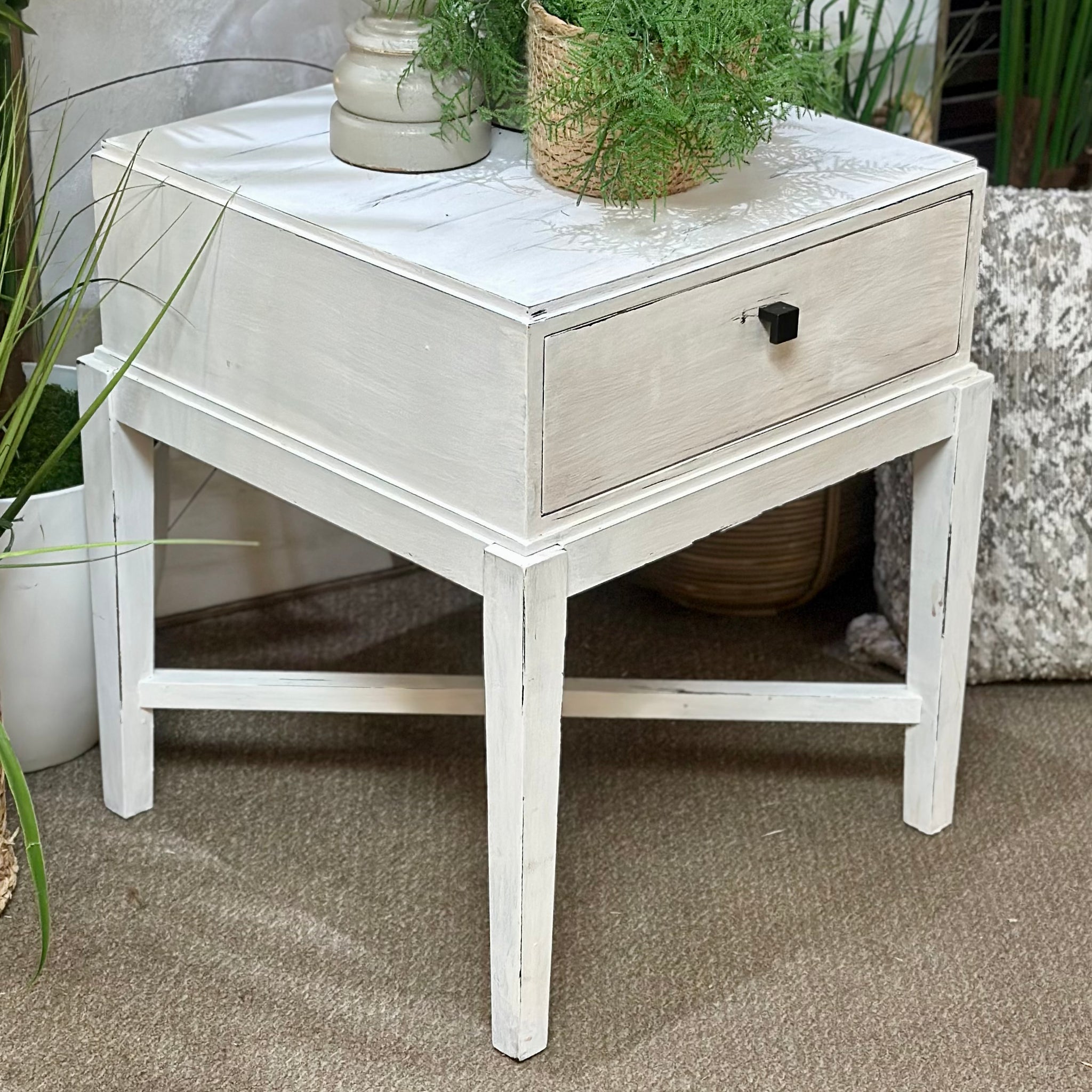 Cute one drawer end table with whitewash finish. On consignment and in great condition.