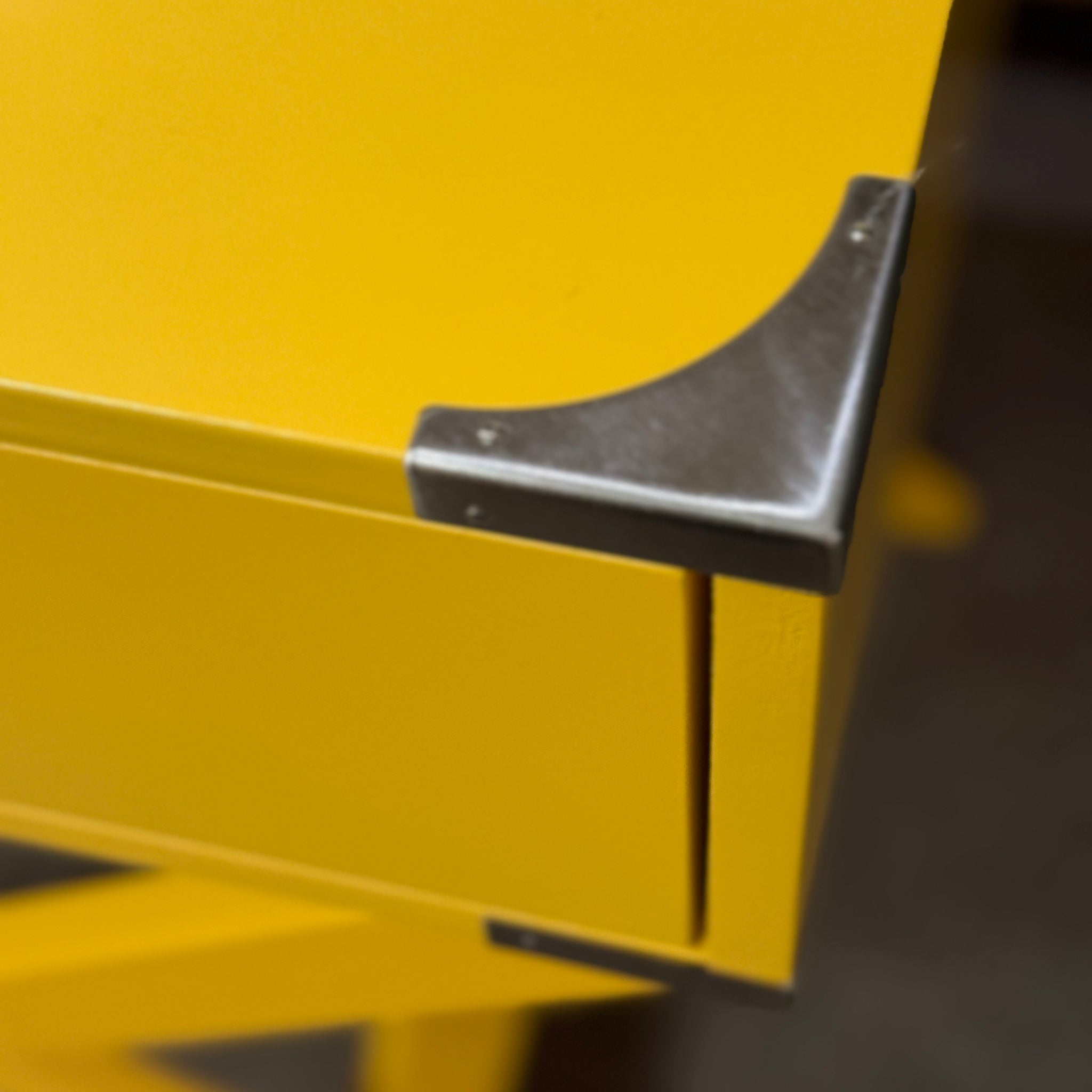 Add this cute side table to brighten any room. Features one drawer, an X base and silver hardware. In great condition.