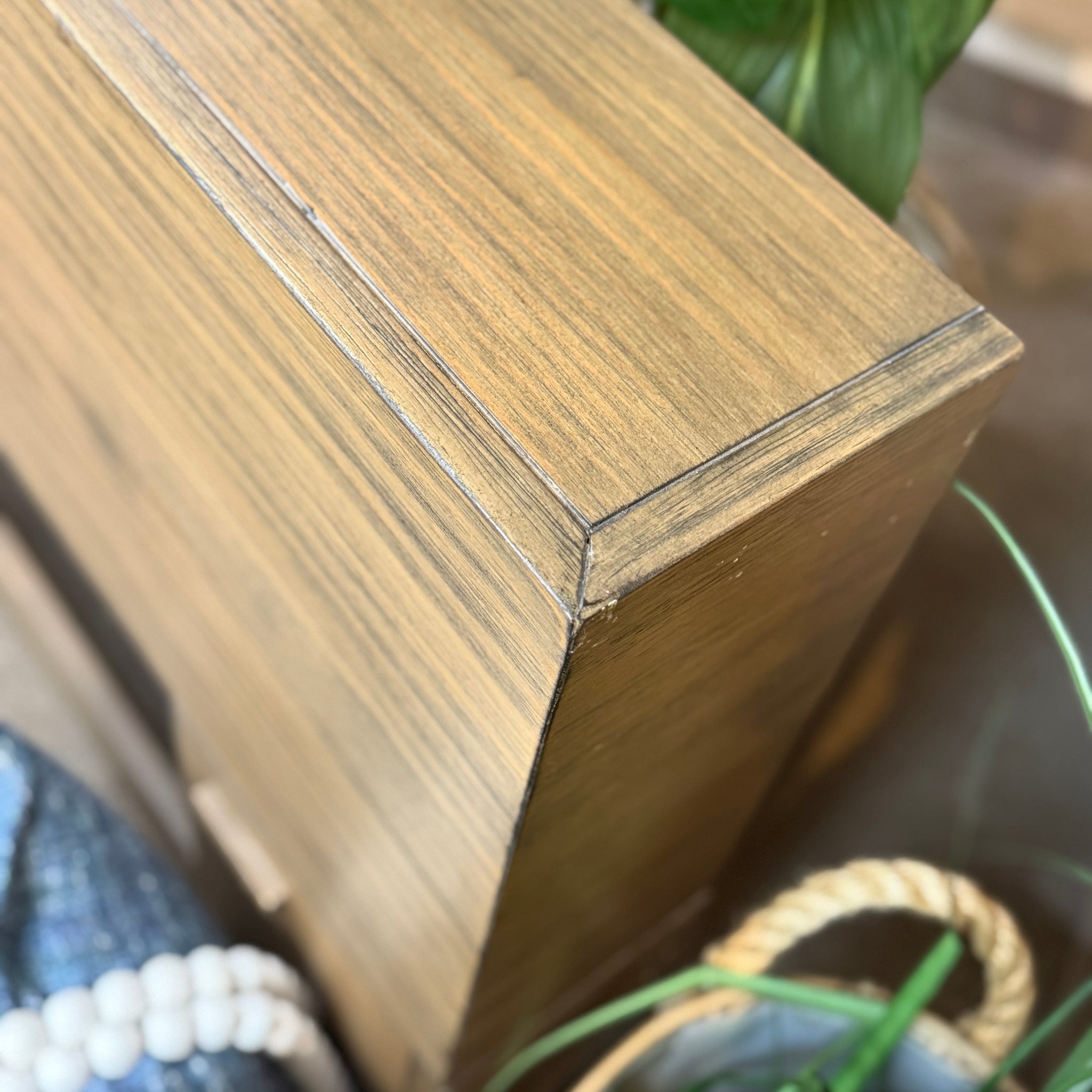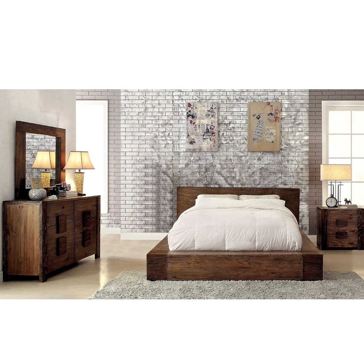Modern farmhouse style bed from Bowery Hill. Features a low-profile that includes headboard, footboard, sides and rails. In a rustic wood finish. On consignment and in good condition. Retails $1,000+, our price less!