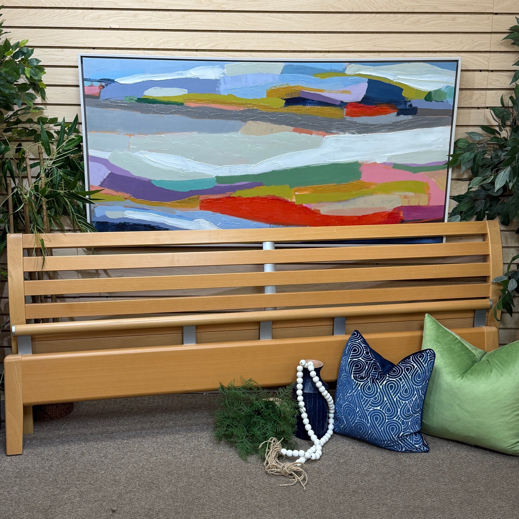 Modern style king size bed in a light wood finish. Features a slat headboard with a metal bar. Includes headboard, footboard, slats and rails.