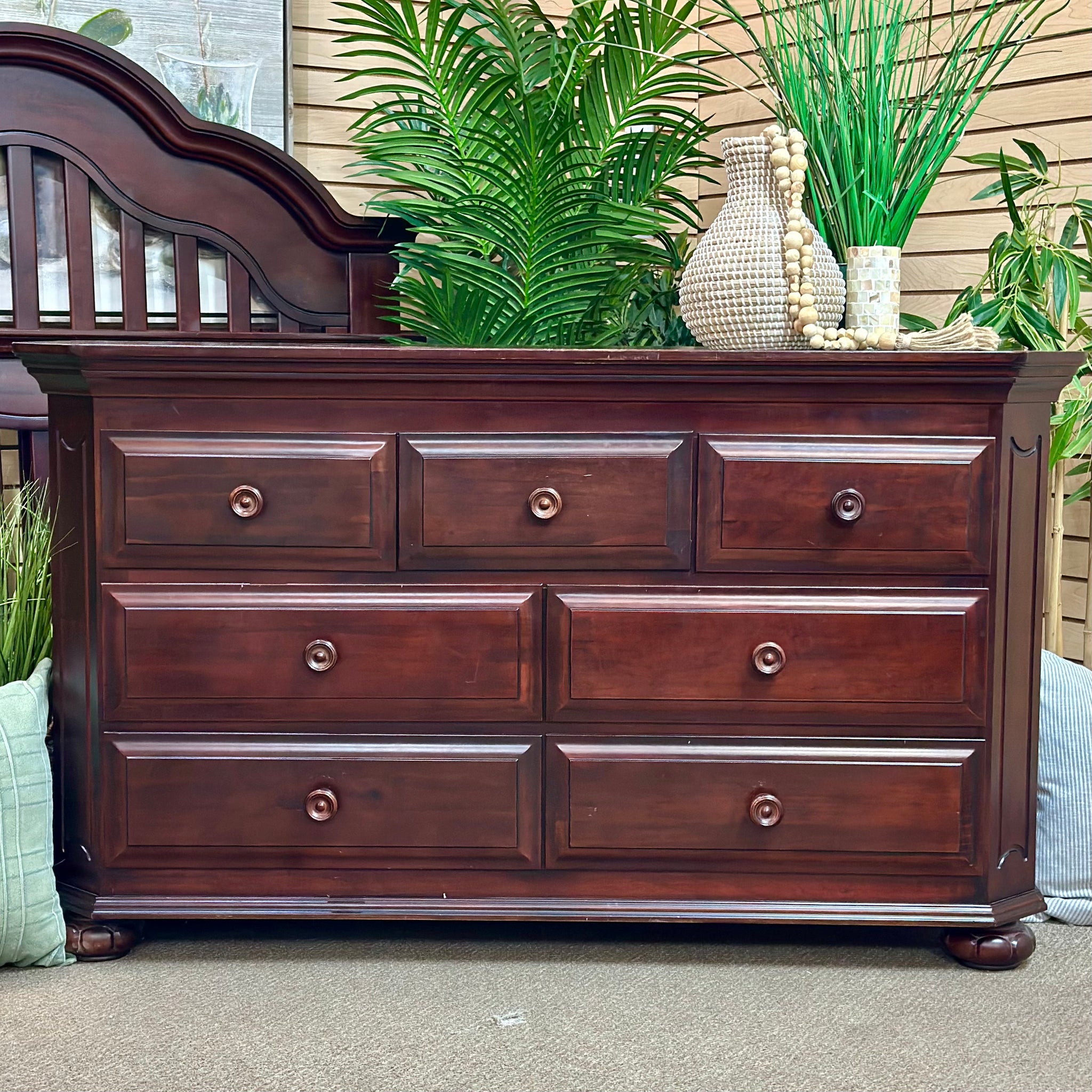 Handsome mocha dresser with seven drawers; on consignment with some minor nicks to the finish and otherwise great condition!