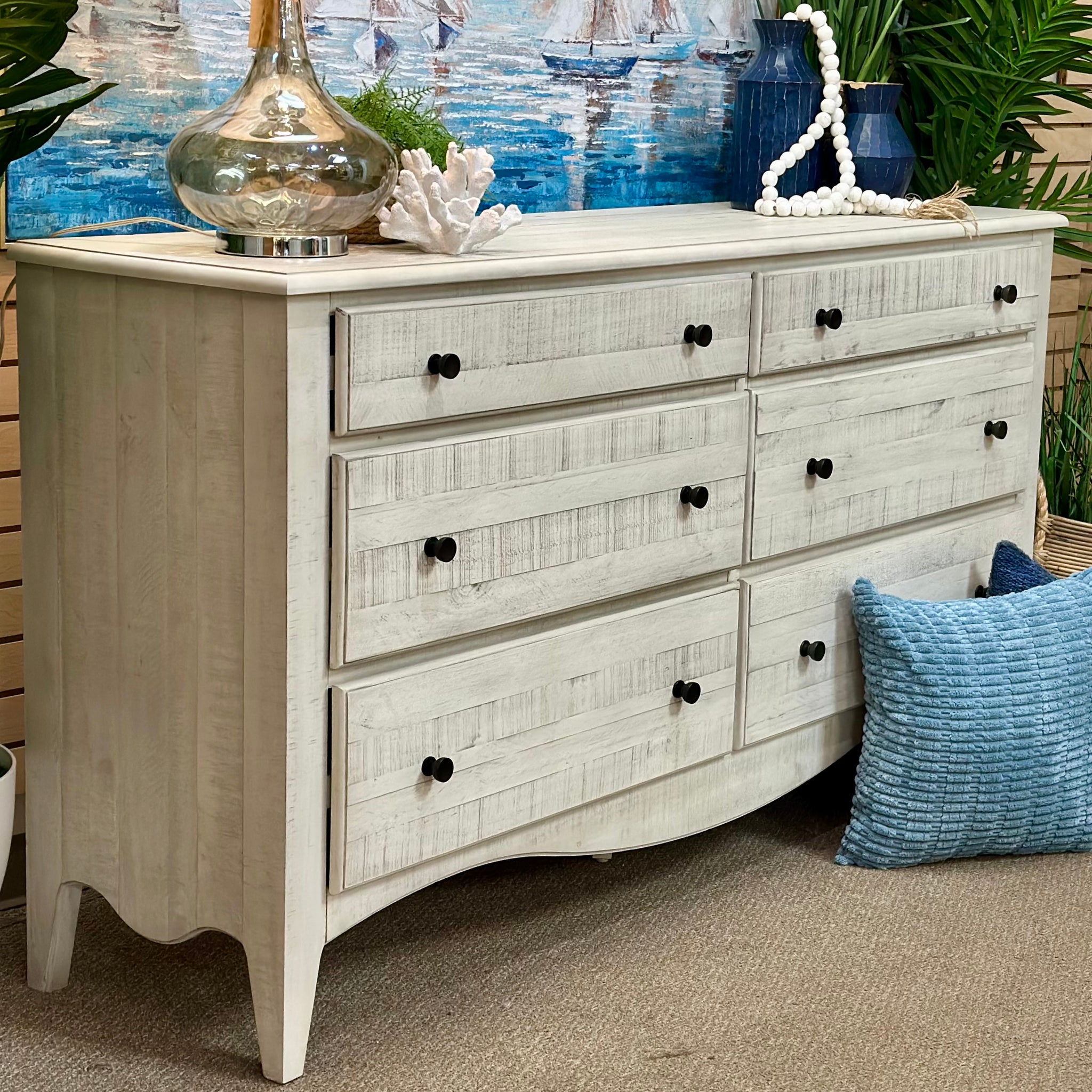 This beautiful solid pine dresser features an off-white dresser and size dovetail drawers. See the 'Ella' dresser online for $1,398, our price less and in great condition!