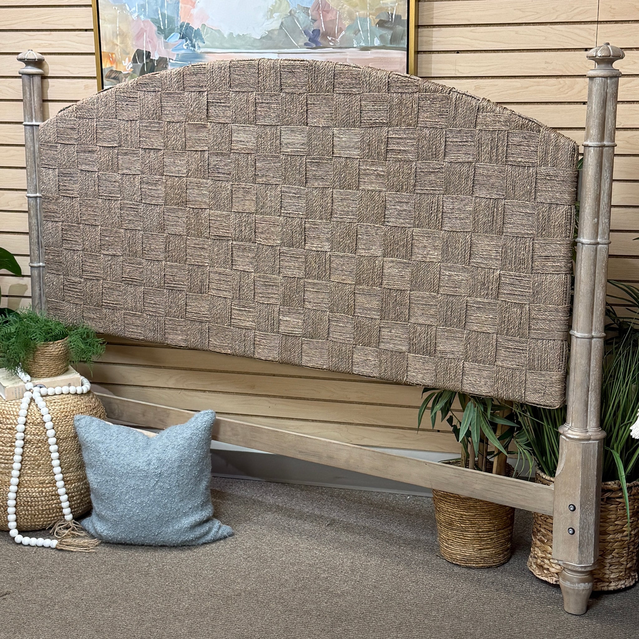 This handsome headboard is perfect for a coastal bedroom. Features natural woven cane, and craved wood sides. In great condition. Retails 2490+, our price less! Headboard only.