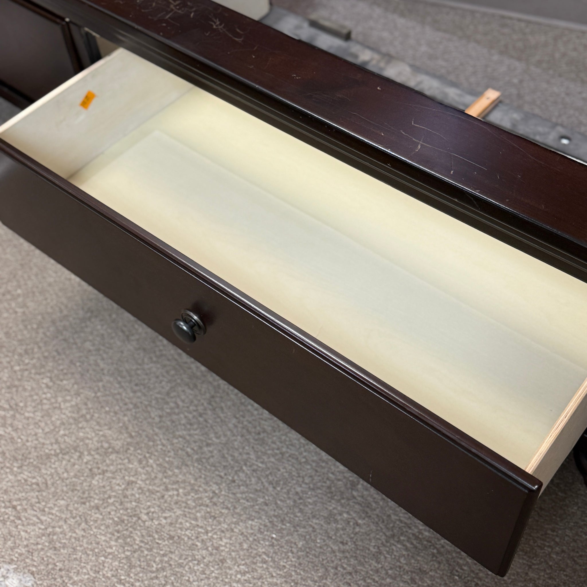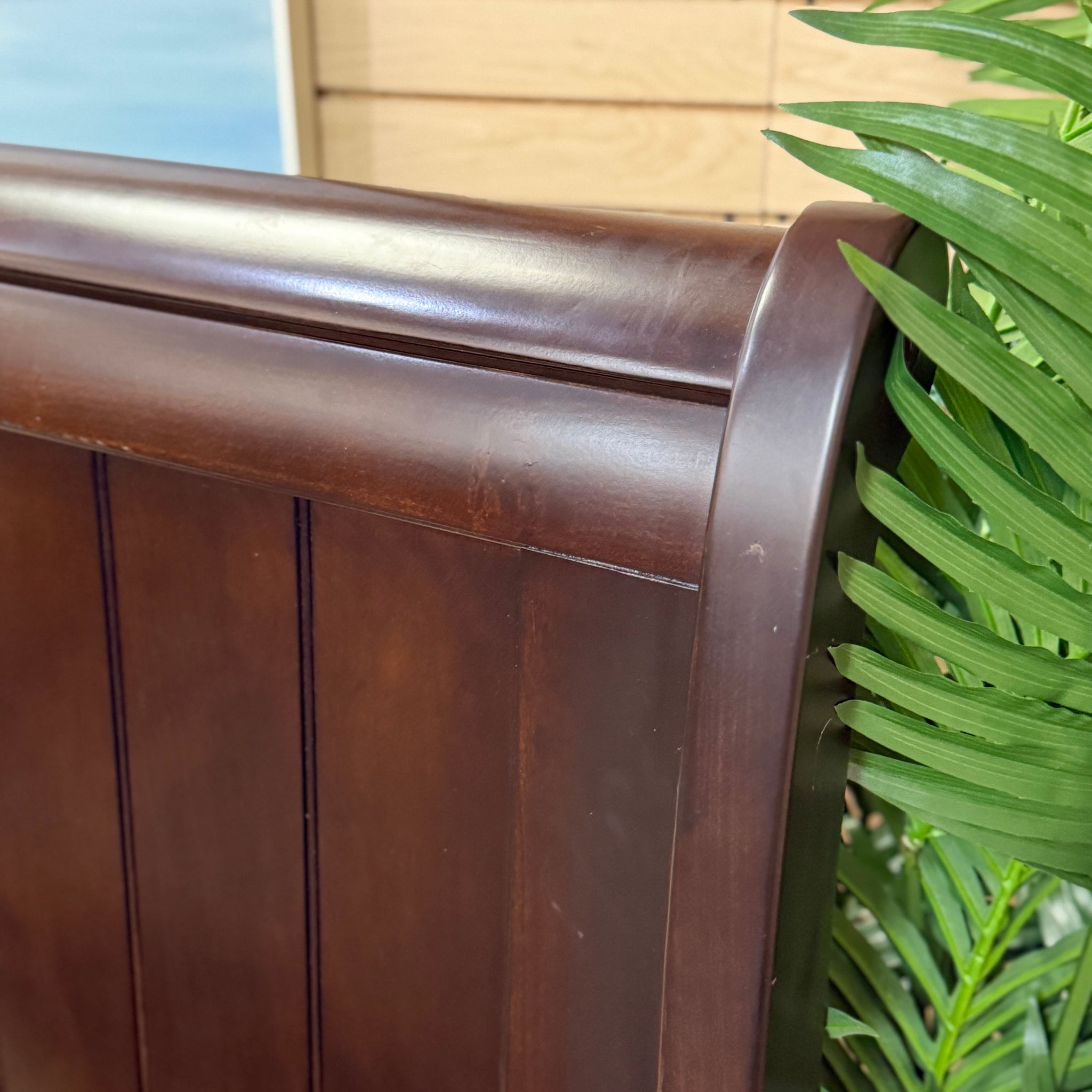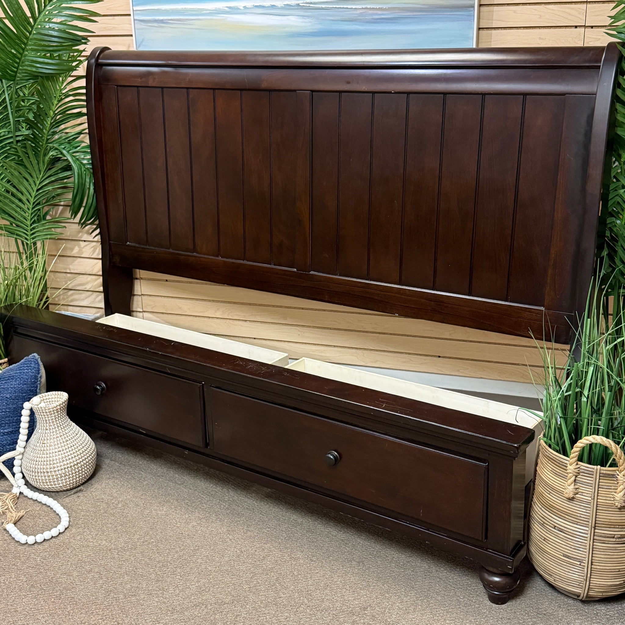 Handsome king bed with warm mocha finish and storage footboard. See the 'Camdyn' bed online for $800+, our price less with some visible scratches on the footboard. Bed includes rails and slats.