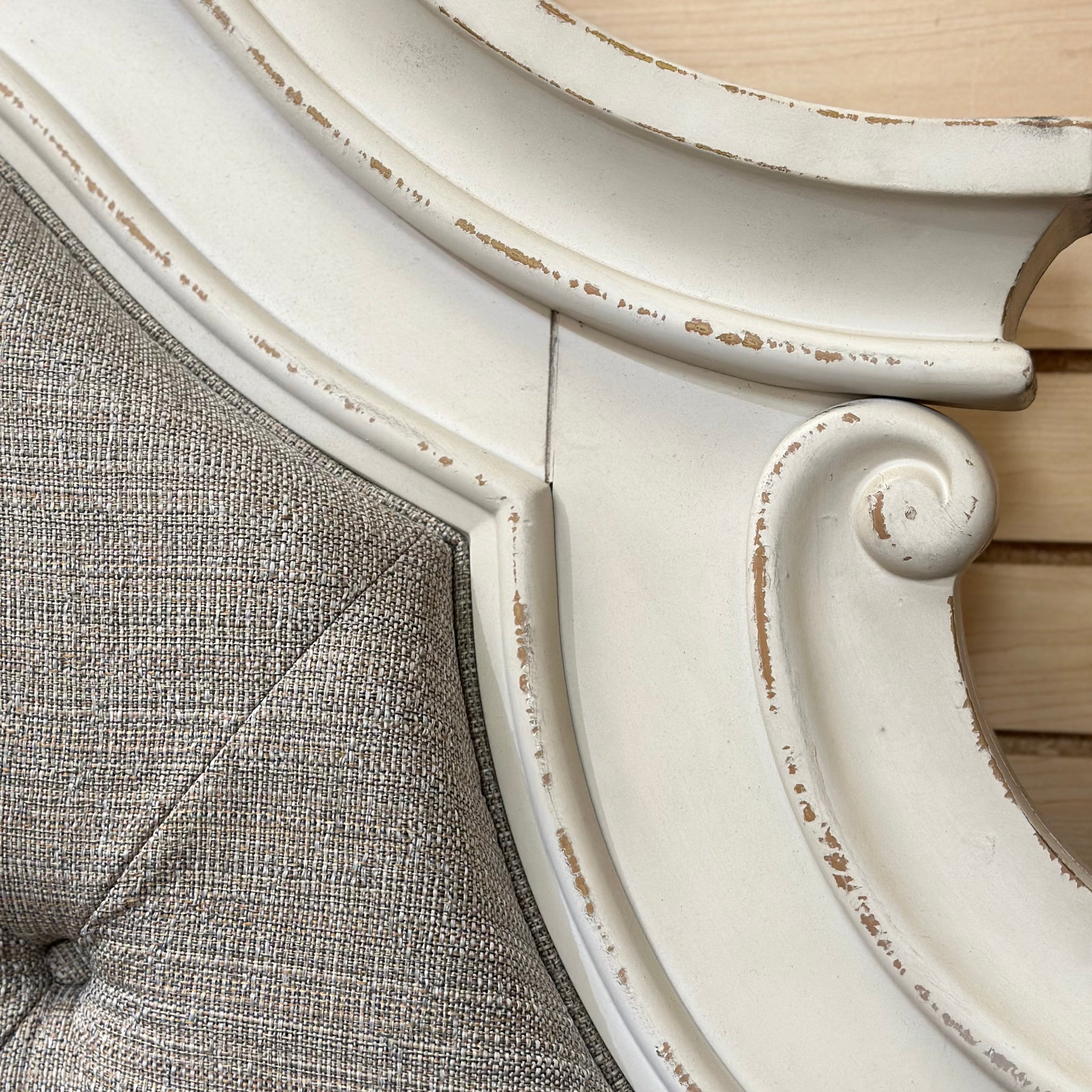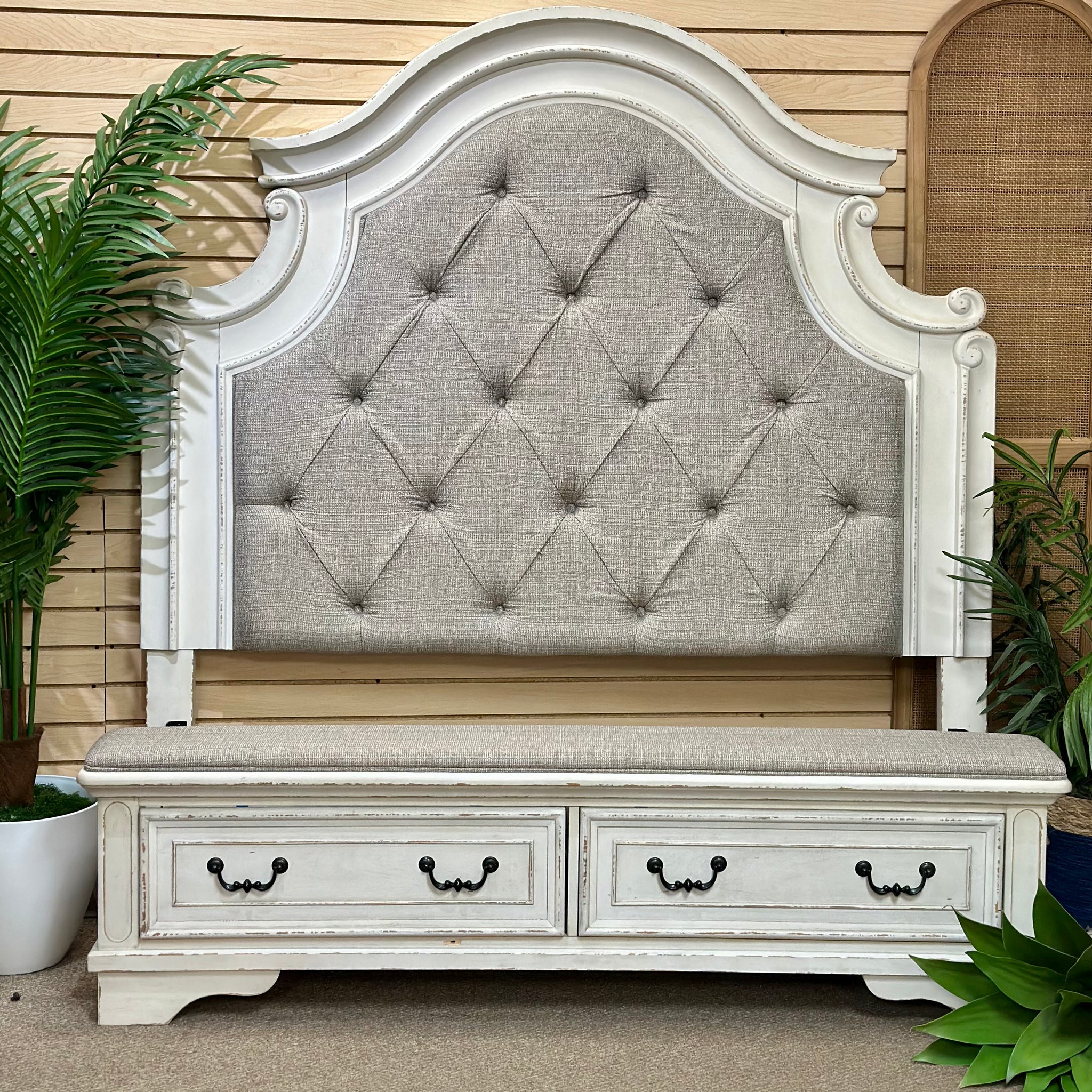 Beautiful ivory bed with taupe tufted upholstery and storage footboard with built in bench. See the 'Realyn' bed online for $899+, our price less and in excellent condition! Bed includes rails and slats.