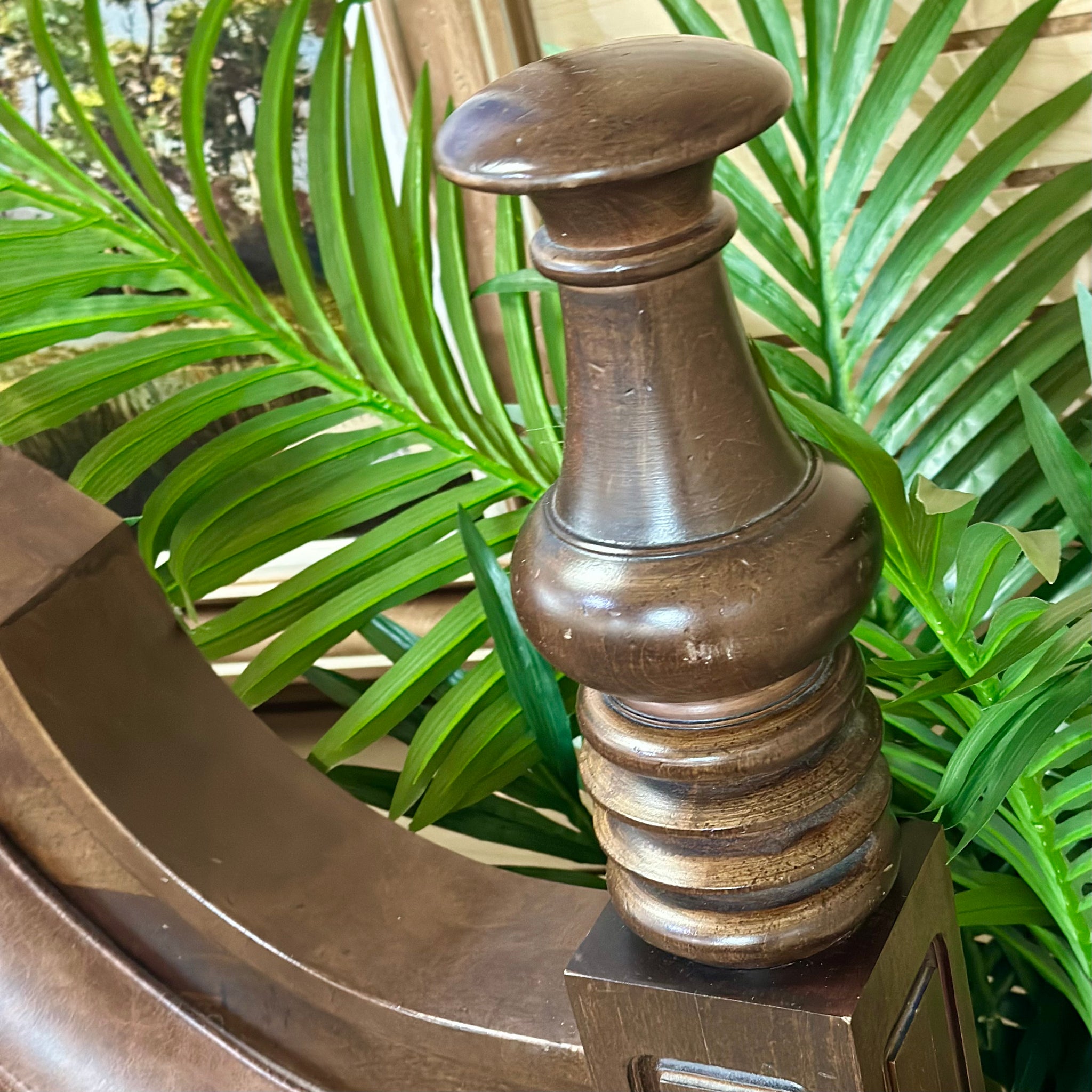 Upgrade your bedroom with this handsome king bed by Stanley. Features rich leather on headboard, carved finials, and a diamond pattern on footboard. Includes rails. In great condition with some normal wear to leather.