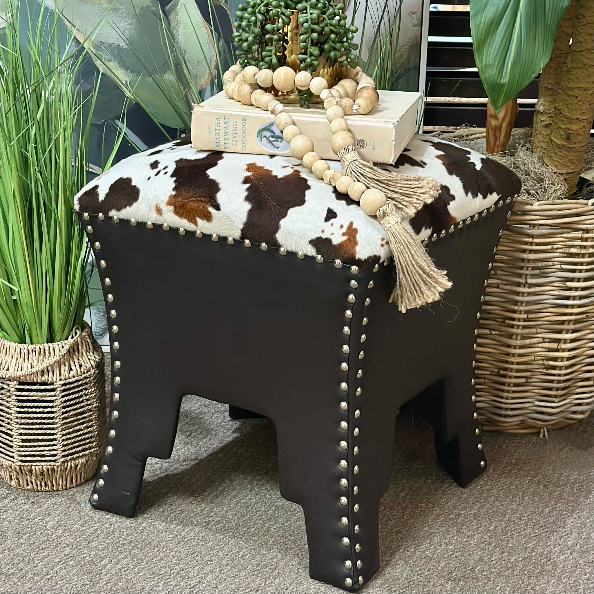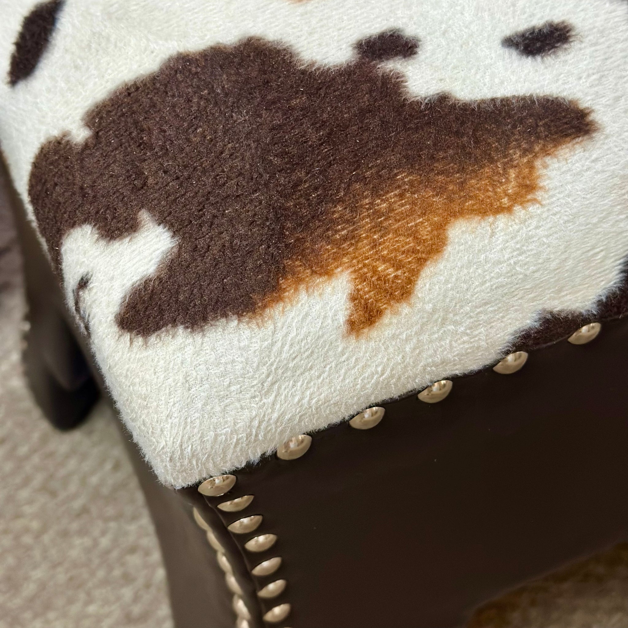 Add this cute stool to any space. Features a faux cow print on top and faux mocha leather sides with silver nailheads. In great condition.
