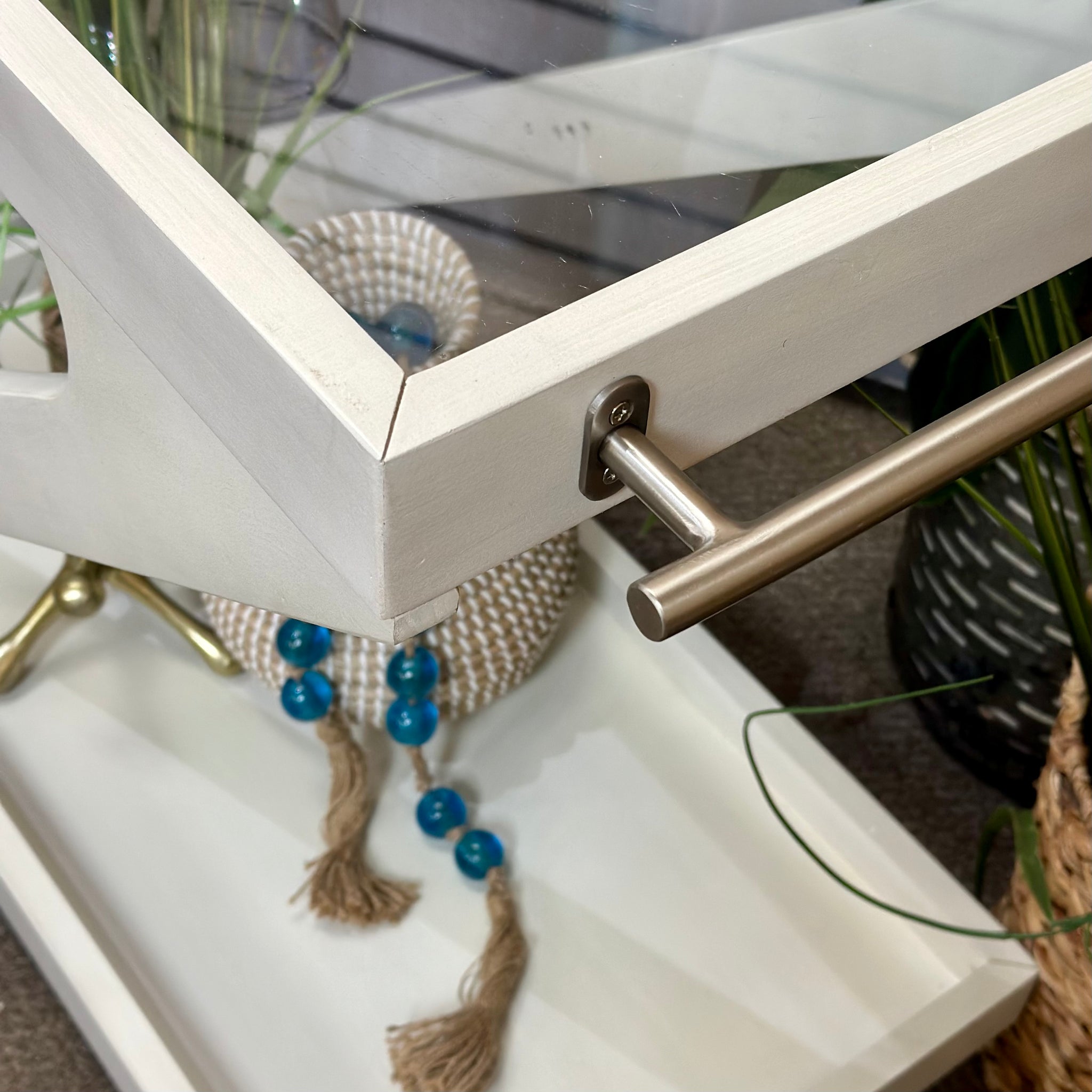 Swanky and modern bar cart in a warm, ivory finish and a unique Z shape. Brand New!