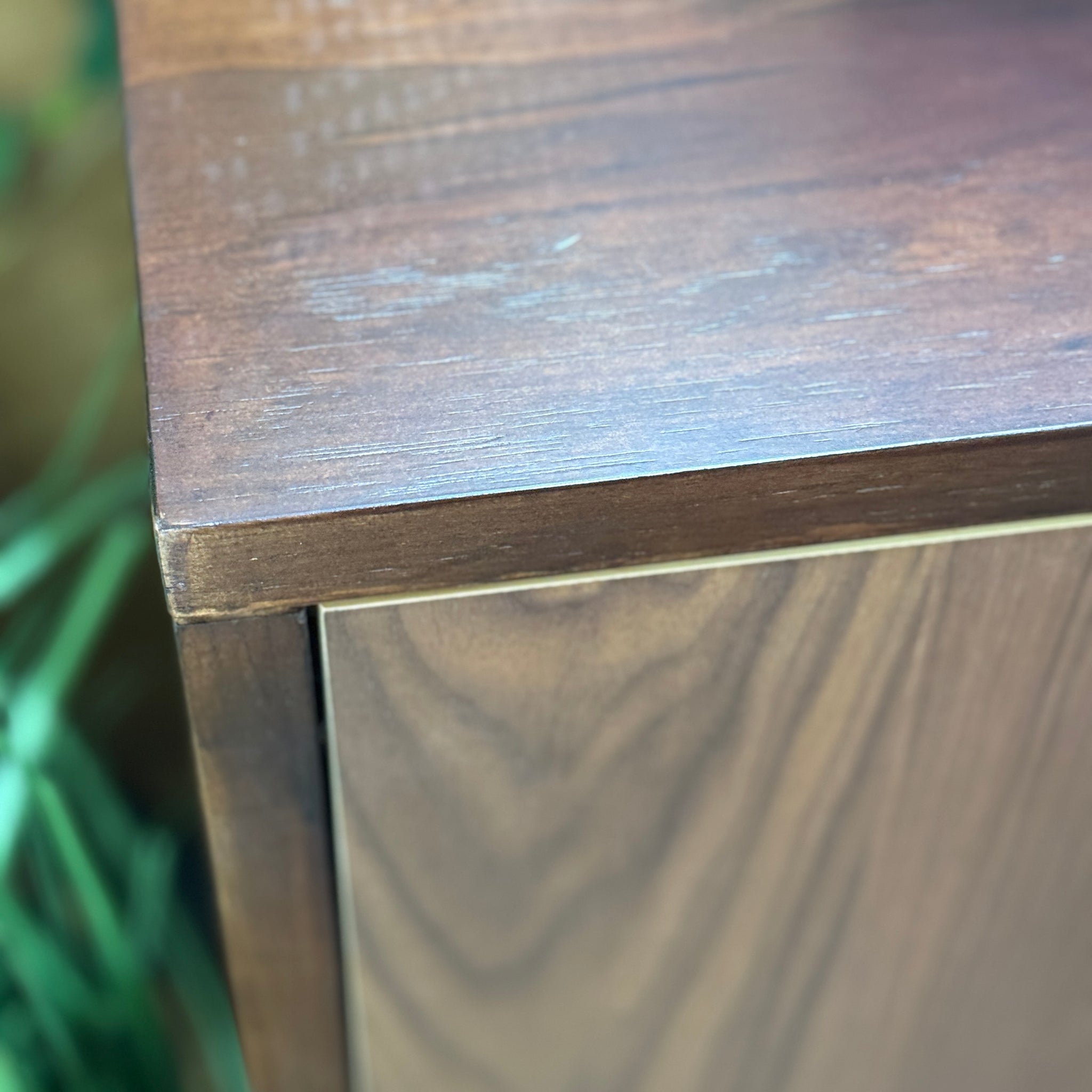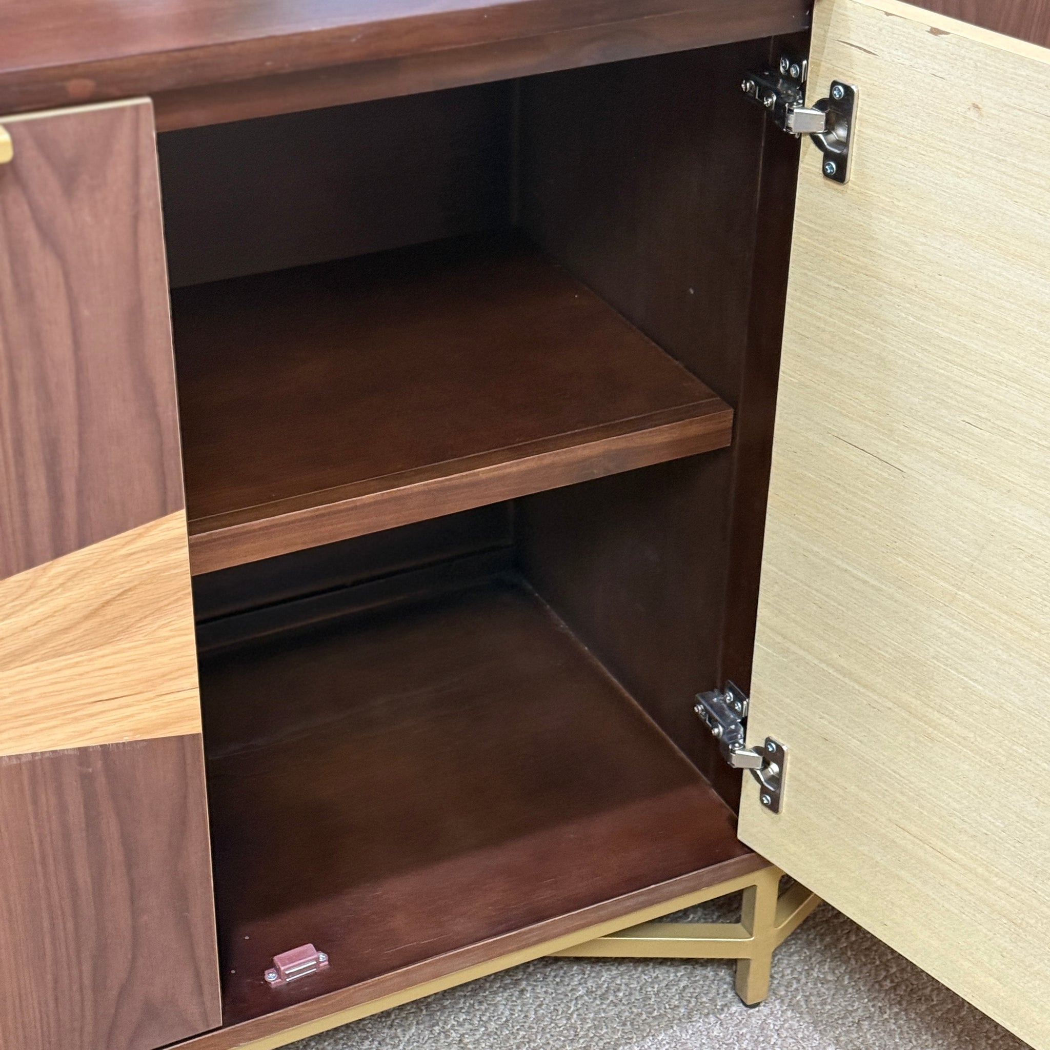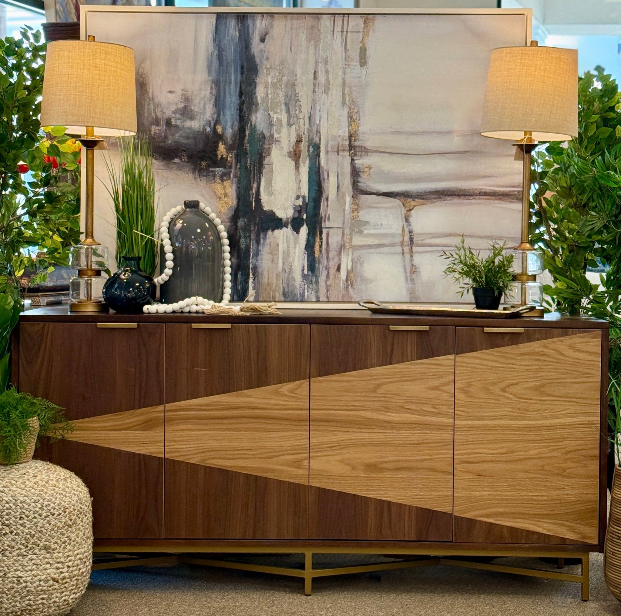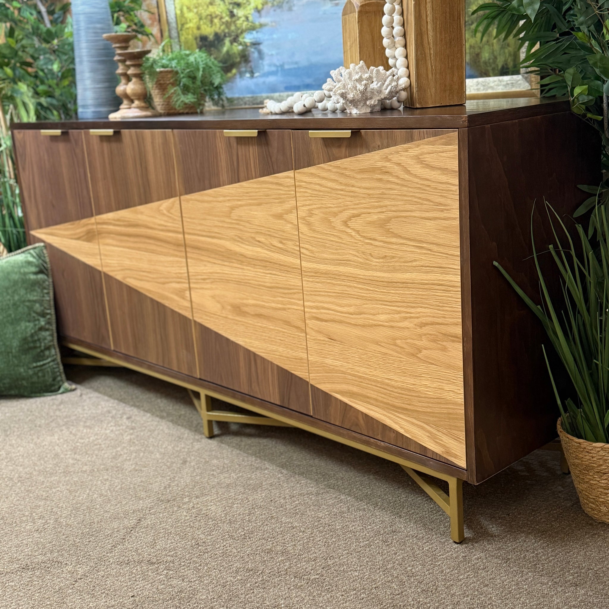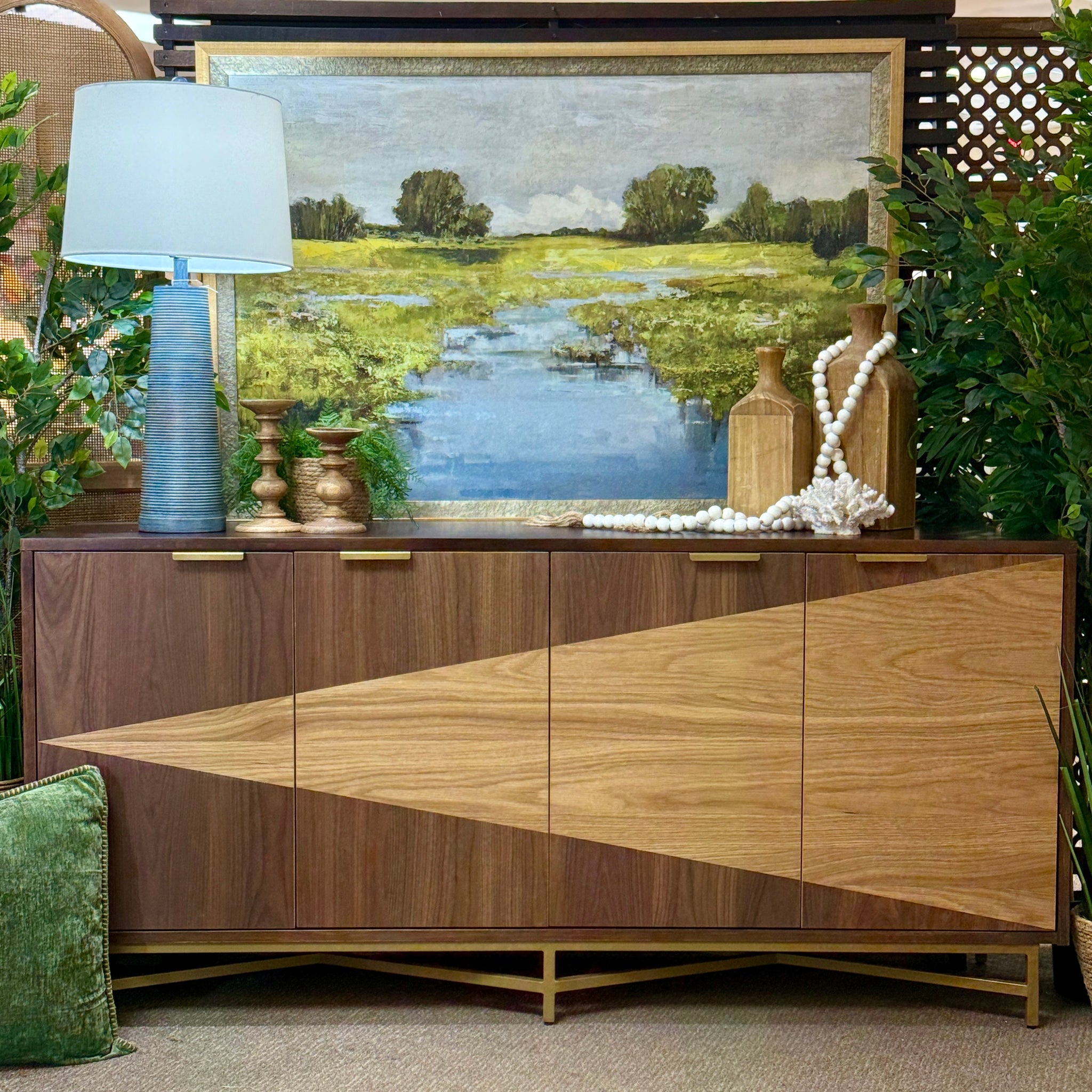 Statement sideboard in a two-toned wood finish with a unique vector point pattern. Features a brass stretcher as the base and 4 doors for ample storage. Brand New!