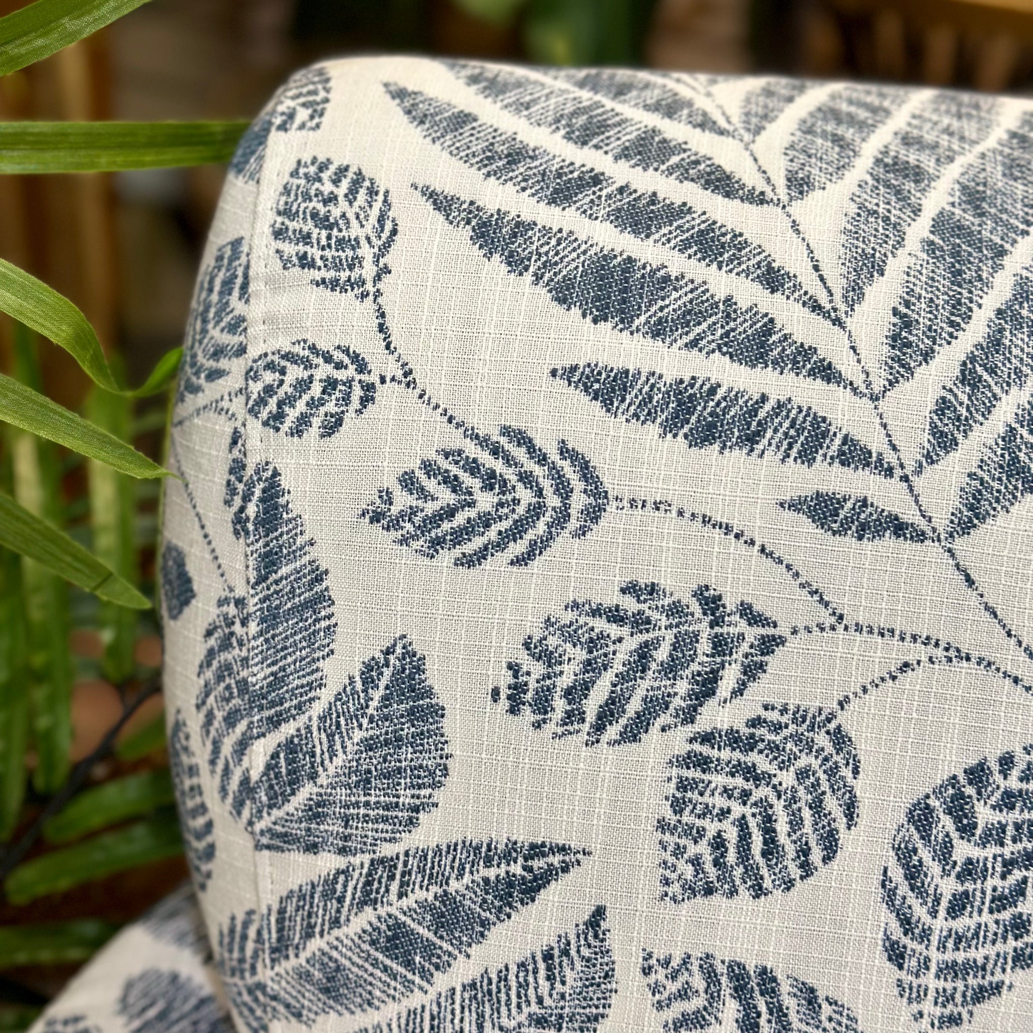 Gorgeous swivel glider in a blue leaf print fabric. Brand New!