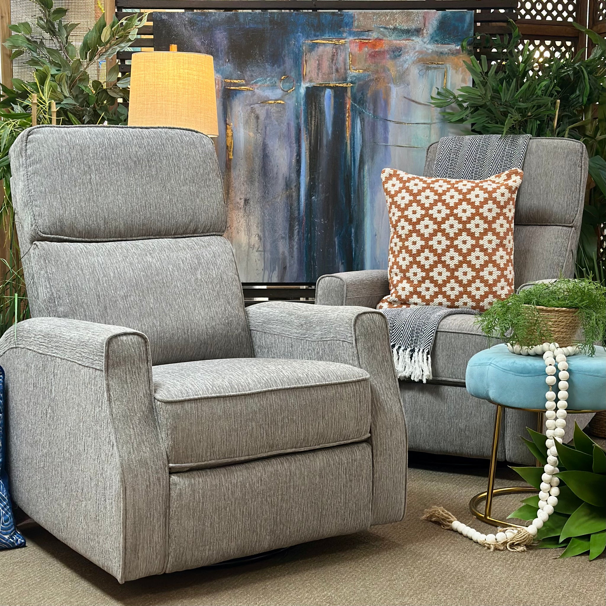 The best of both worlds! This grey swivel chair is actually a recliner featuring soft grey upholstery with easy accessible handle between the arm and seat. Brand new and won't last long!