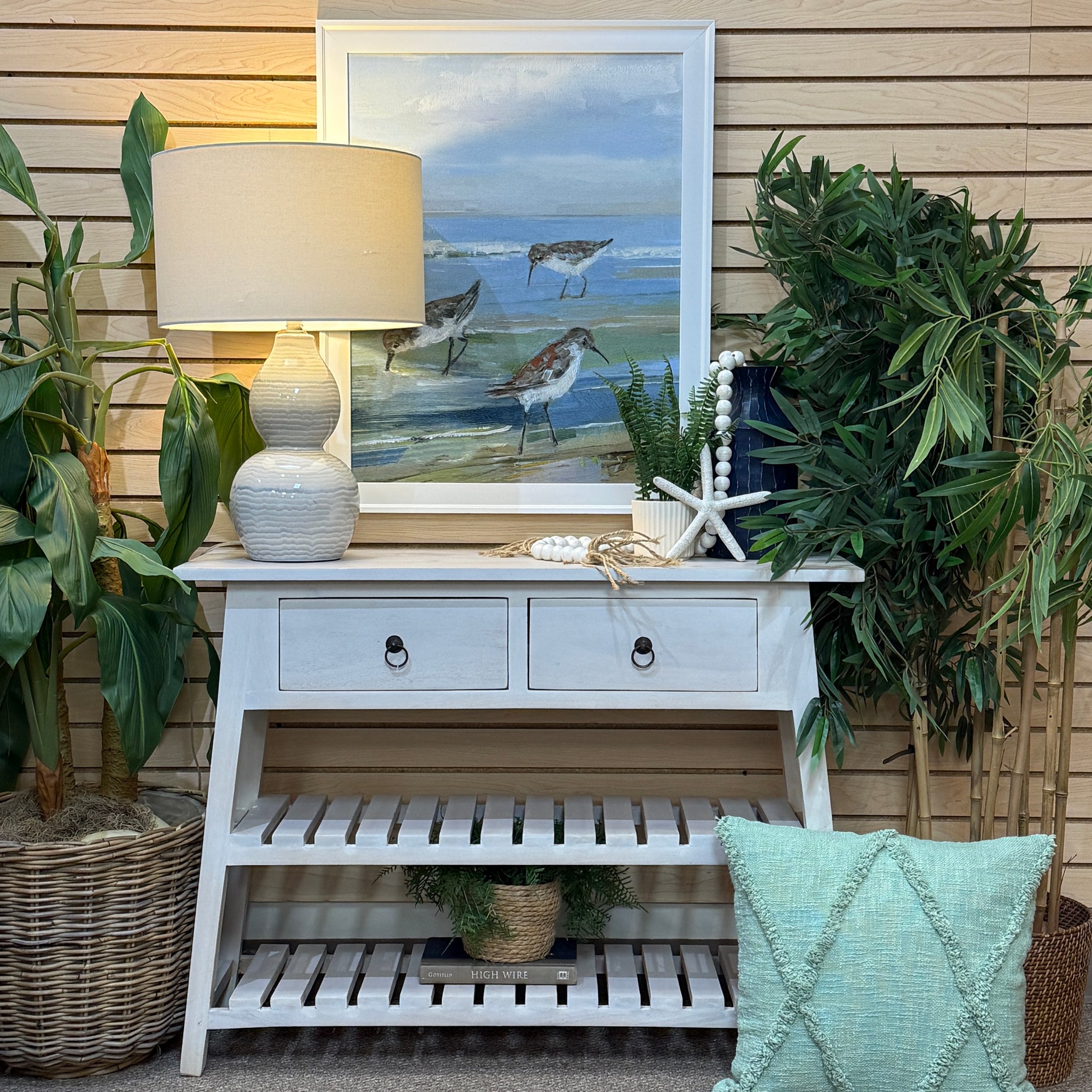 Adorable console with two drawers and lower selving for storage. In a painted white finish.