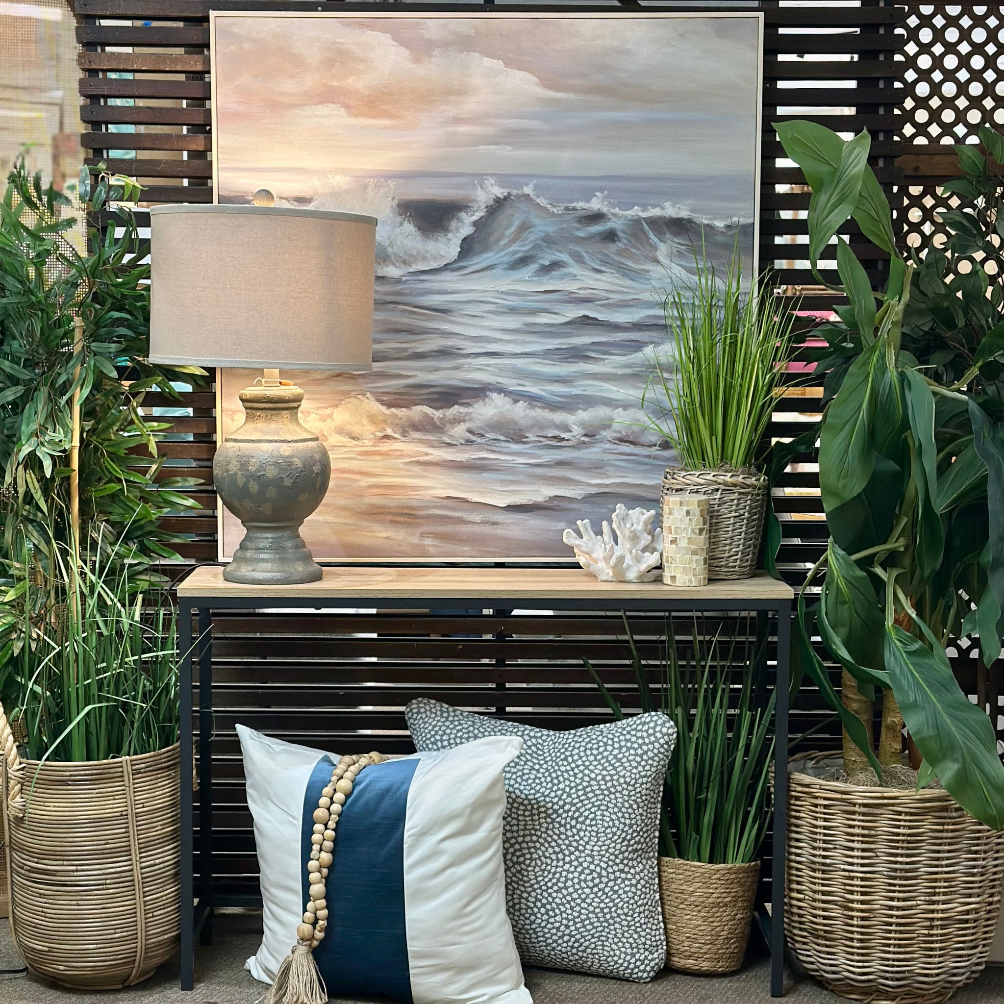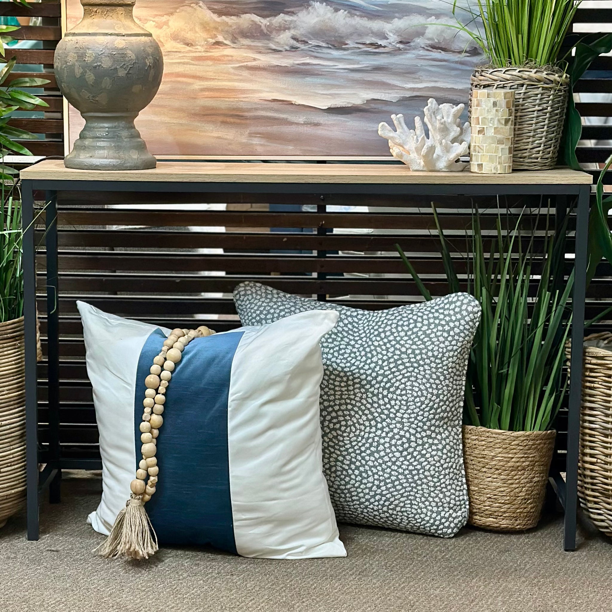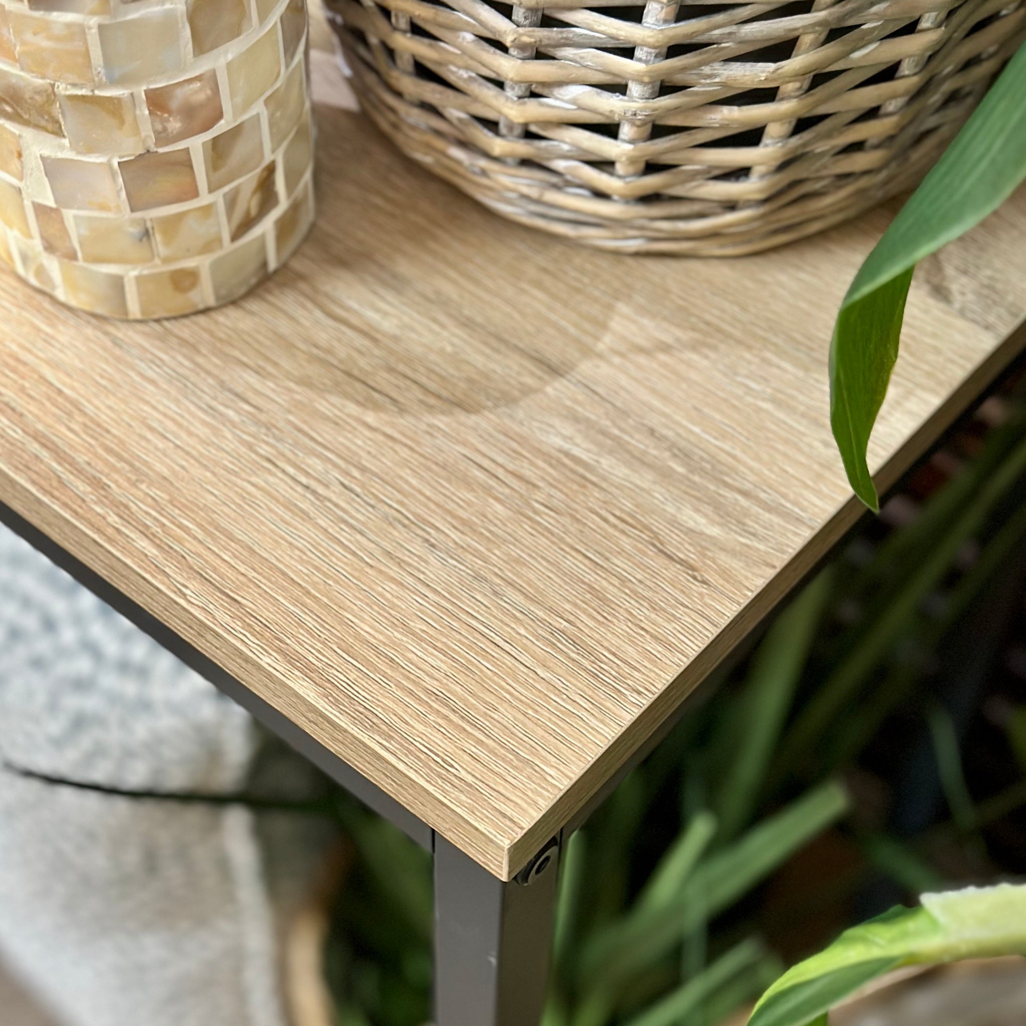 What a cutie! This petite scale console has a light wood-look top and black metal frame. Convenient for smaller areas. On consignment and in great condition.