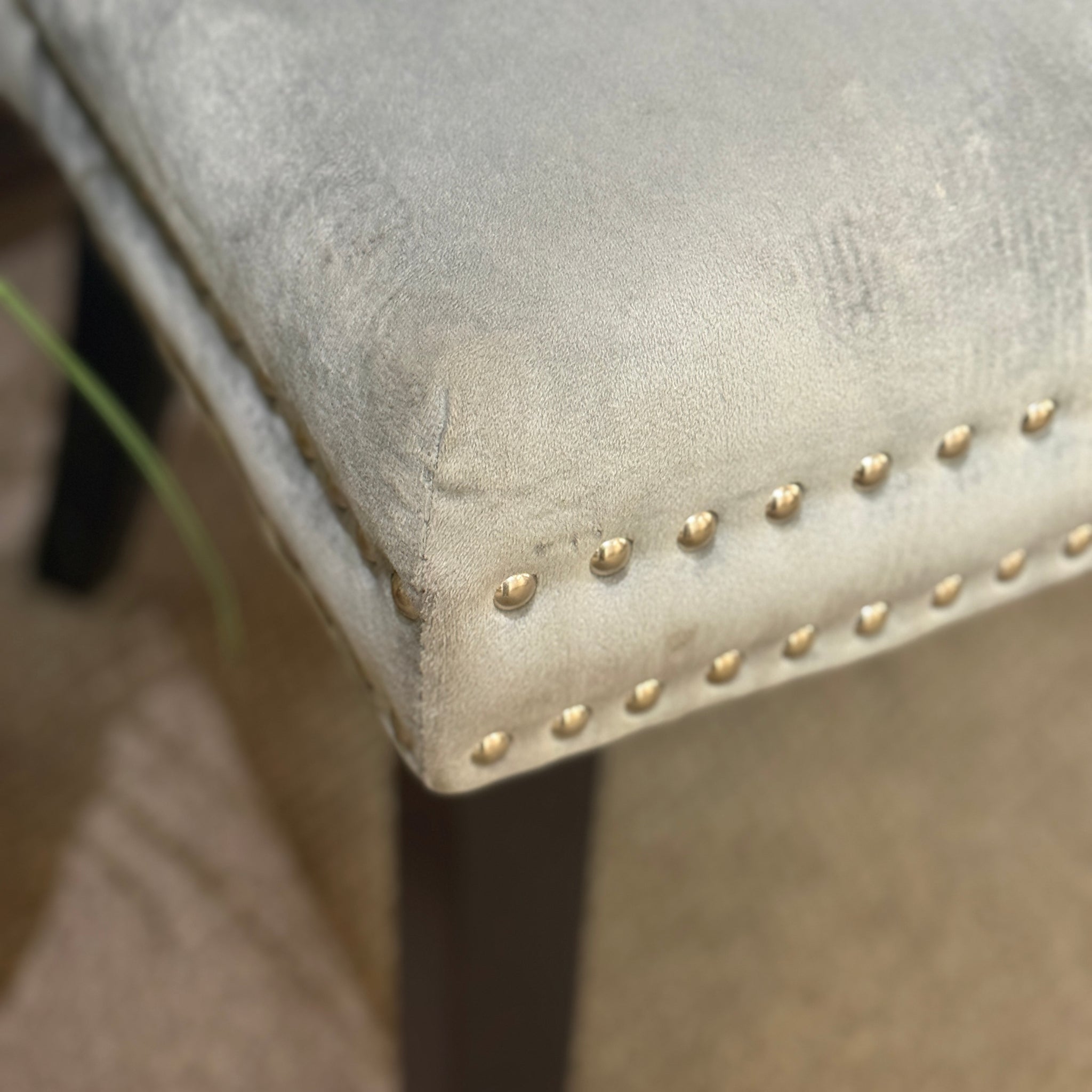 Add some elegance to your dining space with this dining chair. Features a tufted back rest, silver nailheads and a soft velvet like grey upholstery. In great condition.