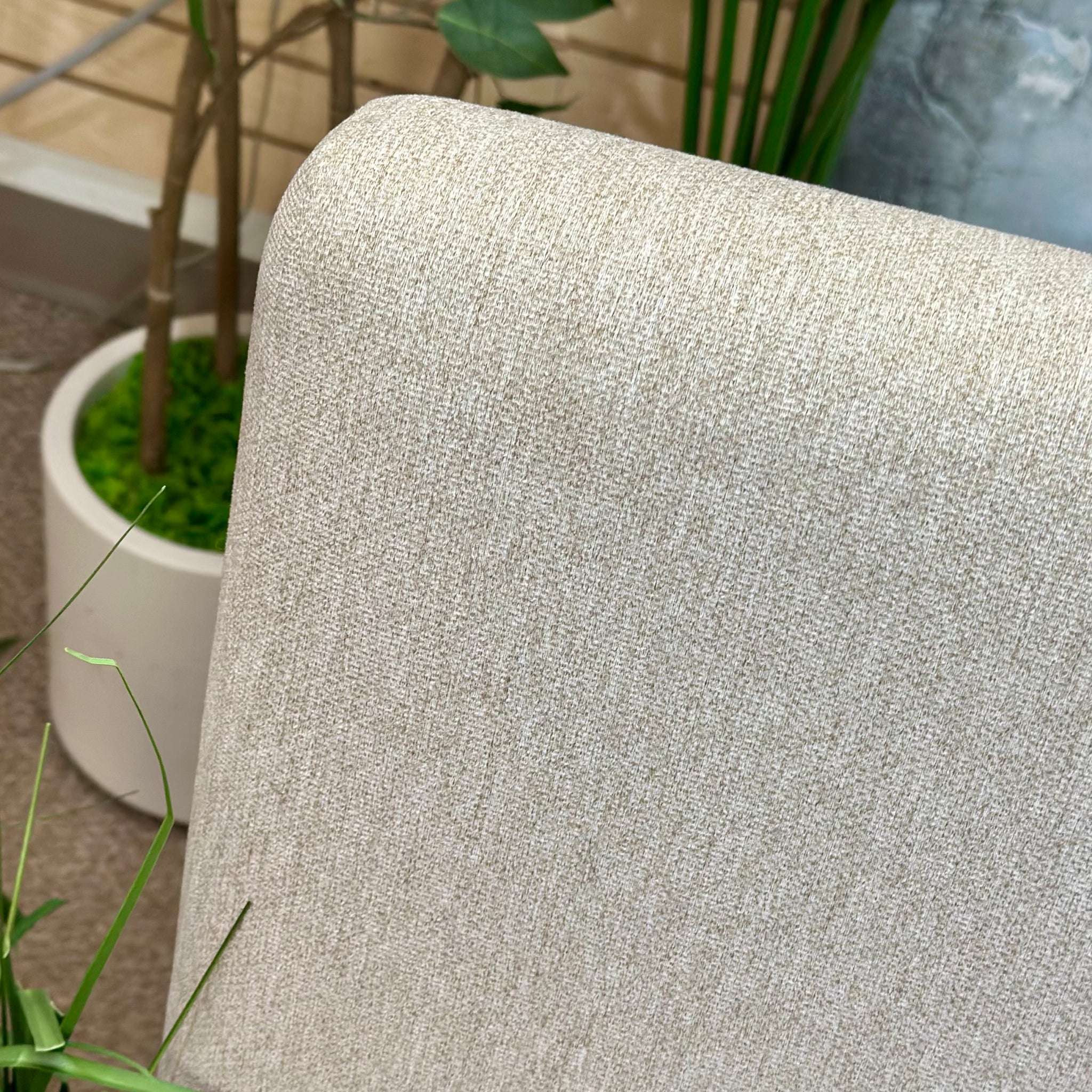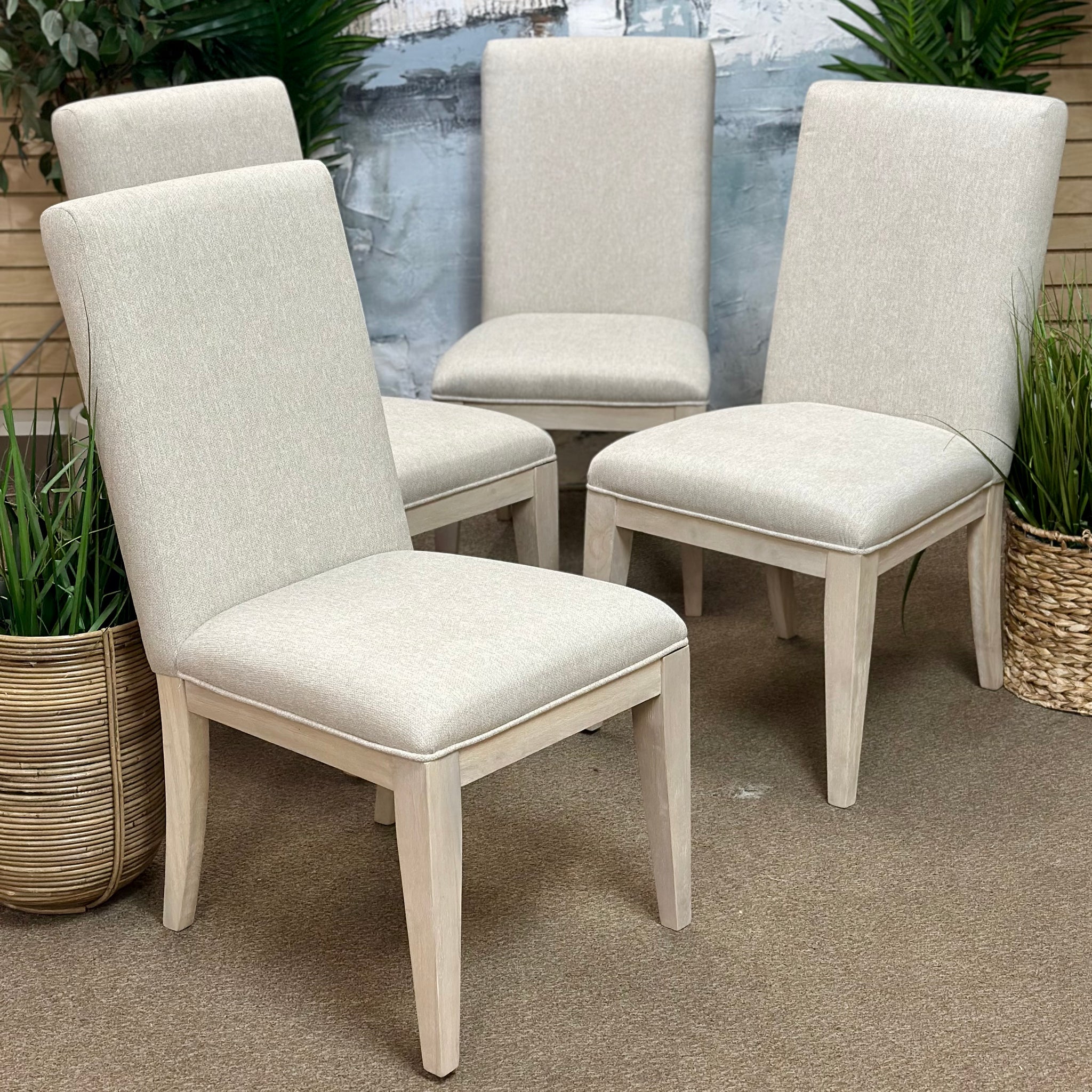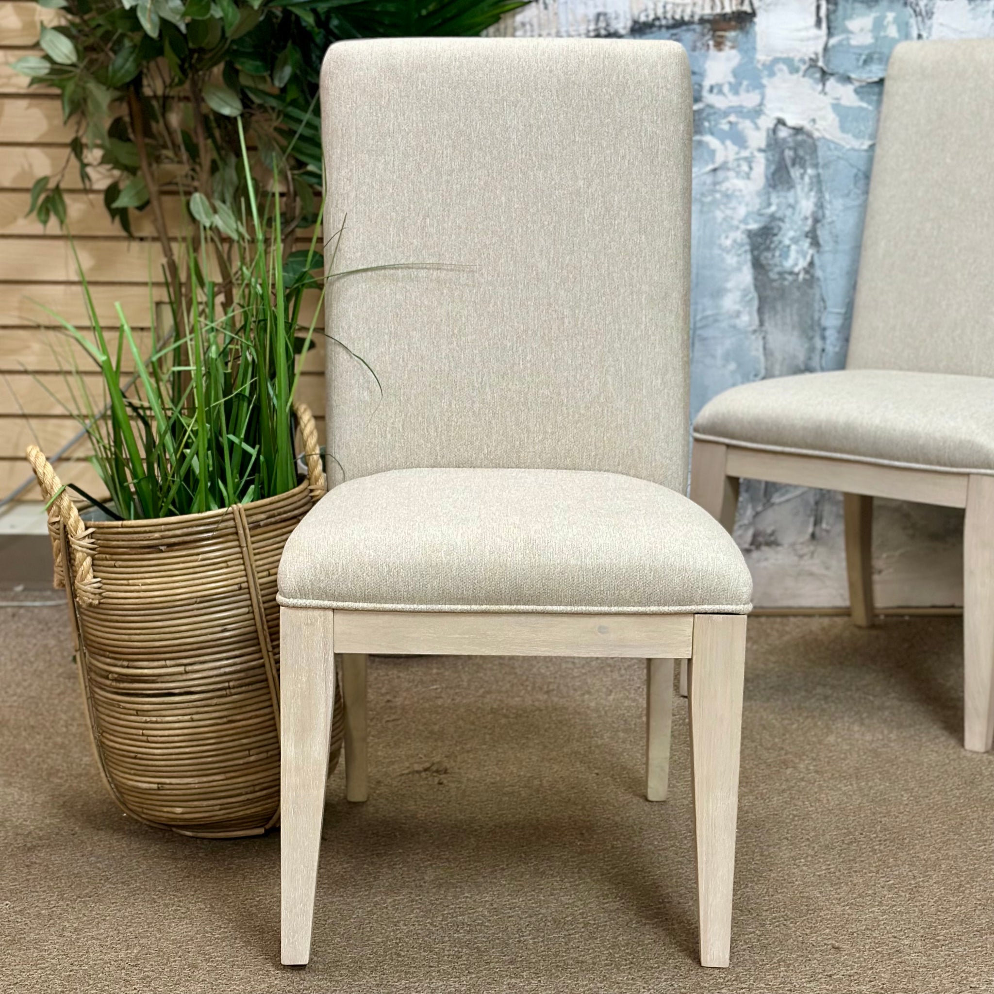 Opportunity buy! This brand new dining chair came to us on closeout and won't last long. See the 'Bliss' dining chair online for $300+featuring select a light oatmeal fabric and oak veneer frame. Our price less and brand new!
