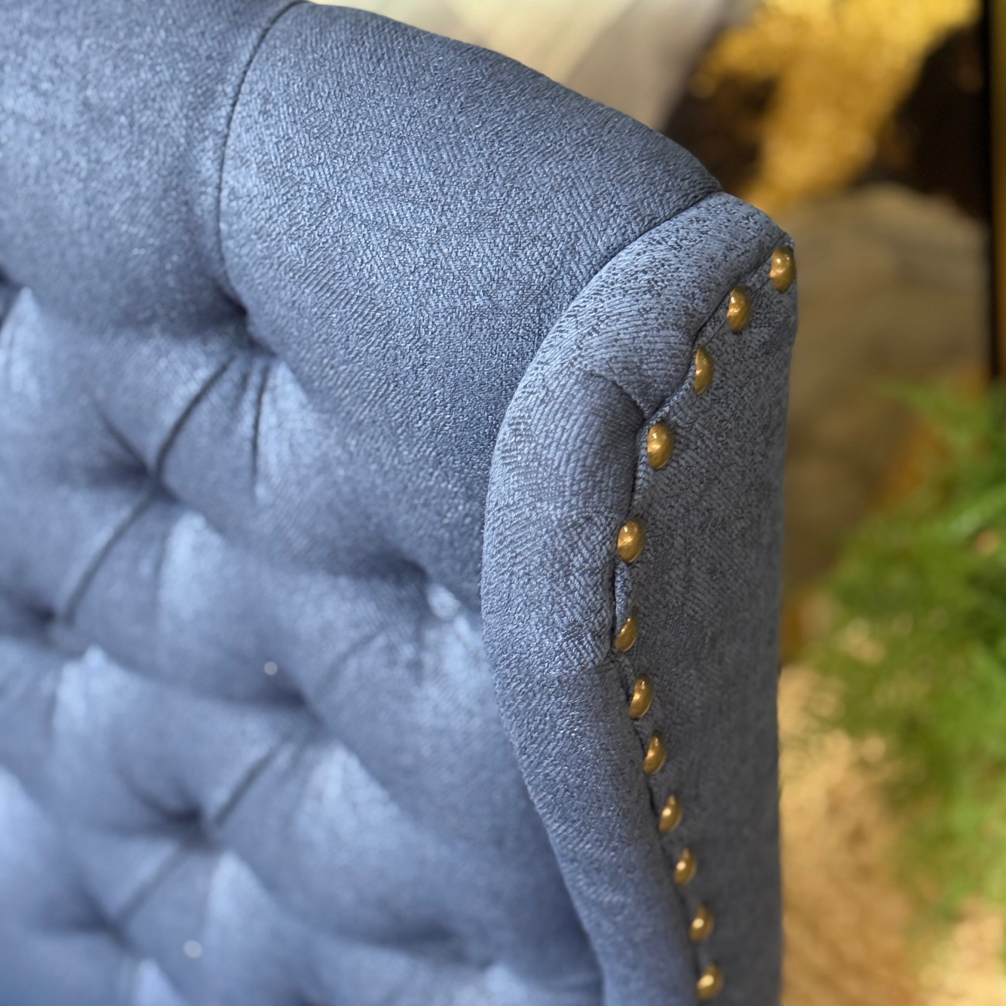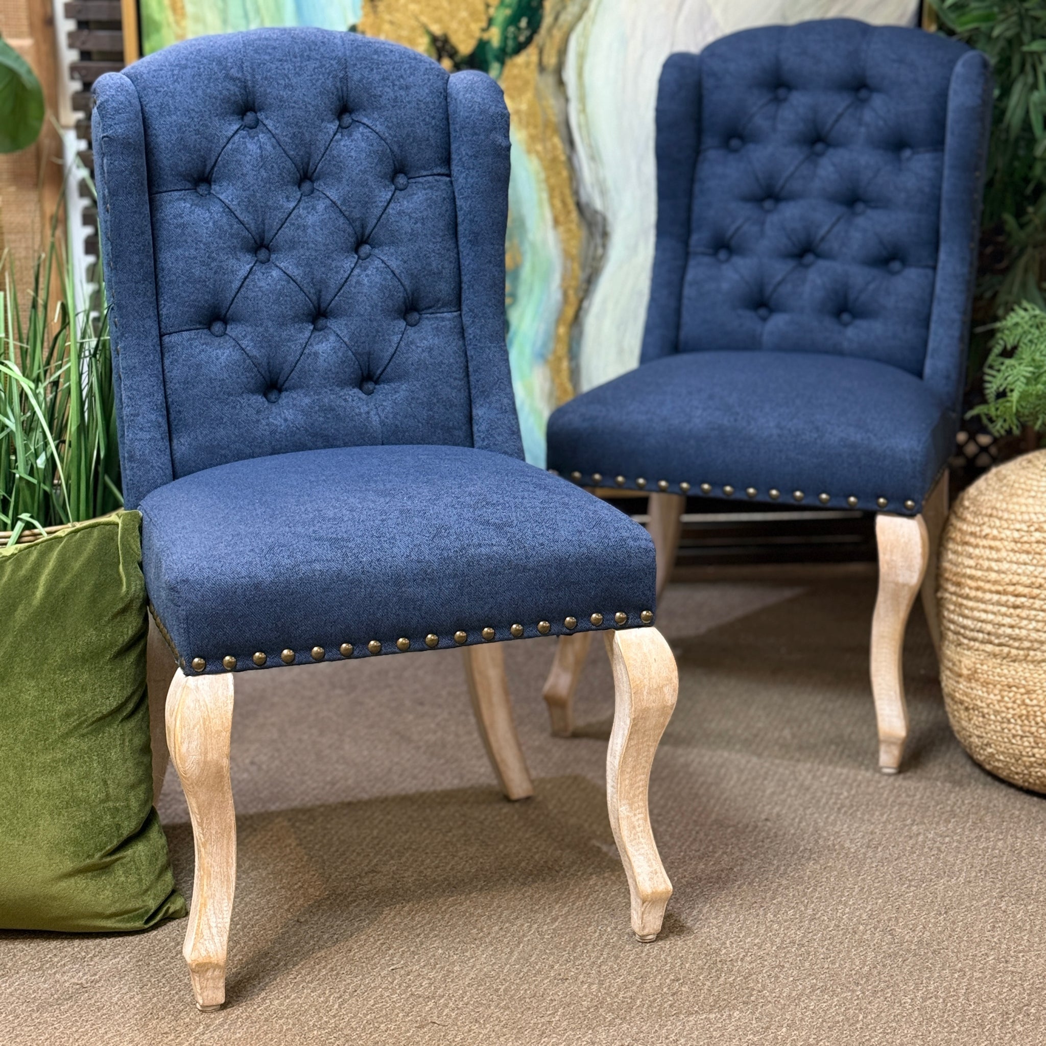 Elevate your dining space with this handsome dining chair. Features a tufted back, nailhead trim, solid wood legs, and a navy uphosltery. In great condition.