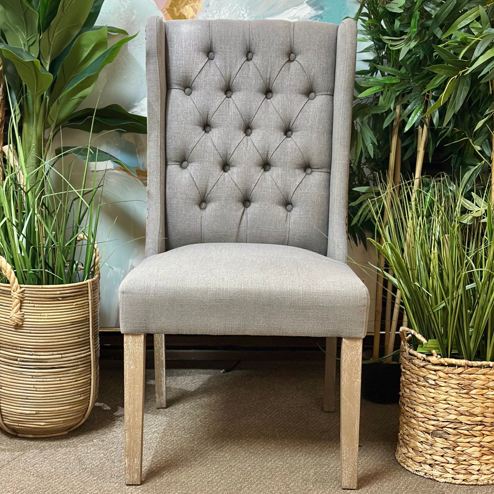 Two-toned dining chair in a grey and beige fabric. Features a tall tufted back and nailhead trim. Has some minor staining, otherwise in good condition!