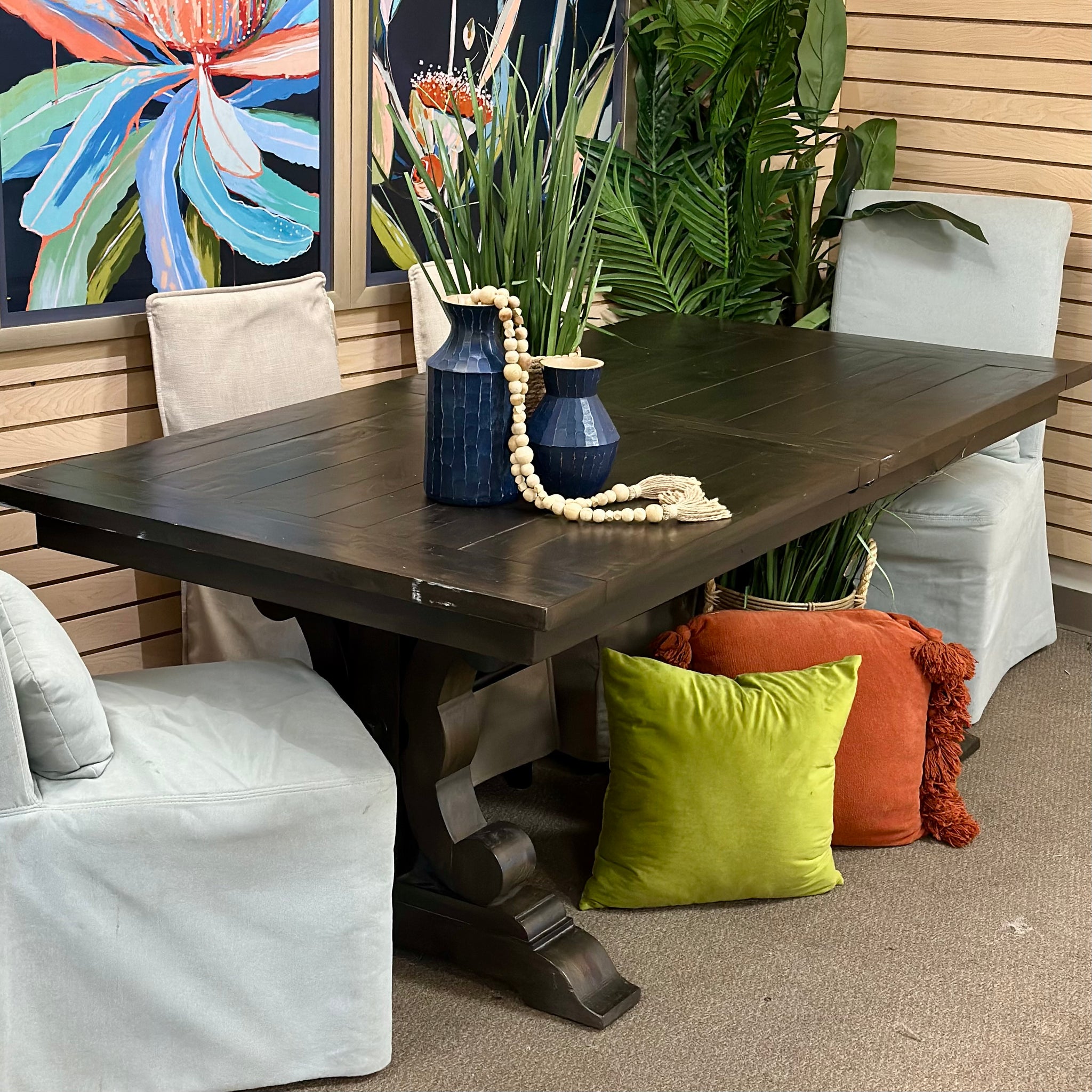 Upgrade your dining room with this handsome dining table. Features scroll trestle legs with metal support bar, a wood farmhouse style top, and a dark brown finish. Includes two self storing leaves. In great condition.