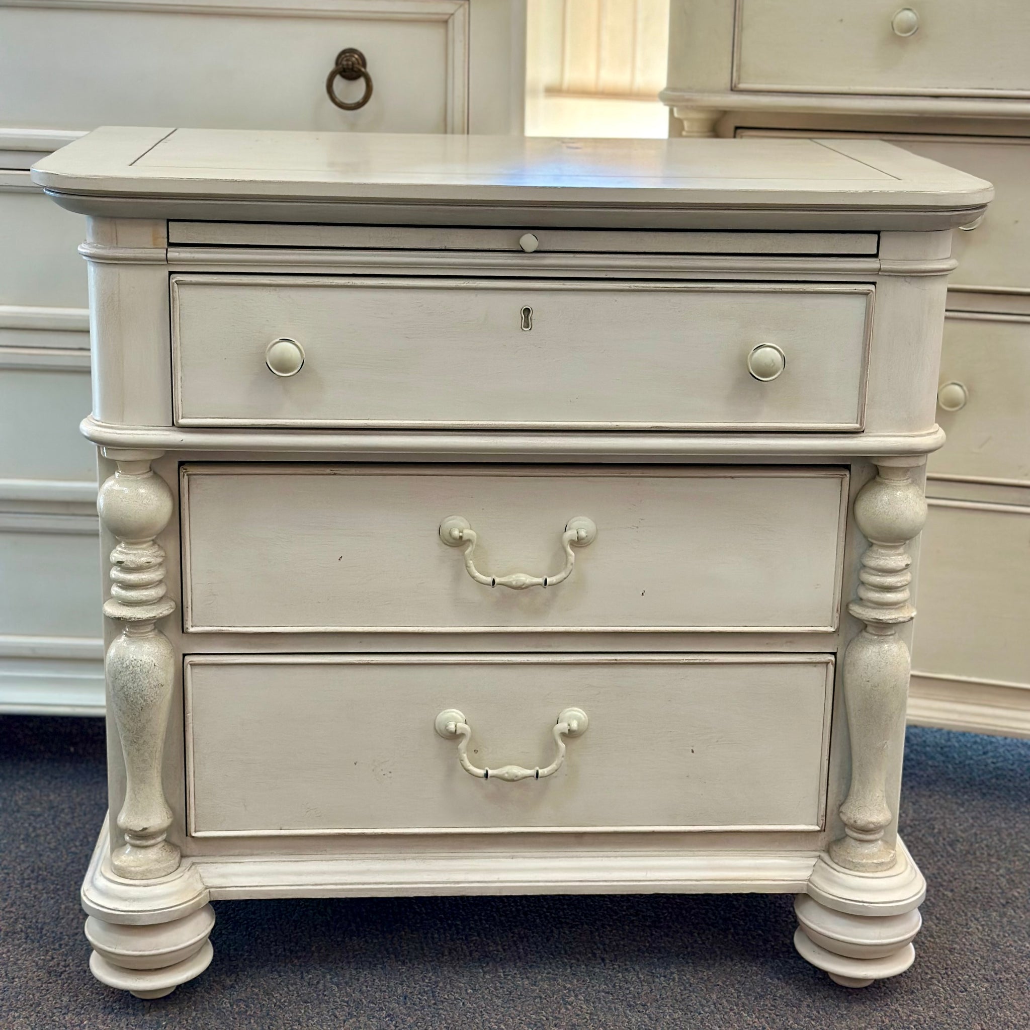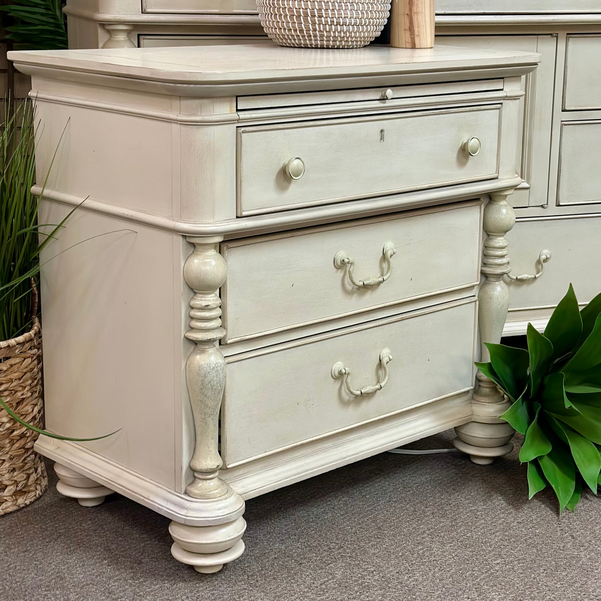 High quality nighstand with three spacious drawers by Paula Deen retails $800+, our price less! In on consignment and in good condition.