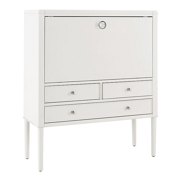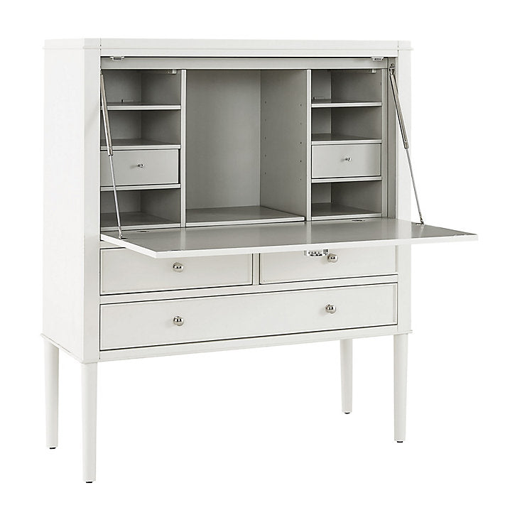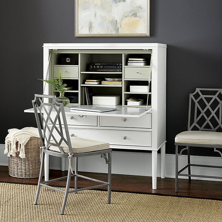 Consignment score! This beautiful white secretary by Ballard Designs did not fit in the consignors new home...their loss is your gain! See the 'Christine' secretary online for $2,309, our price less and in absolute like-new condition. Desk has a generous work surface that opens gently on safety-glide hinges. Center laptop bay has two adjustable, removable shelves and a built-in power strip with three plug-ins and two USB ports.