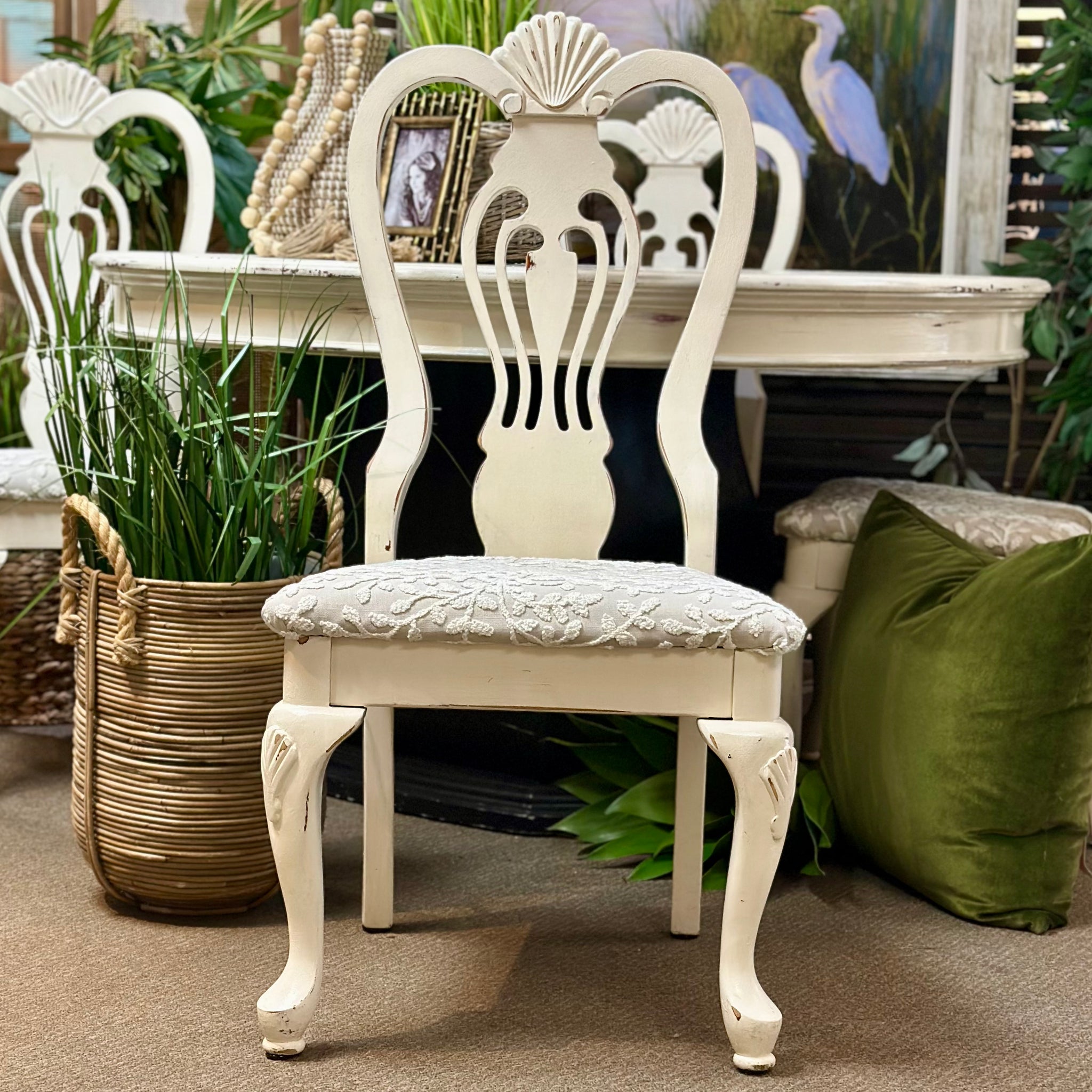 Enjoy meals with family and friends around this dining set. Features a round dining table with a black base and distressed white top. Includes four dining chairs with ivory textured leaf upholstered seats and a white distressed finish. In good condition with some marks to finish.