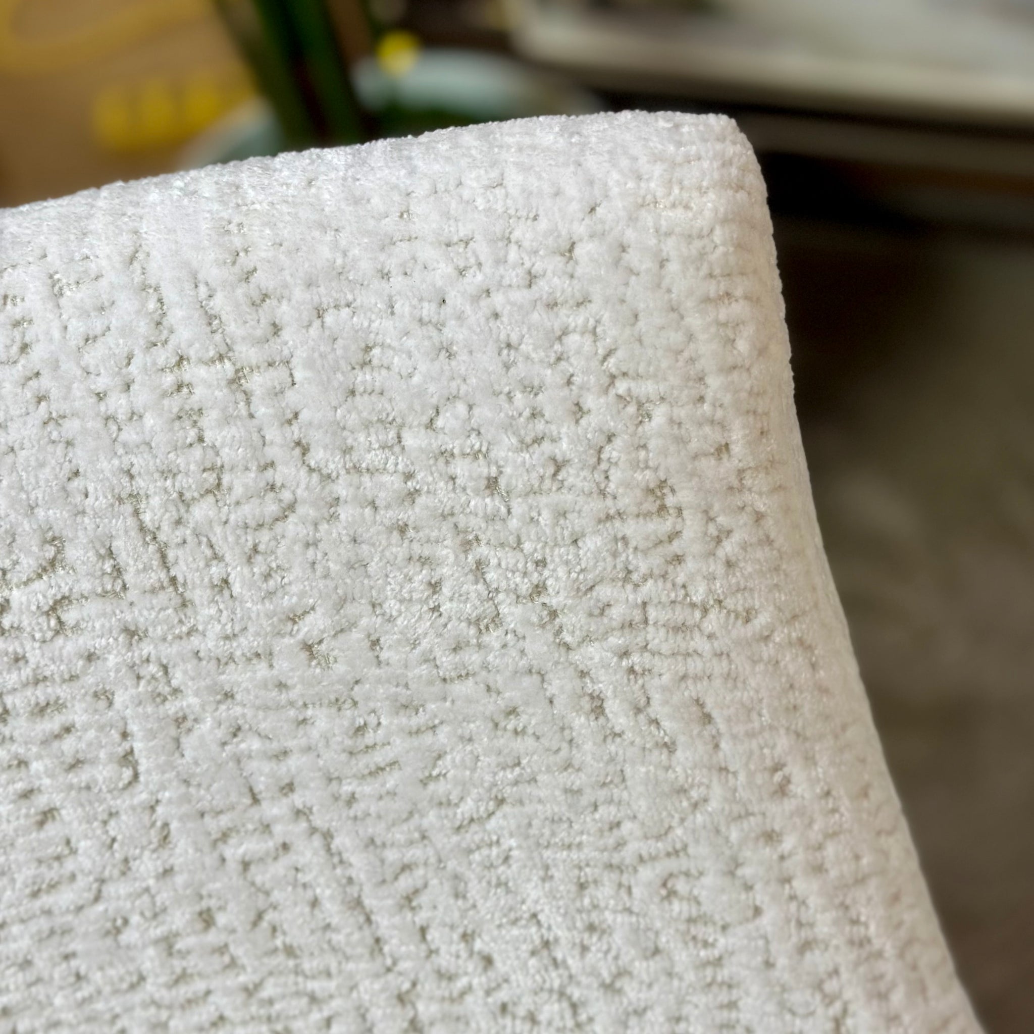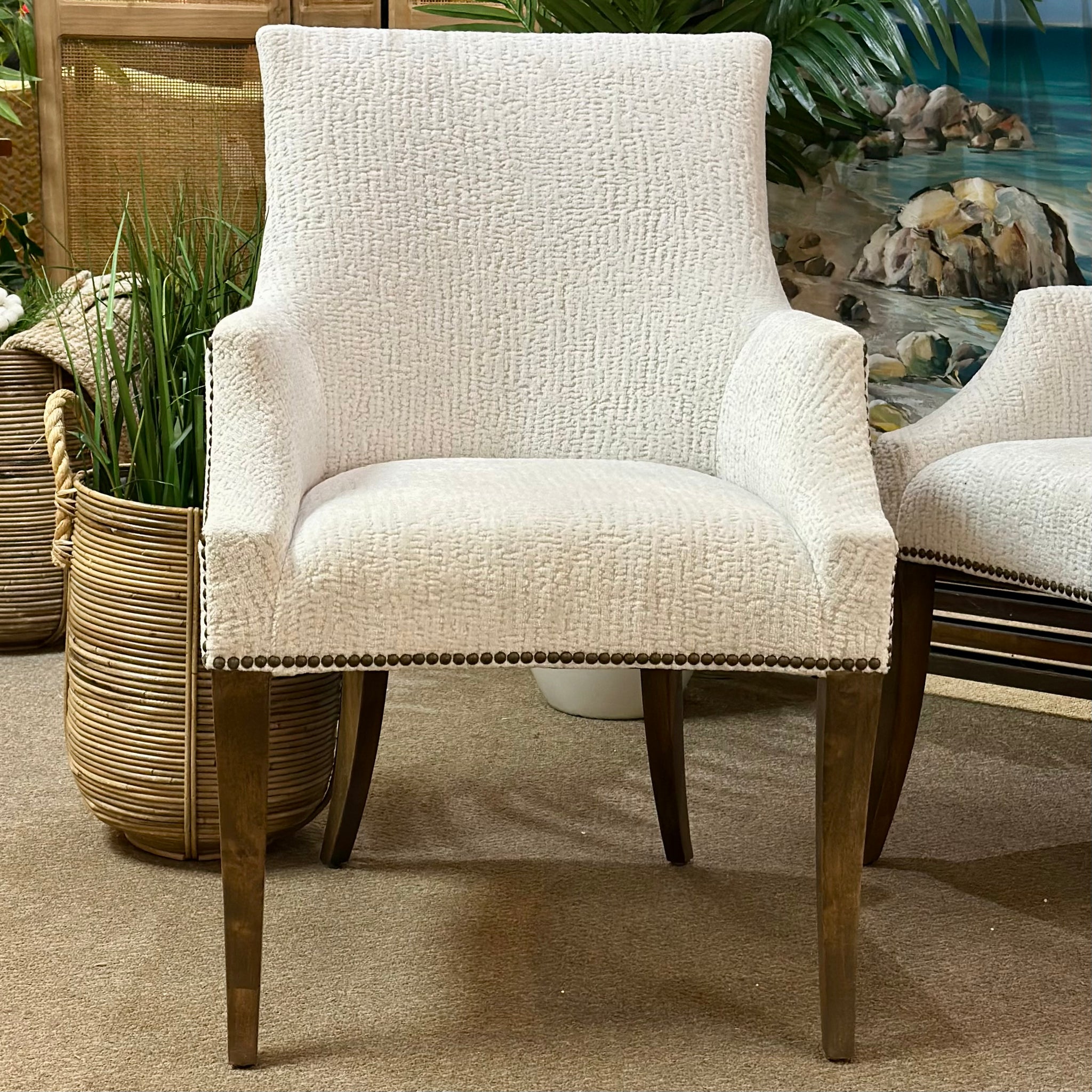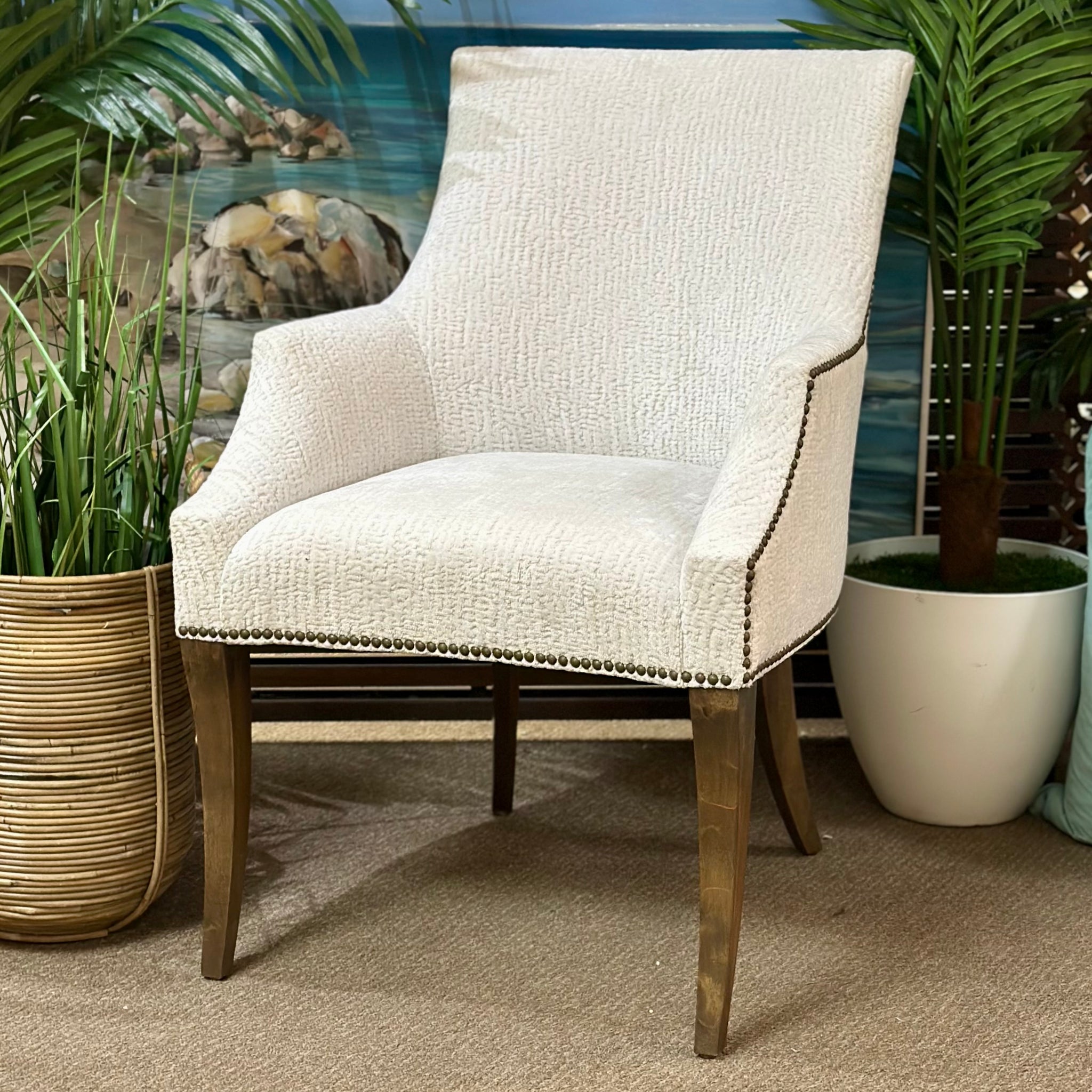 Elegant dining chair from quality manufacturer Berndardt. The 'Keely' features a wing back frame with curved legs in a taupe brushed finish. Chic textured white fabric and a nailhead trim adds to the sophistication. On consignment and in excellent condition. Retails $1,400, our price less!