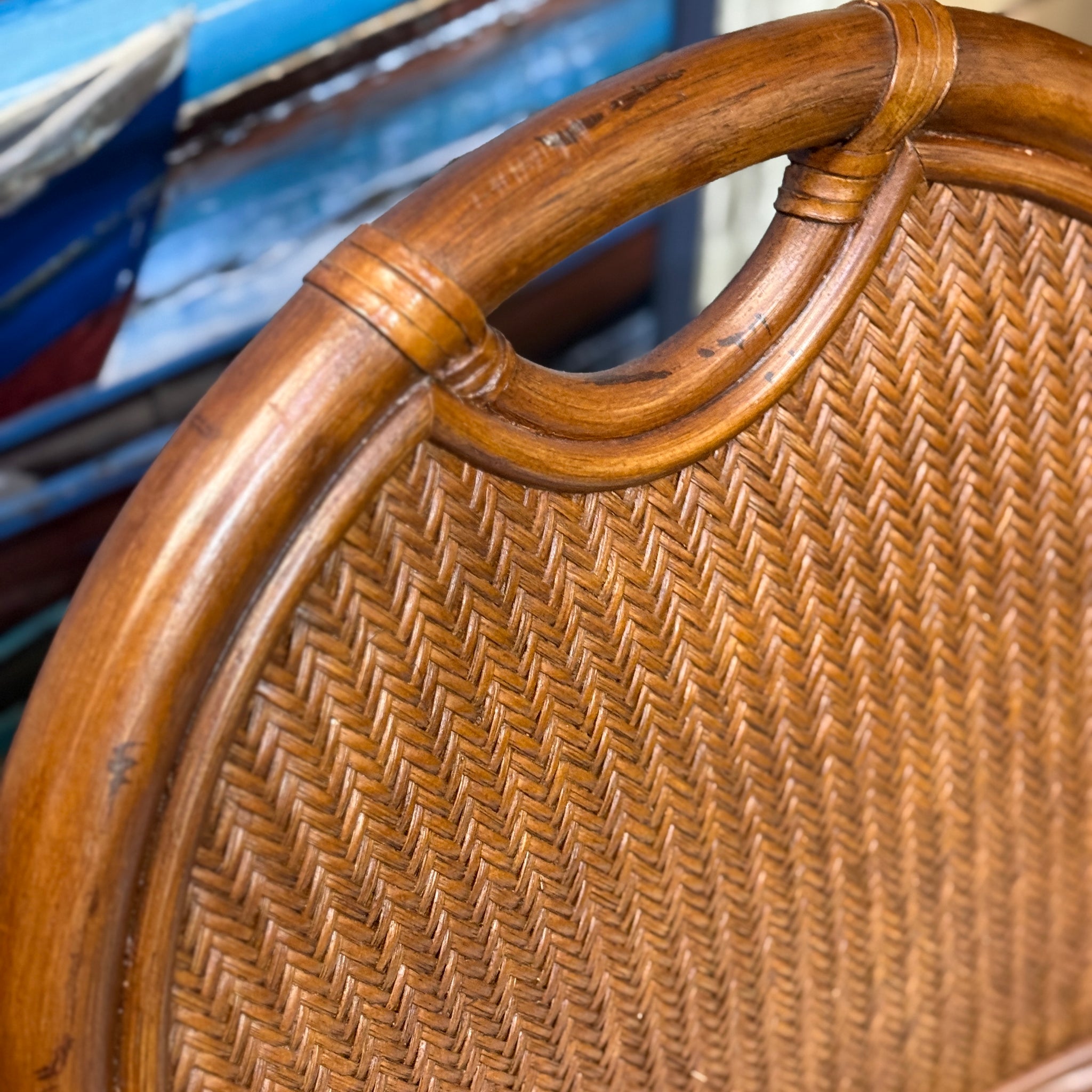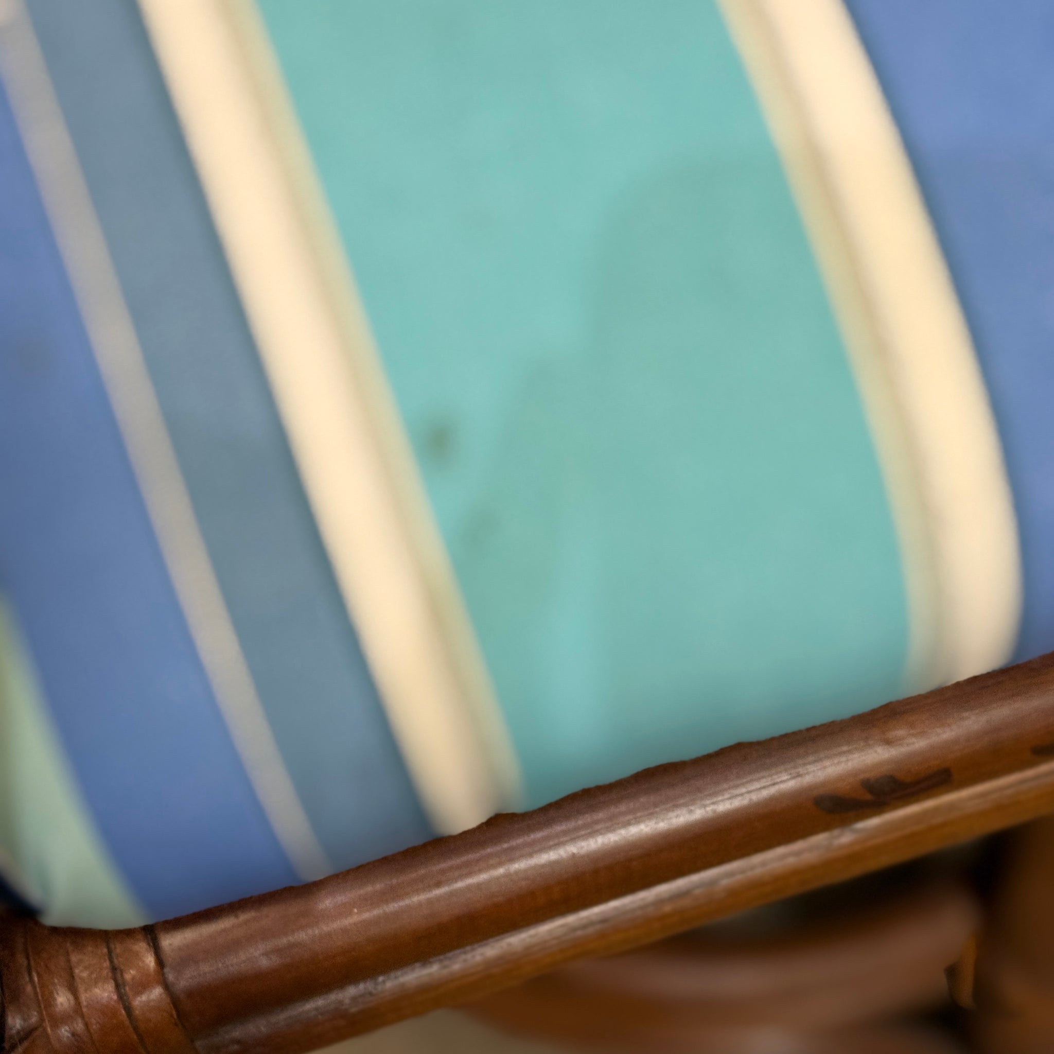 Coastal style counter stool in a dark rattan frame and a blue striped seat. On consignment with minor fabric staining. and in good condition.