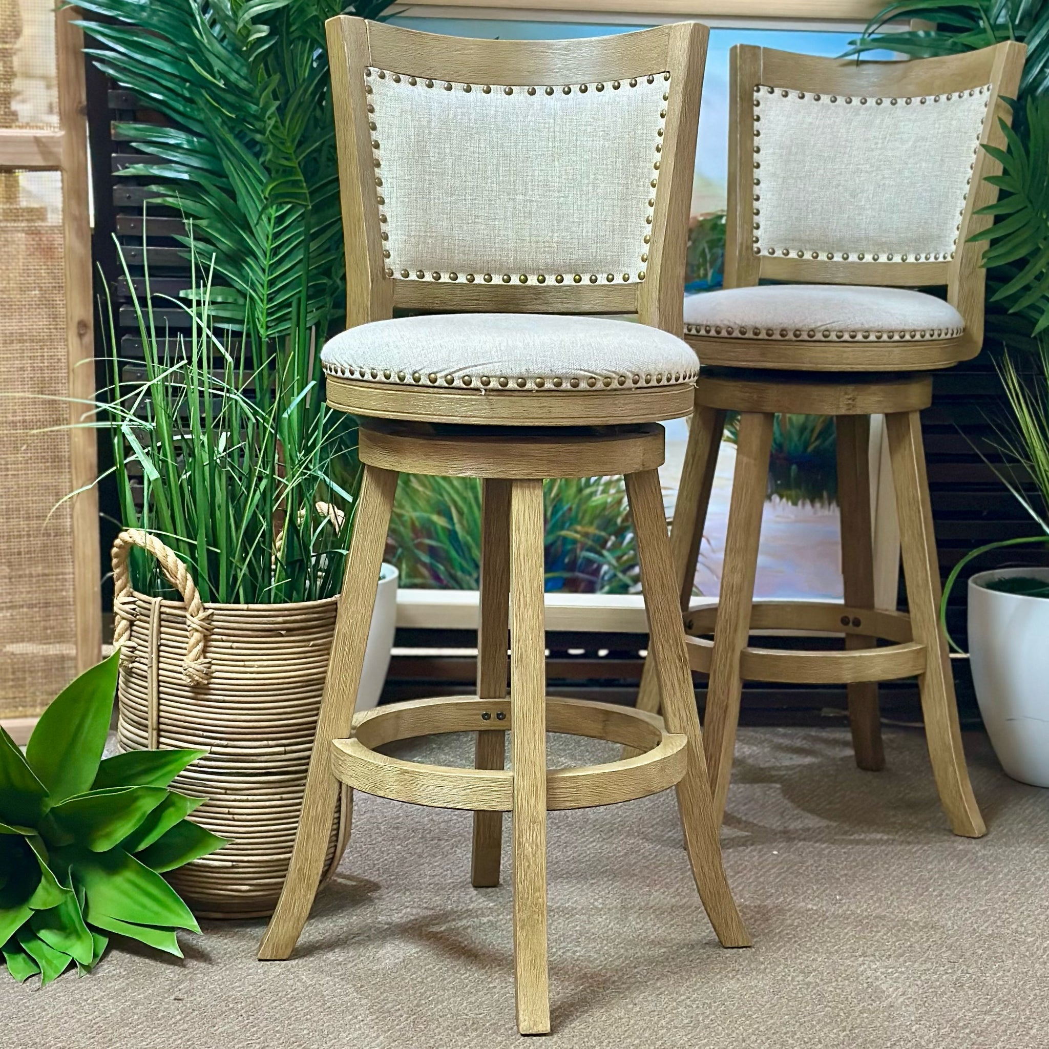 Transitional style barstools in a taupe fabric and a driftwood tone frame. On consignment and in great condition!