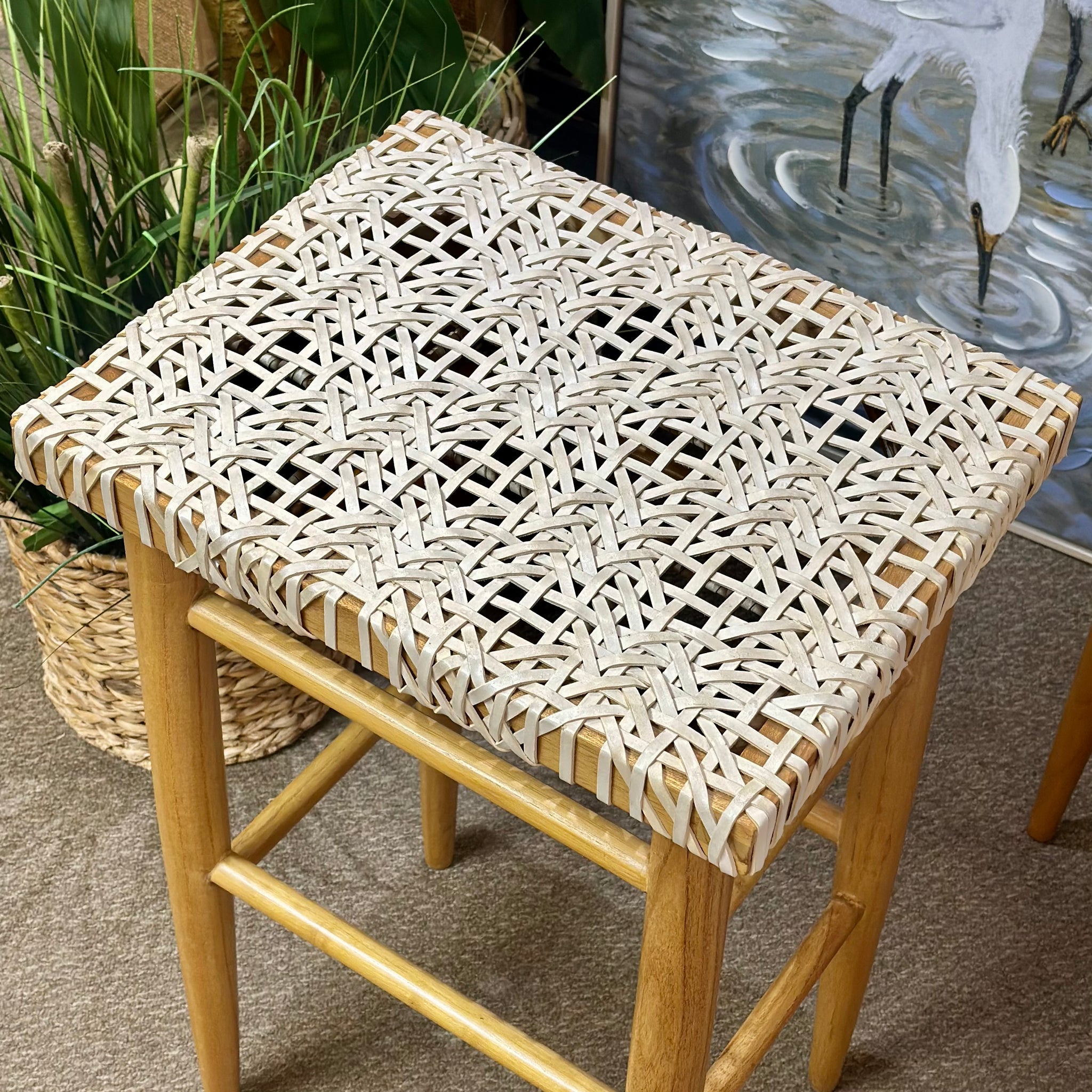 Organic modern style barstools from Safavieh. The 'Kaleo' features a woven white cowhide leather seat and a teak wood base. On consignment and in great condition. Retails for $550+, our price less!