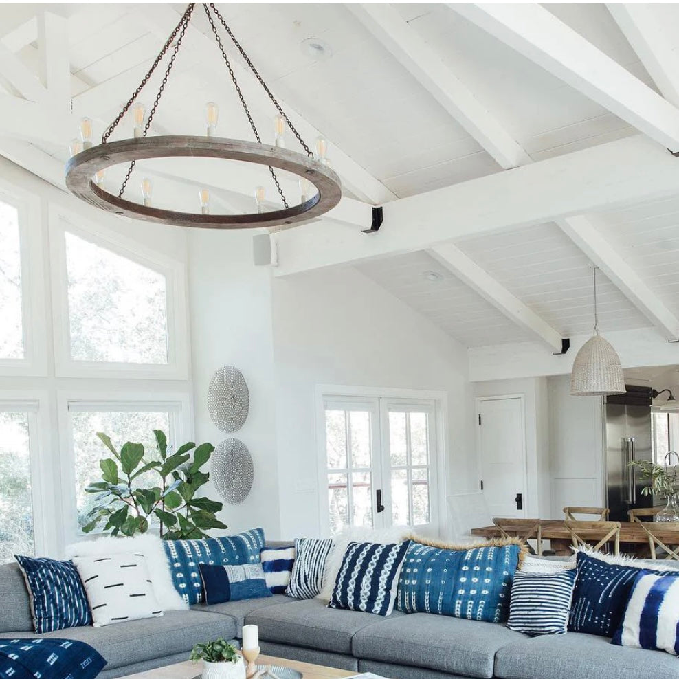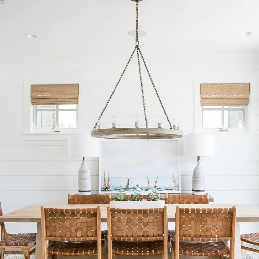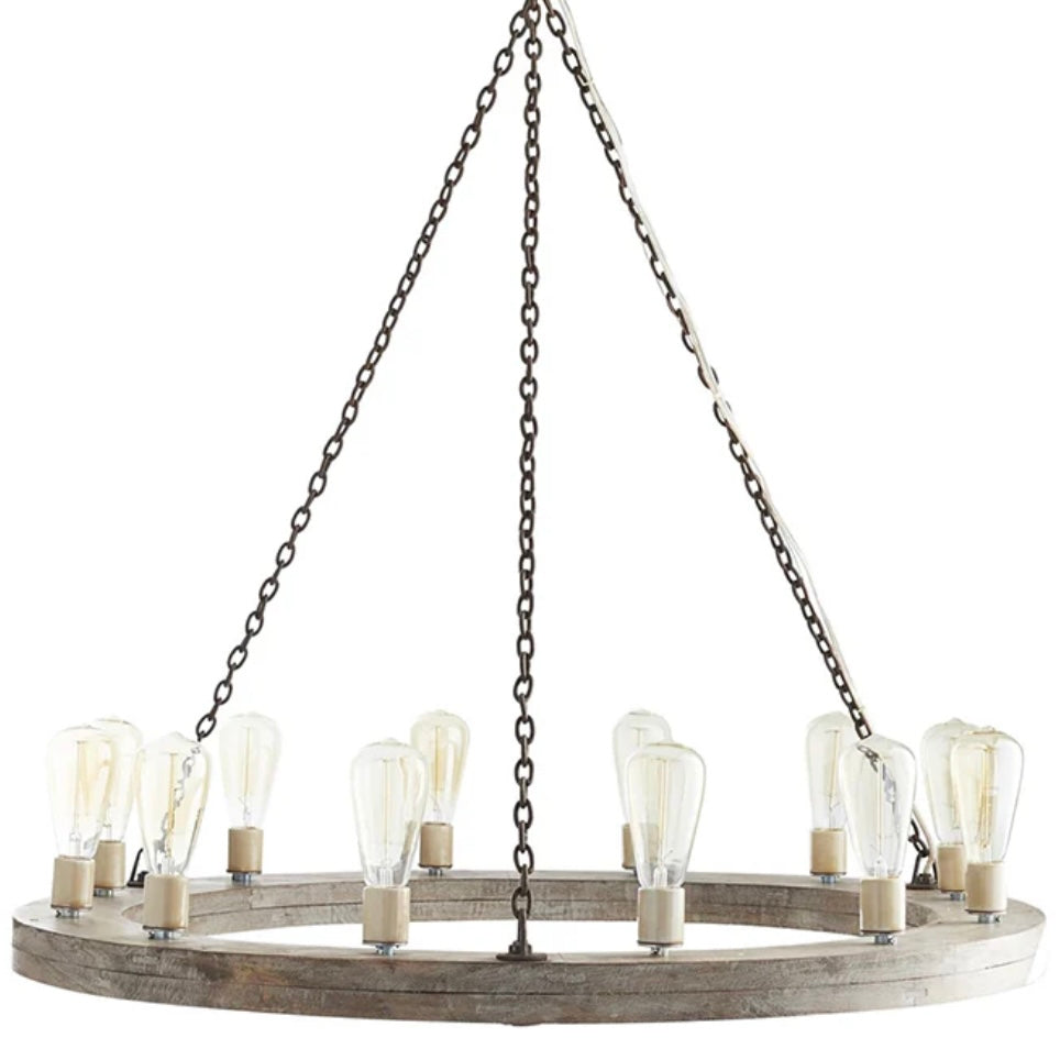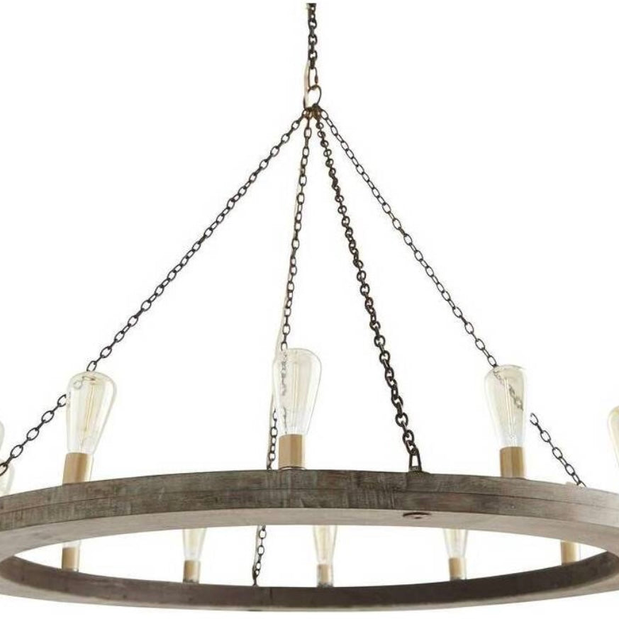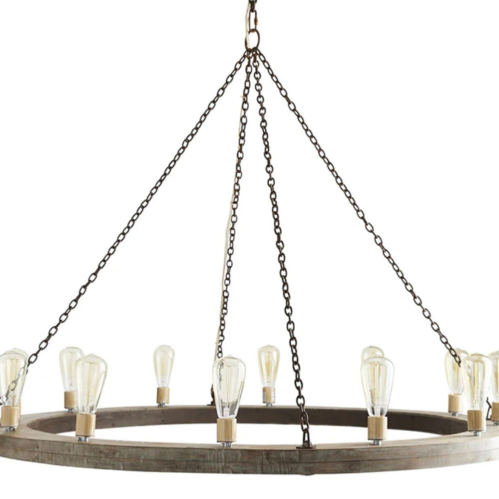 Add elegance to your space with this large chandelier by Arteriors. Features a wood ring in a grey finish, 12 lights, and a aged look chain. Retails for $2800+, our price less!