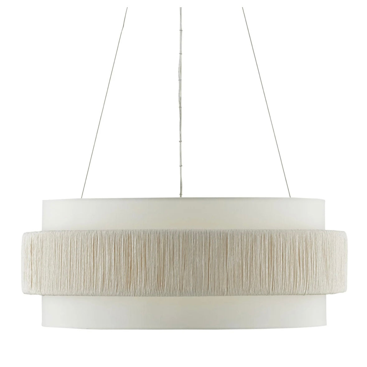 Elevate your space with this gorgeous chandelier by Currey and Company. Features a ivory linen shade with white twine panel wrapped around shade. In on consignment but came in excellent condition. Retails for $2,000+, our price less!