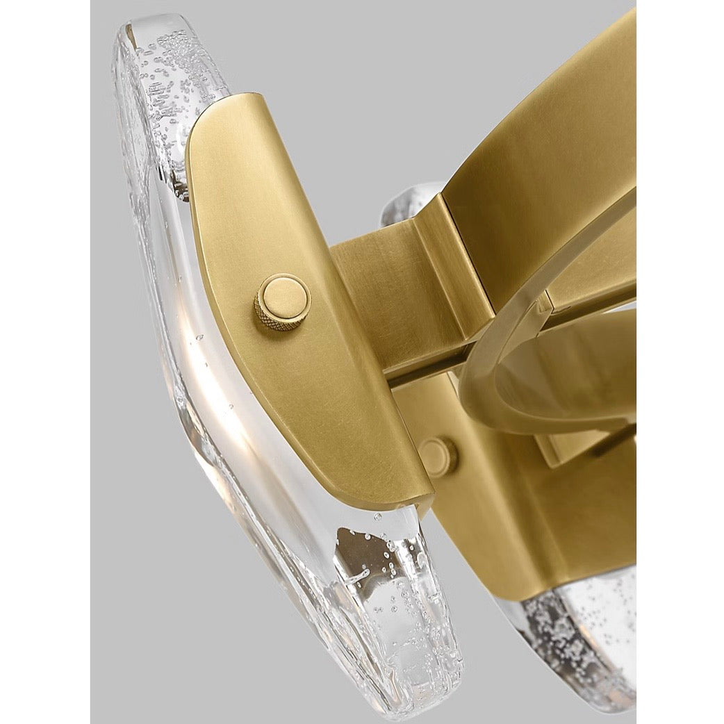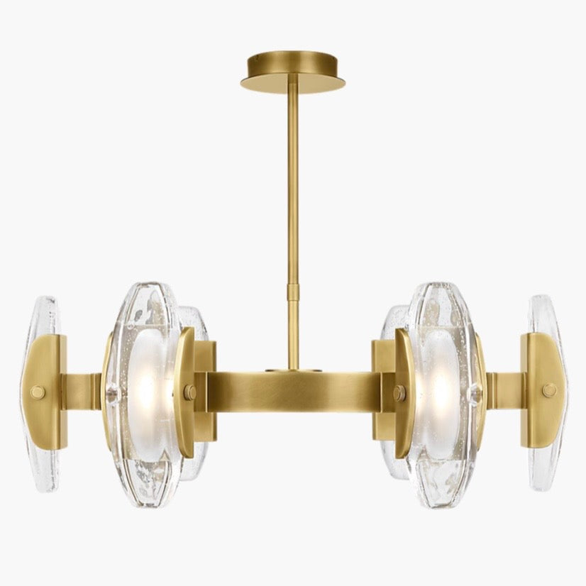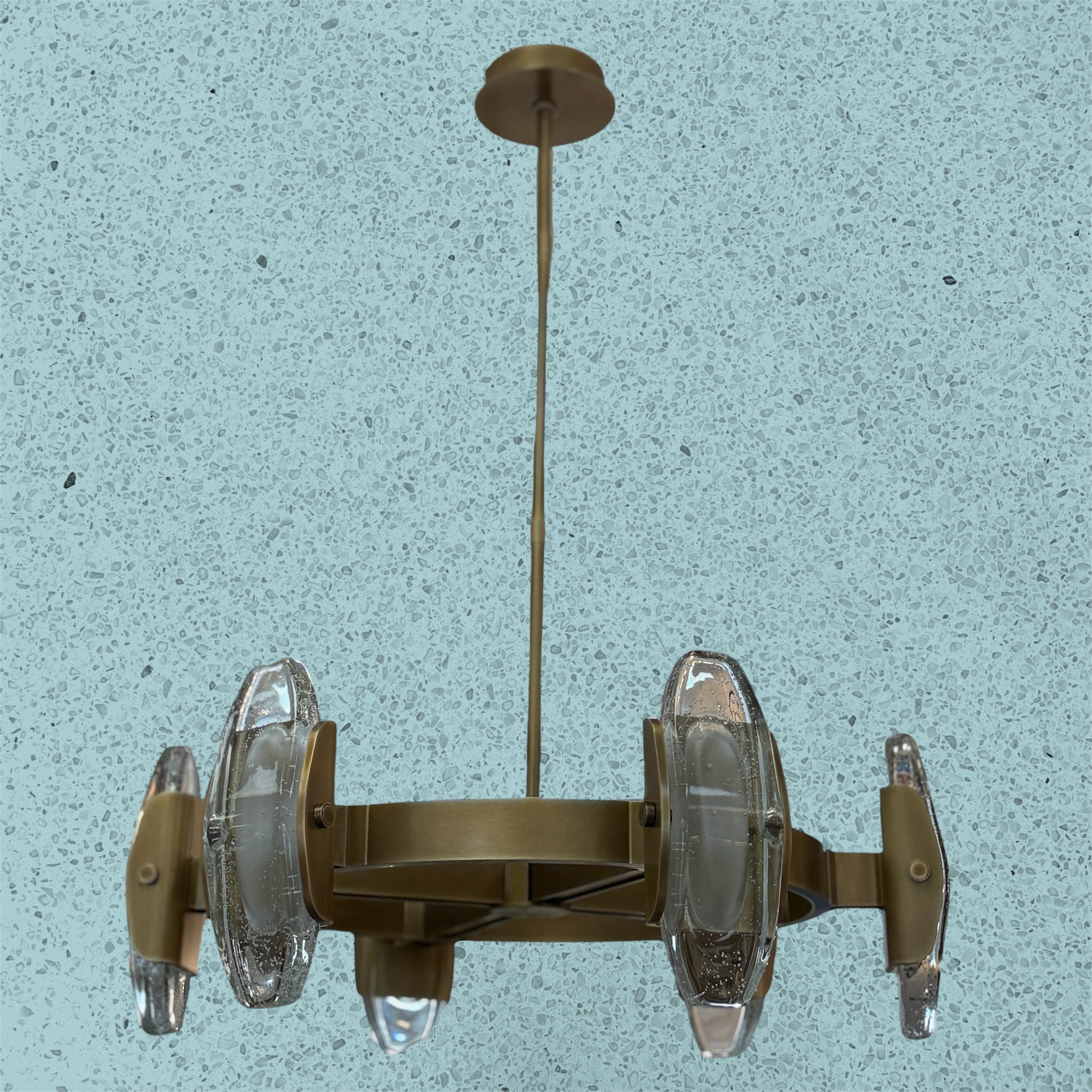 The Wythe Large Chandelier presents a strong impression with smooth diffusing light in its most honest and simplest form. It is created from the marriage of industrial elements and the raw natural expression of glass. The cylindrical brass structure holds cast glass that is lit to highlight the natural fissures and imperfections from the casting process. Came in on consignment brand new, retails for $3,500, our price less!