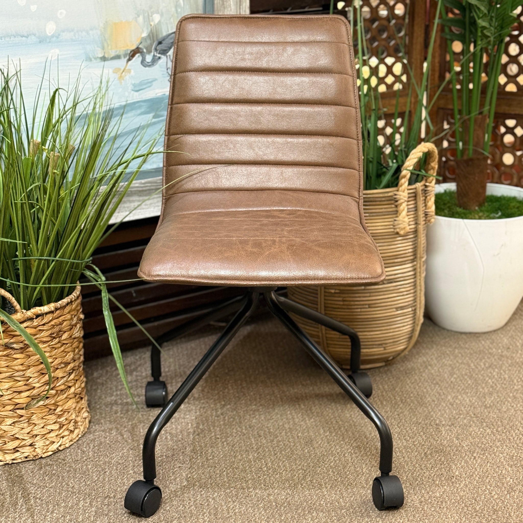 Add this handsome office chair to your office. Features horizontal channeling, faux leather, and rolling legs. Brand new!