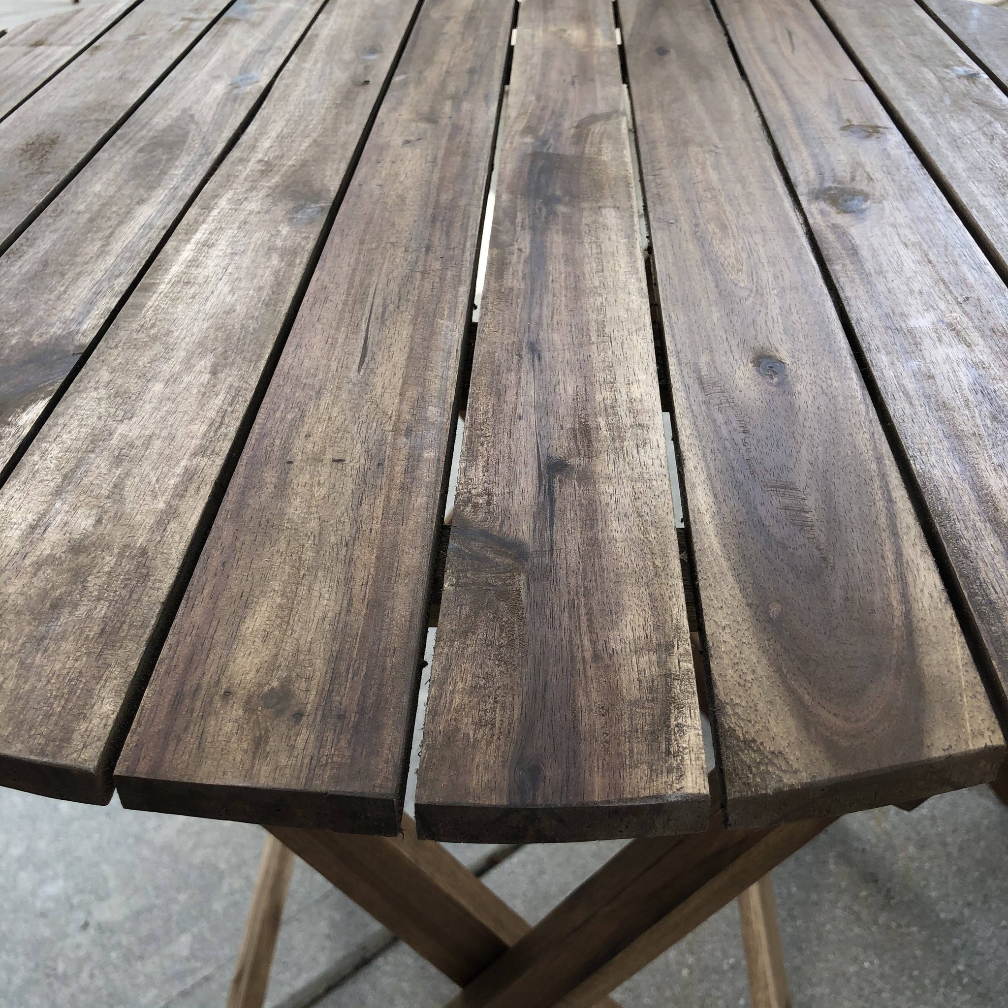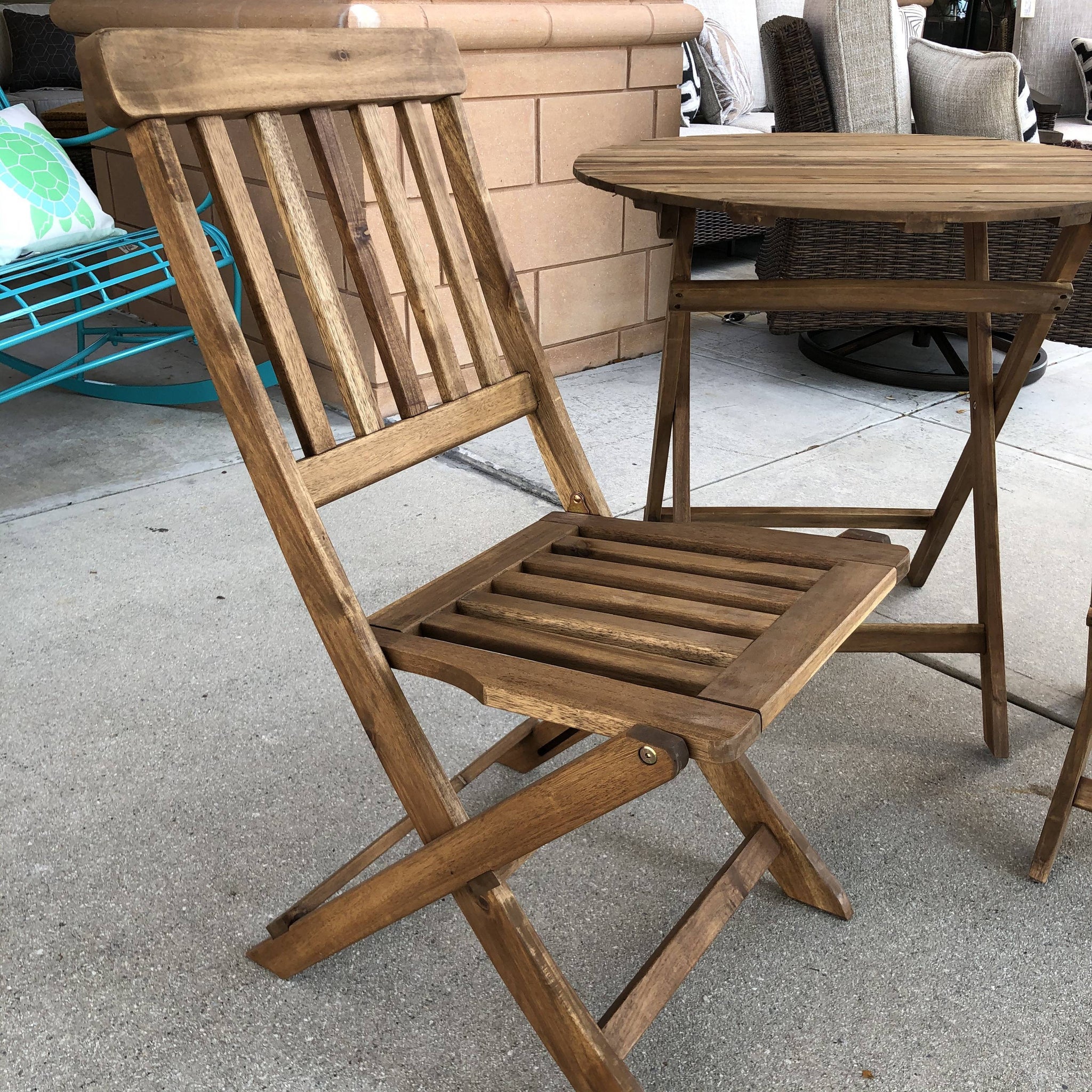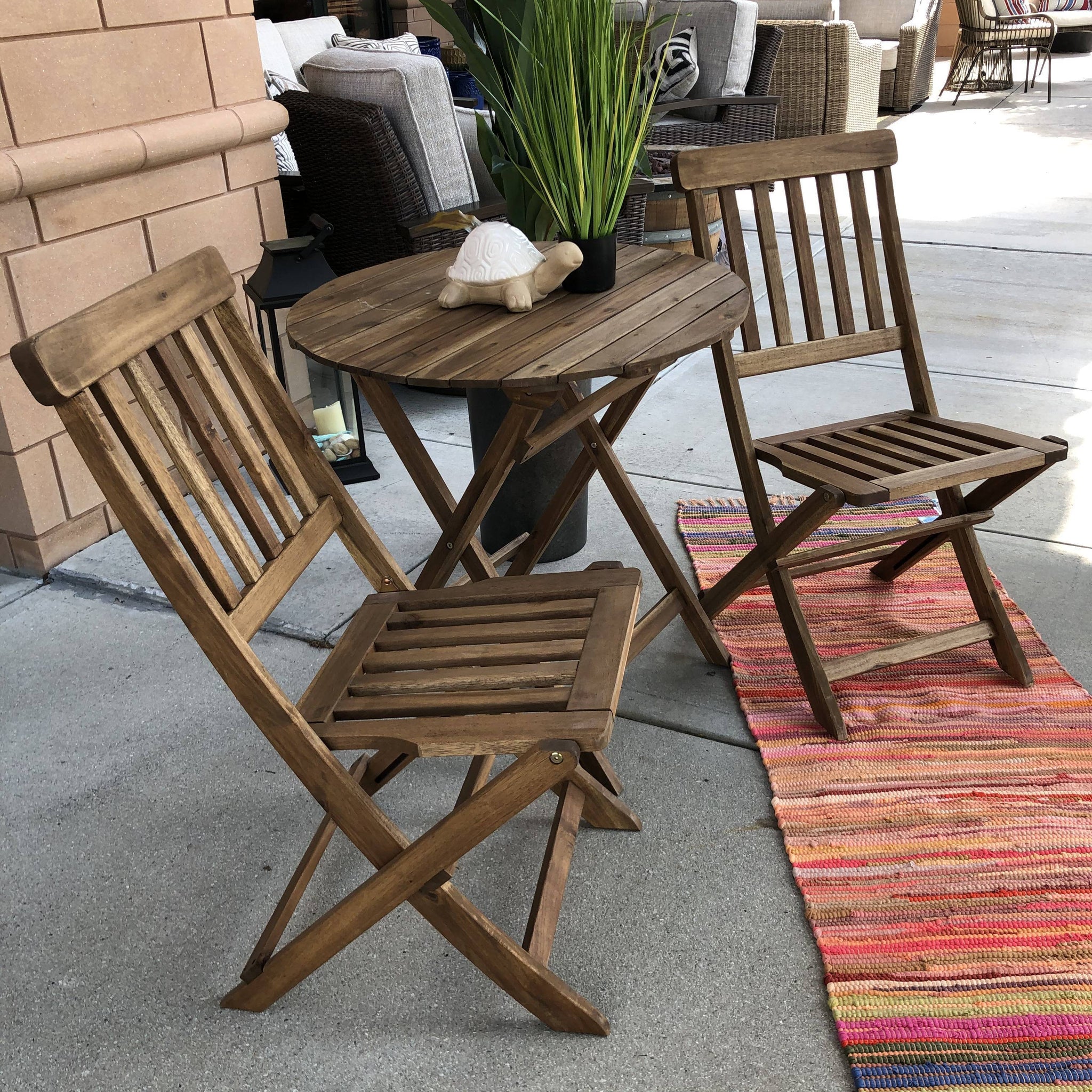This 3PC bistro set is perfect for small patios and outdoor areas and is both stylish and durable! Set includes two chairs and one round table, that easily fold for simple storage. Crafted from acacia wood with a teak finsih.