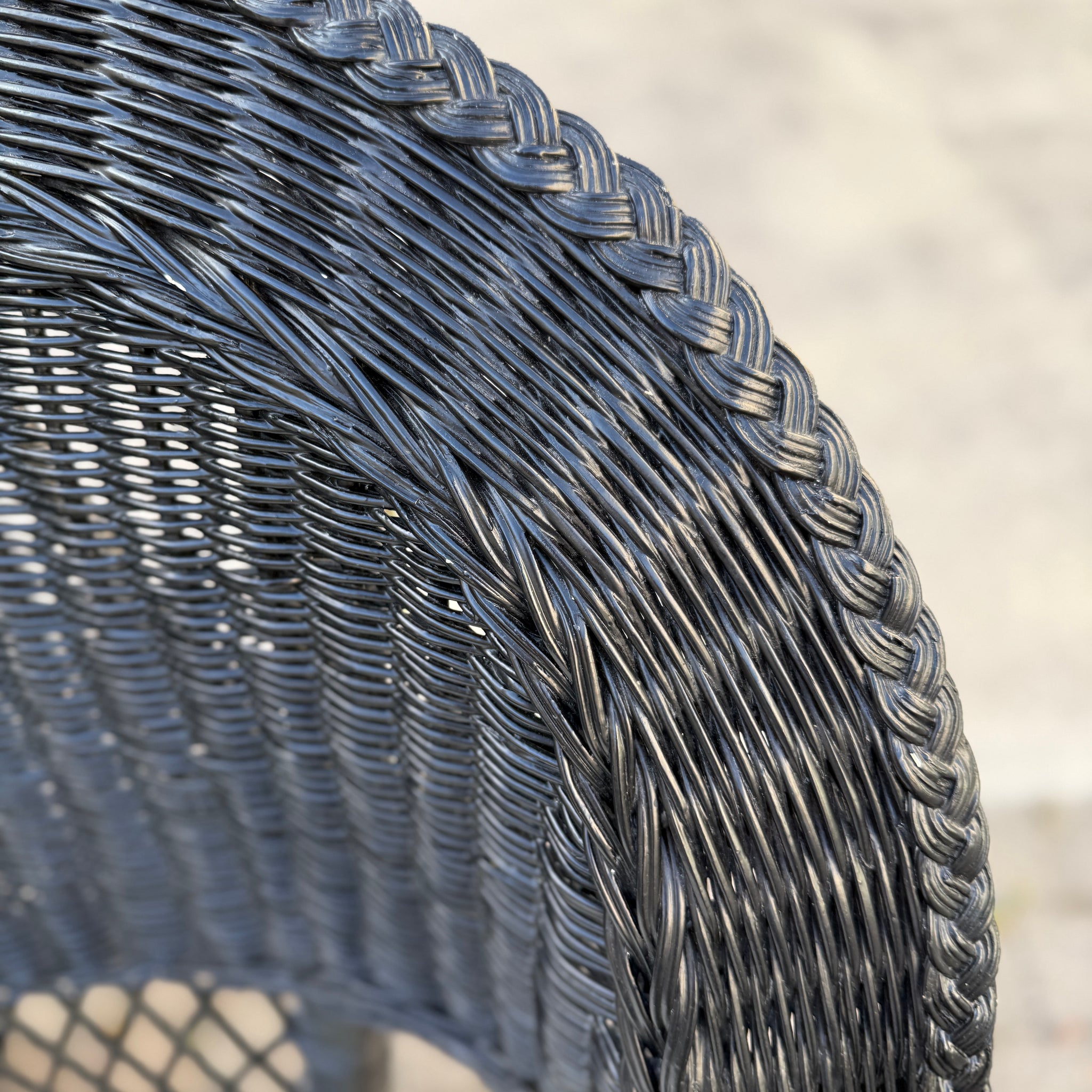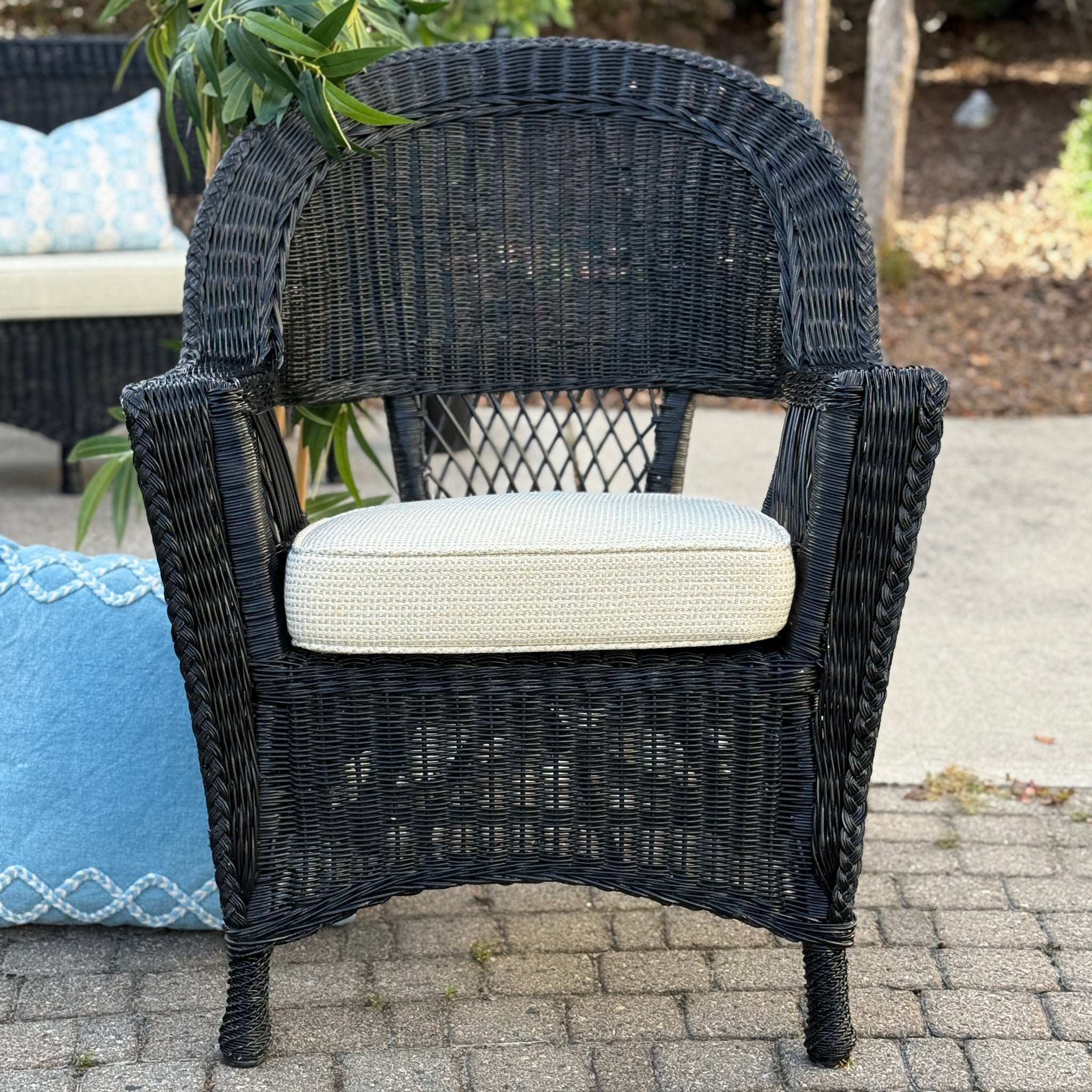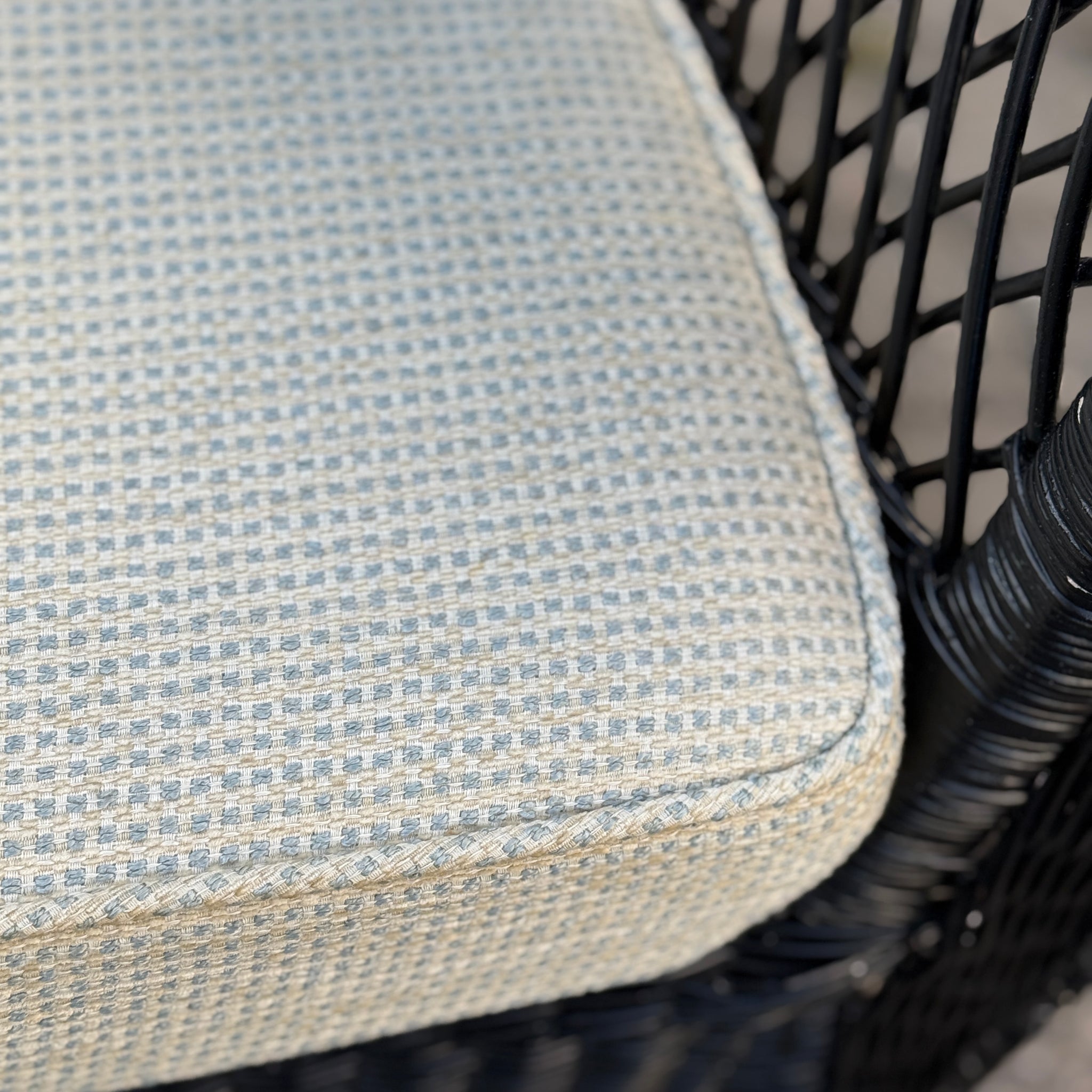Lovely three piece outdoor seating set just in on consignment and in great condition! Set includes a resin wicker loveseat and two coordinating chairs with mist upholstered cushions. Frames are built for outdoor use and cushions should remain covered.